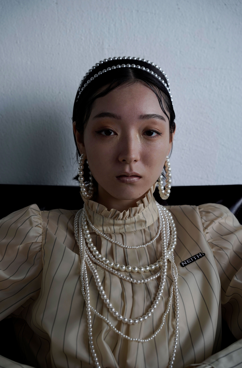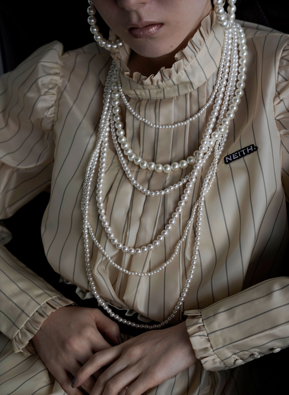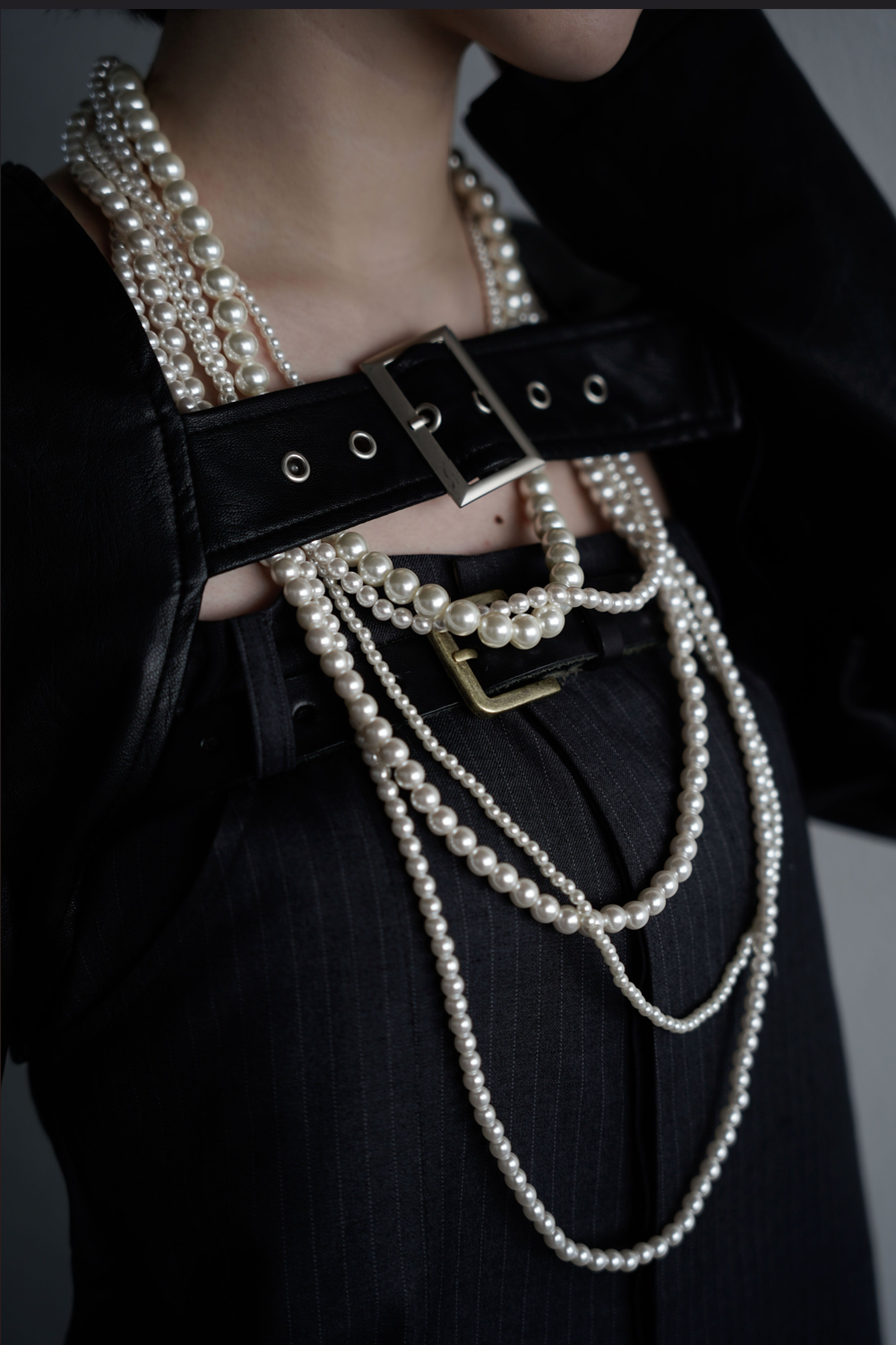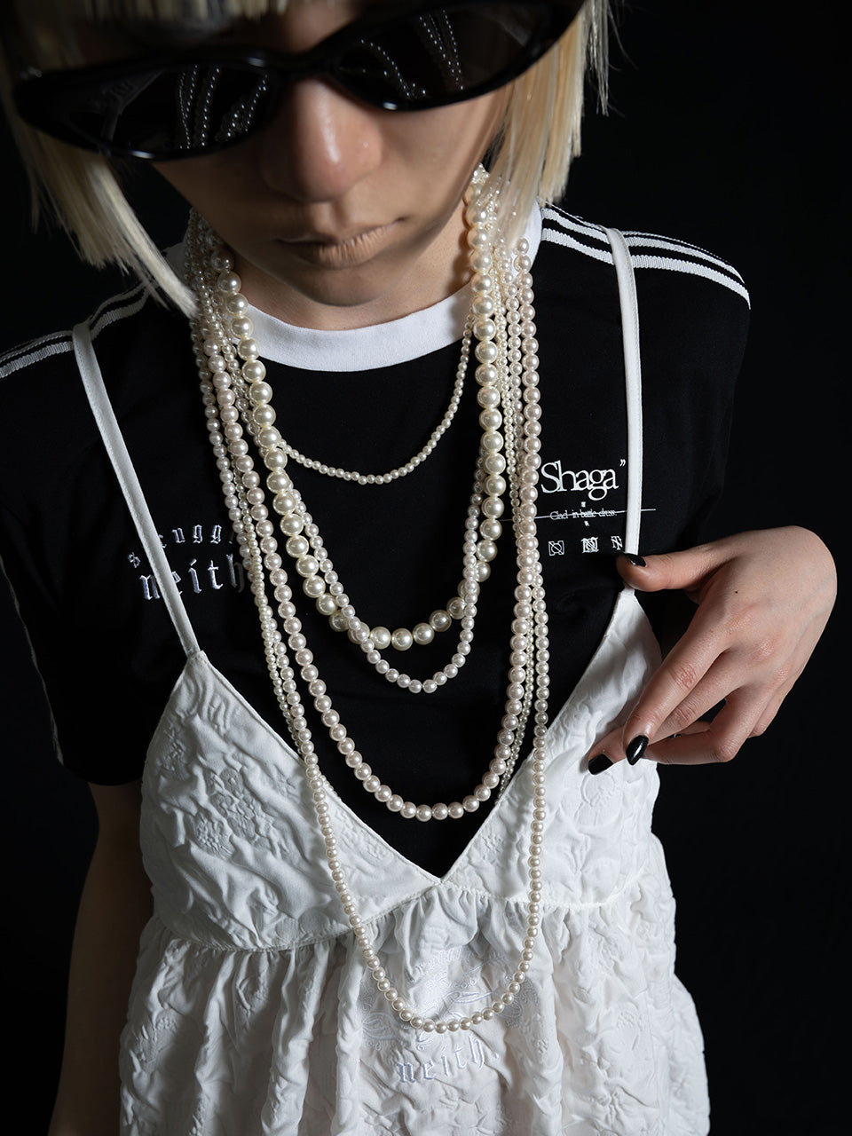 4 types of imitation pearls of different sizes are finished in 6 rows with random lengths. This necklace has an eye-catching balance between the elegance of pearls and the bold design.