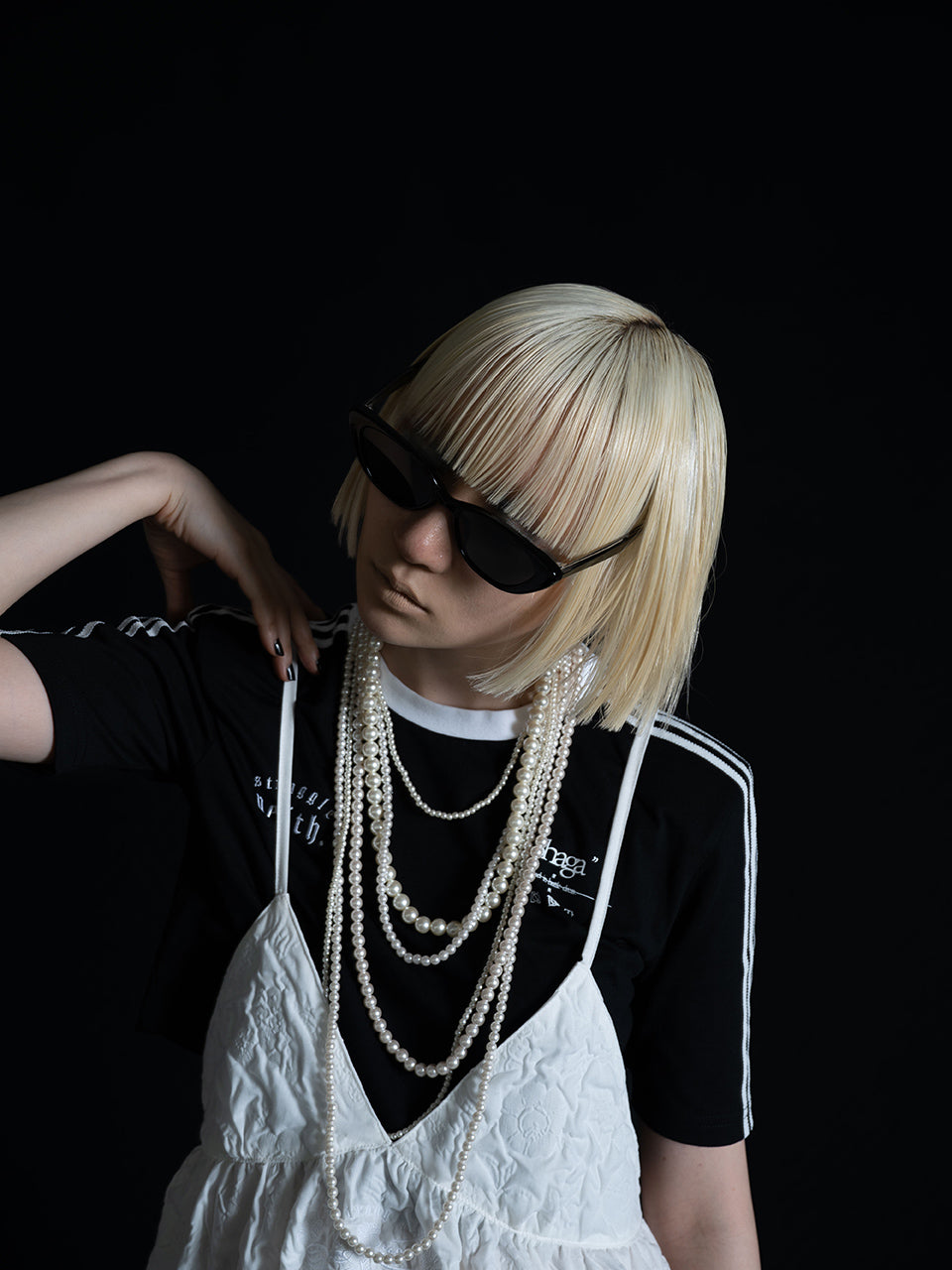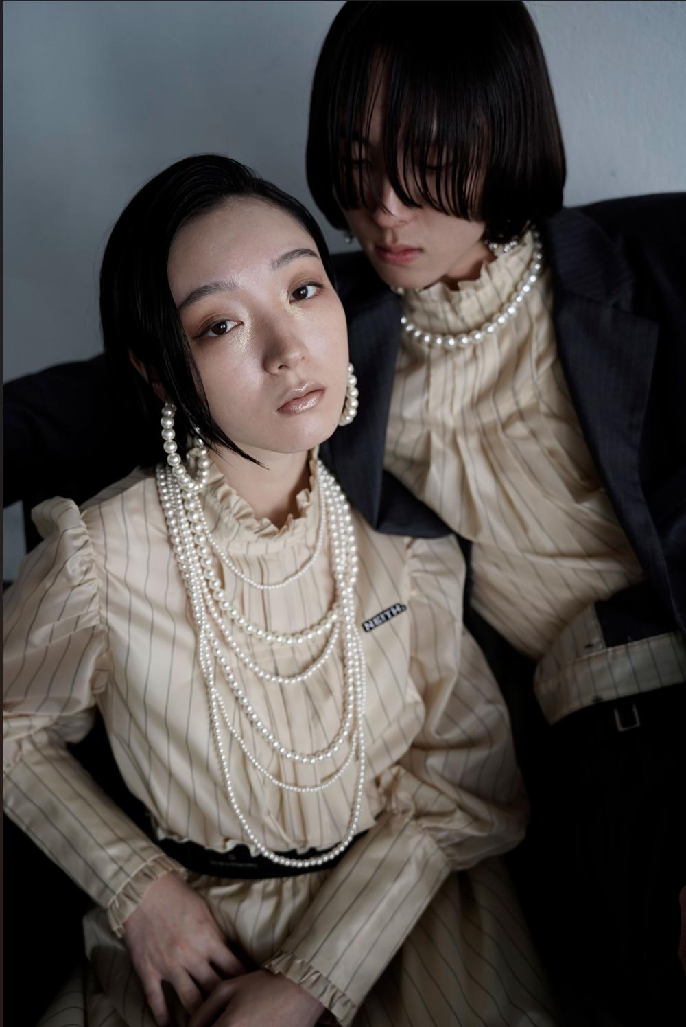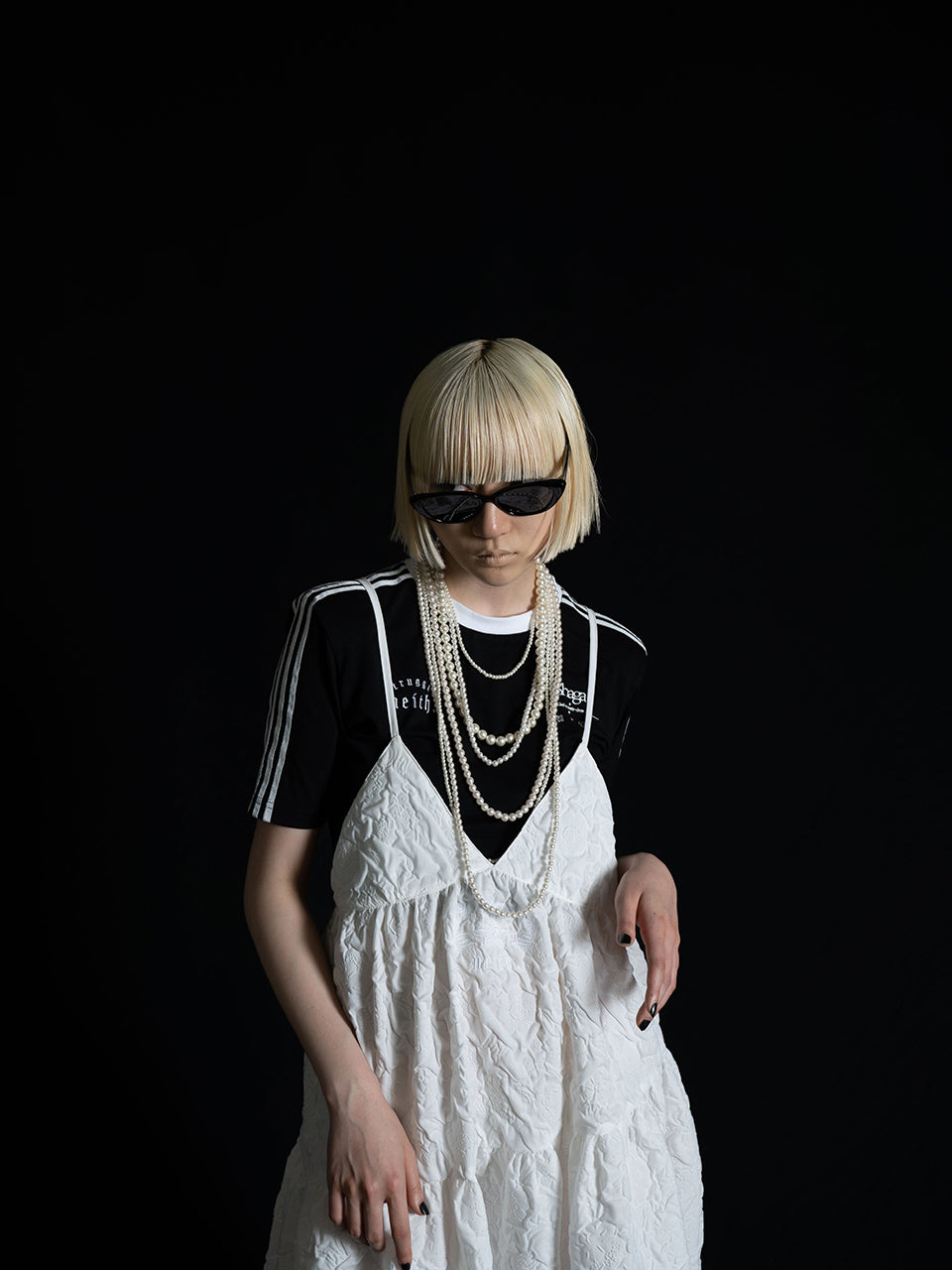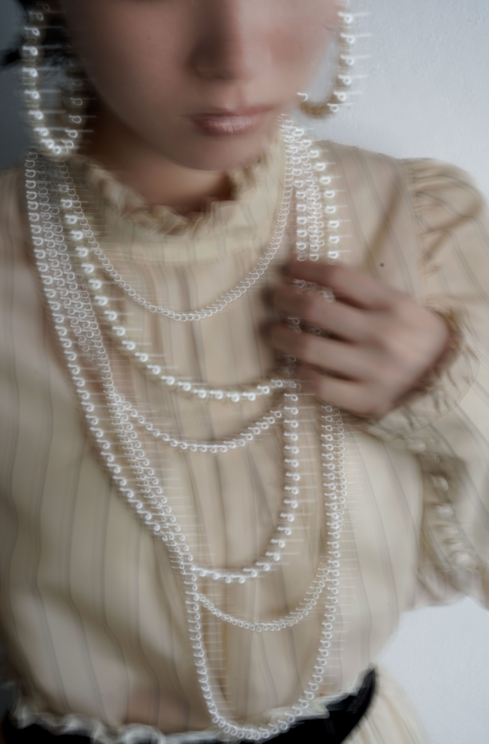 4 types of imitation pearls of different sizes are finished in 6 rows with random lengths. This necklace has an eye-catching balance between the elegance of pearls and the bold design.
