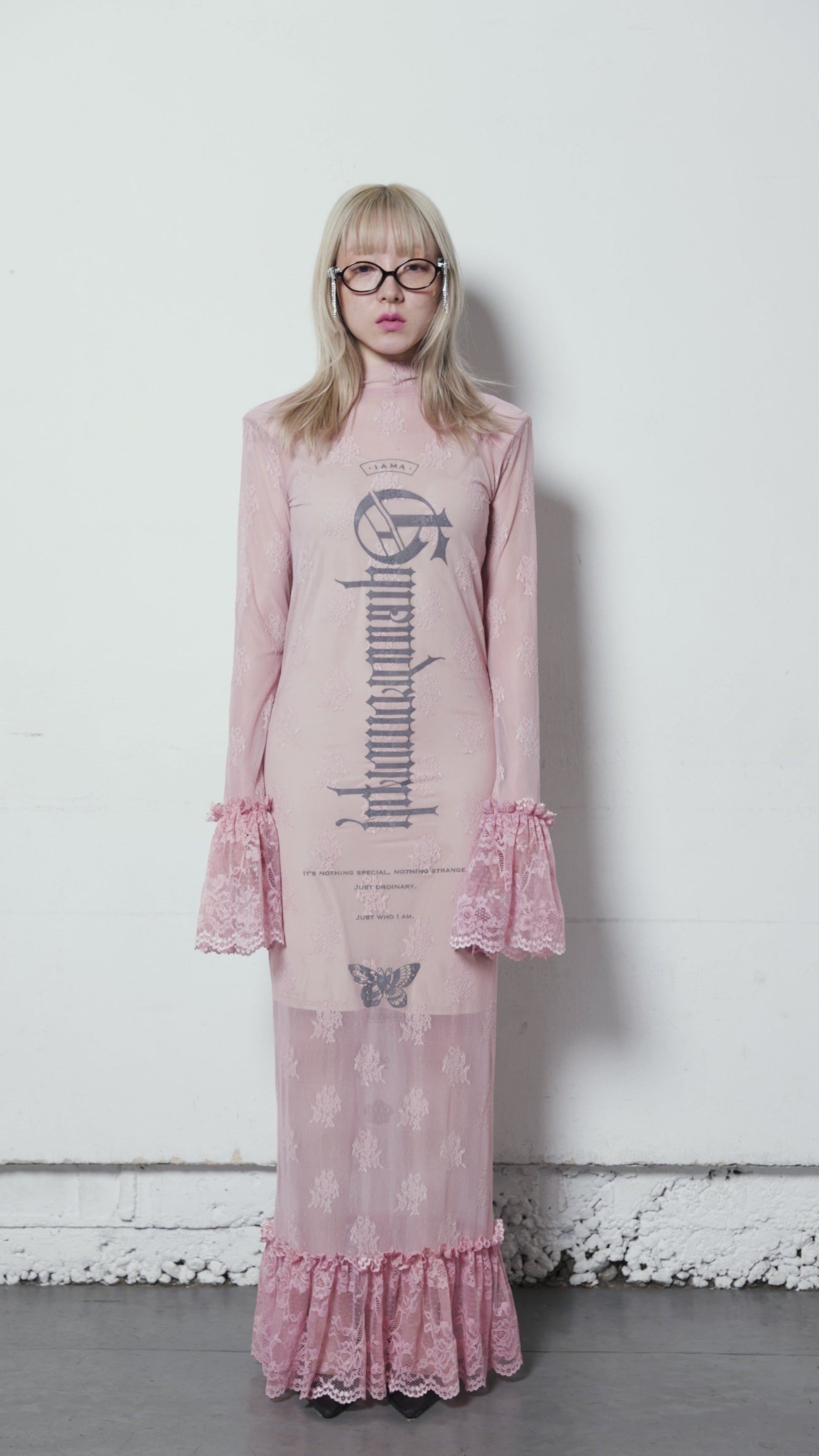 7th Collection"Androgyny"のテーマからイメージを広げたグラフィックが繊細なレース生地と絡み合います。前後どちらを前にしても着用可能。気分やコーディネートに合わせてお楽しみください。