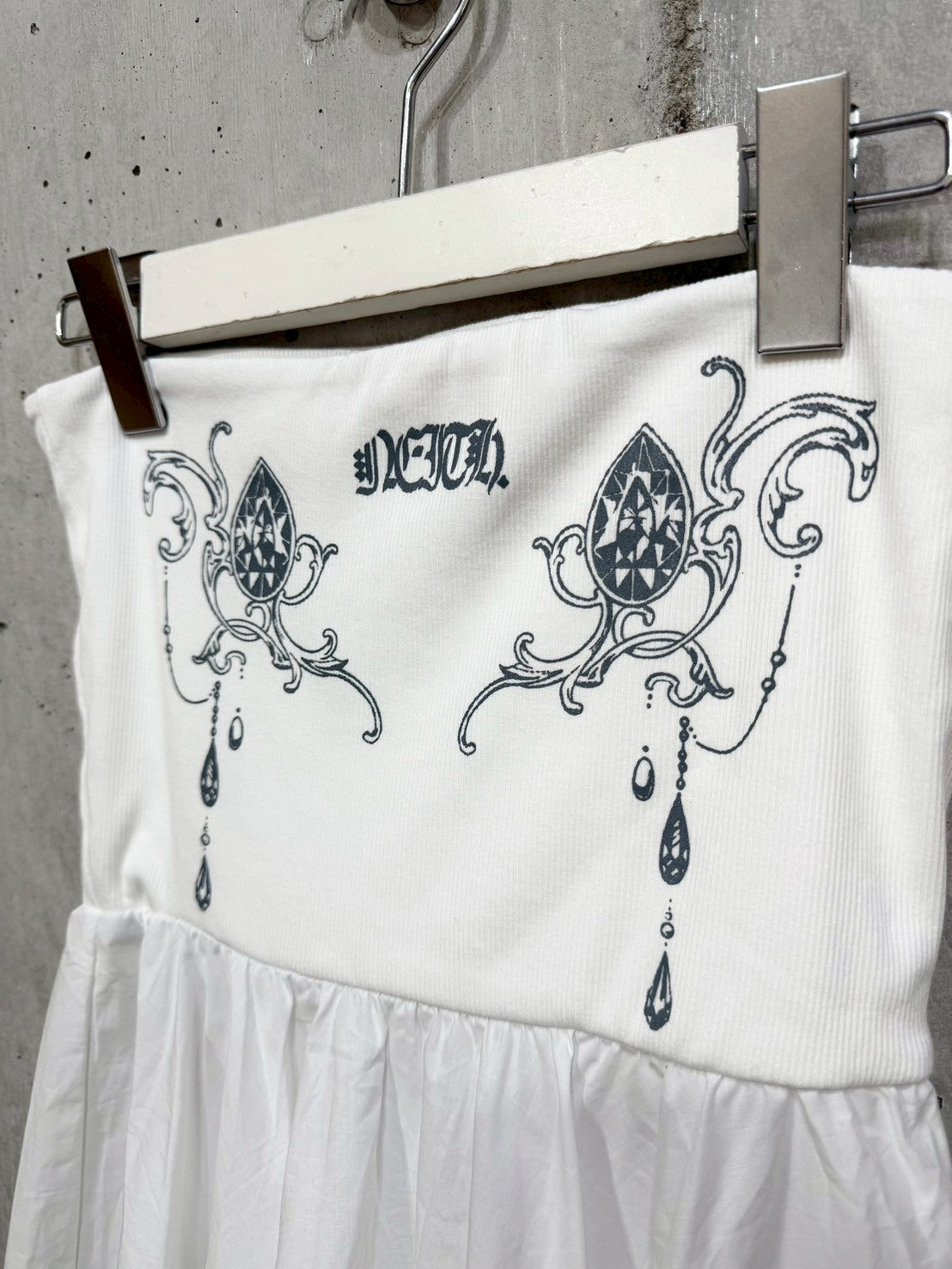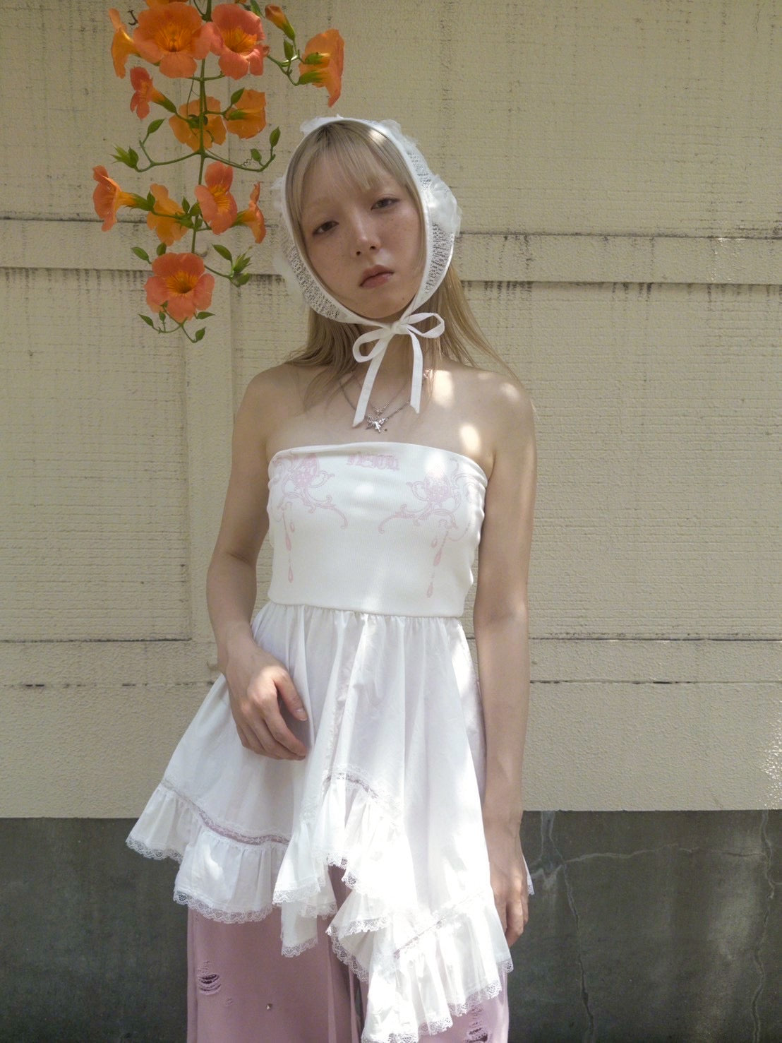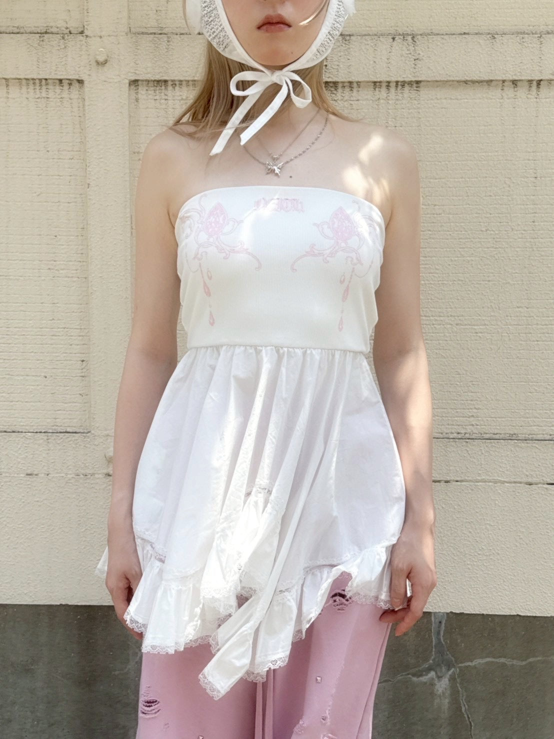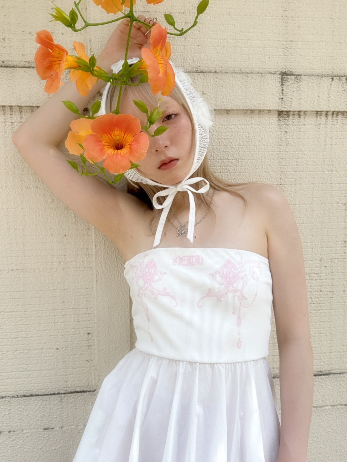 ヘルシーな着こなしで一枚でさらっと着ていただくのは勿論、レイヤードスタイルも楽しみやすいパッド無しタイプ。フィッシュテールのアシンメトリーデザインとneith.オリジナルプリントのバランス感が存在感を放ちます。ベースのキャミソールはストライプブルーと無地ホワイトの2色展開、プリント色はそれぞれぴったりの色をカスタムしました。