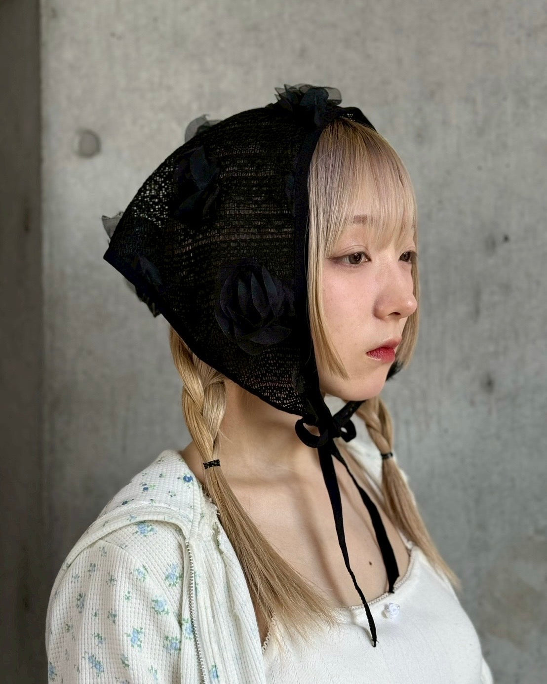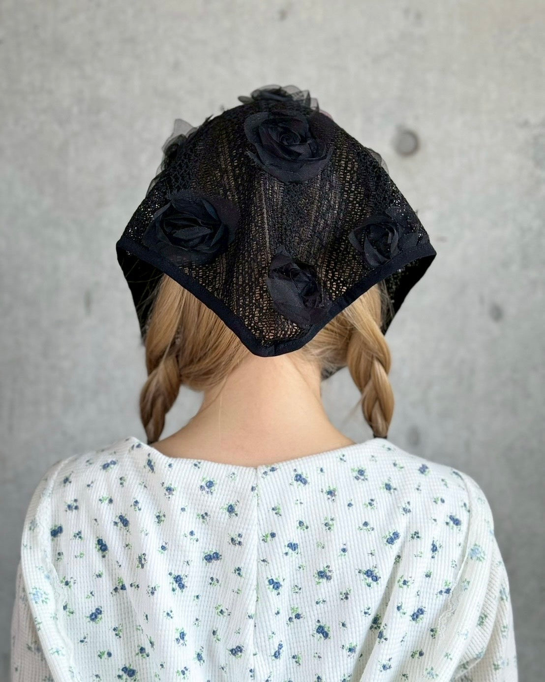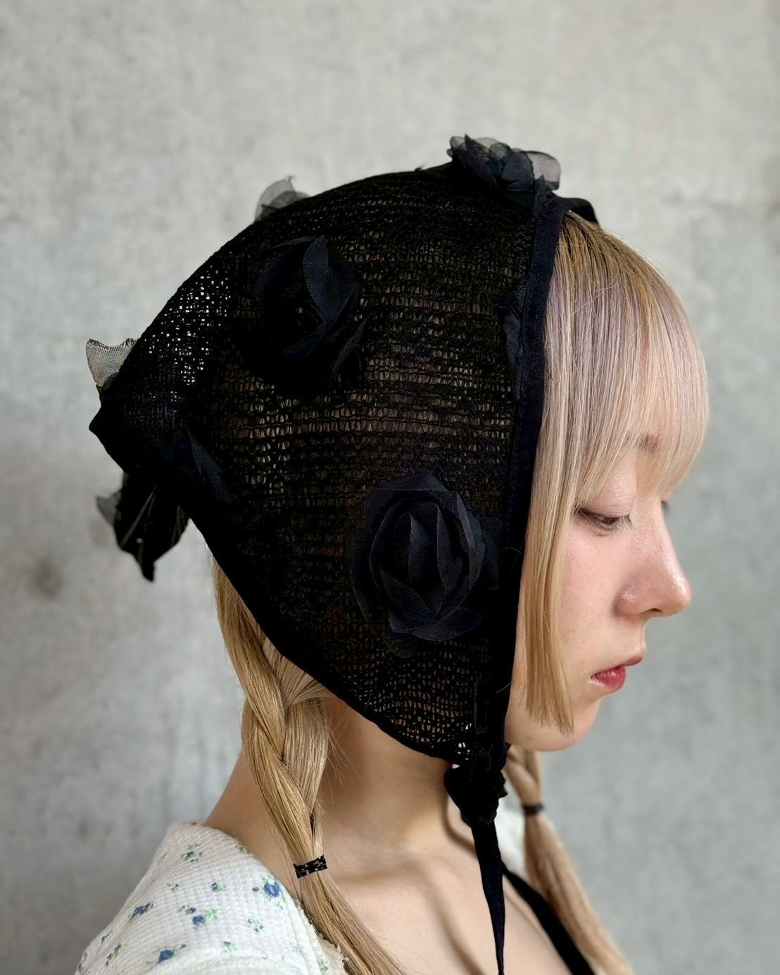 ざっくり編みのニット地にシフォンのお花の立体モチーフが可愛いバブーシュカ。