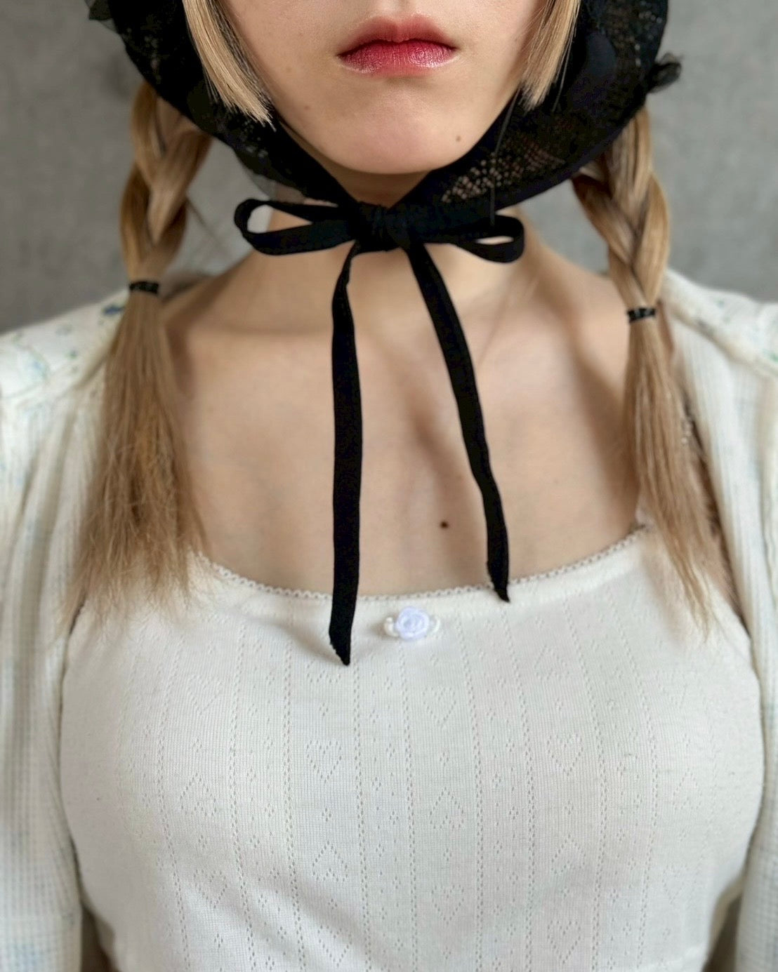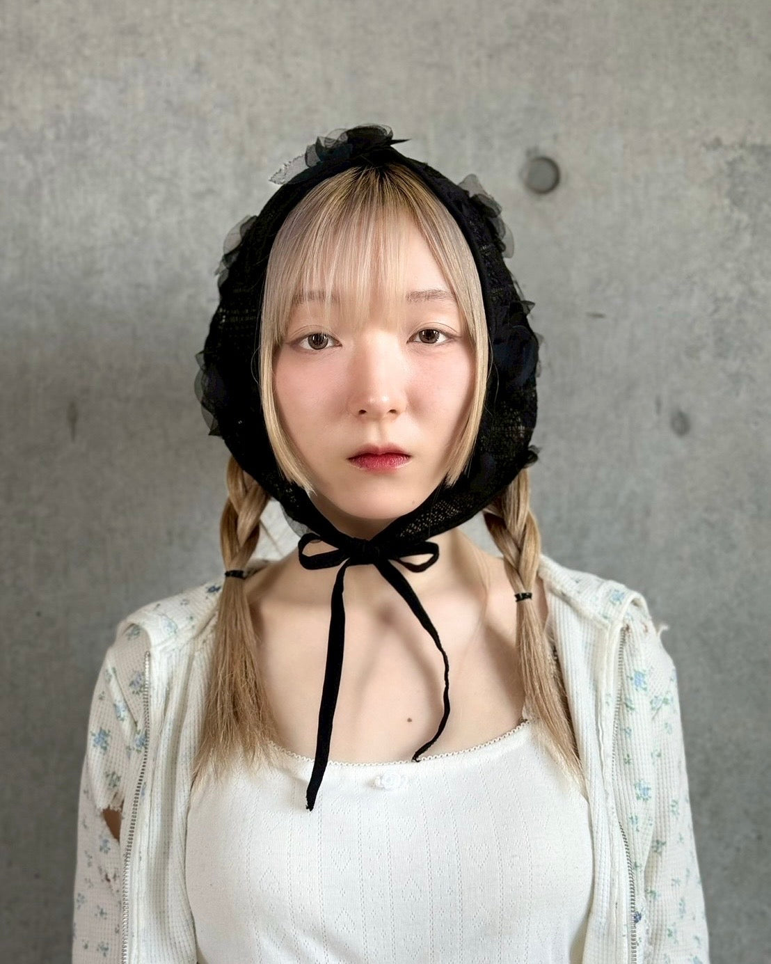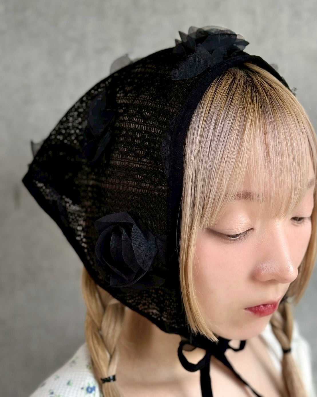 ざっくり編みのニット地にシフォンのお花の立体モチーフが可愛いバブーシュカ。