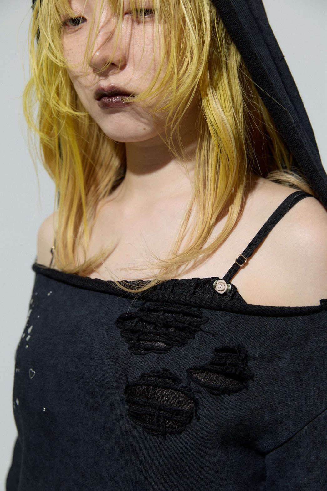 ・重厚感のあるオールブラックに繊細に施されたメタリックのホットフィックス加工が煌めきます