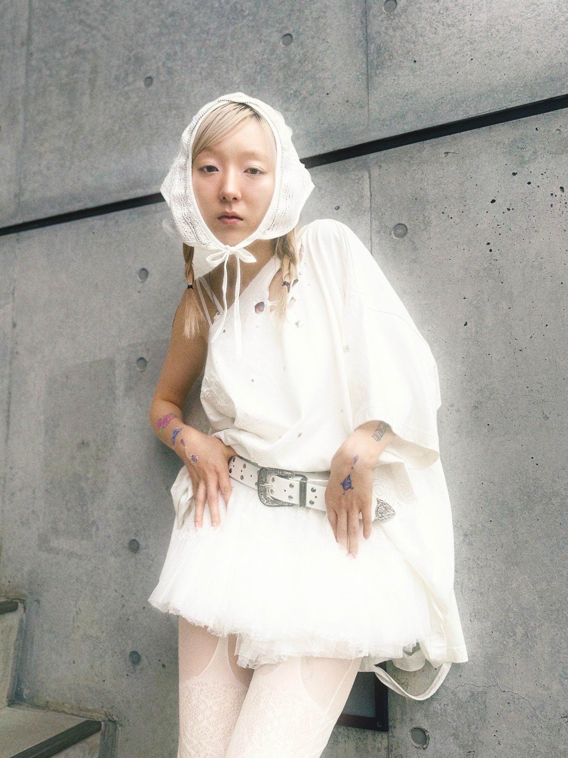 4層で構成される一番下の生地にはハードチュールで張りをもたせ、次にレース生地、一番表はソフトチュールで覆っています。さりげなく透けて見えるレースがとても品よく、ノーブルな仕上がりです。
