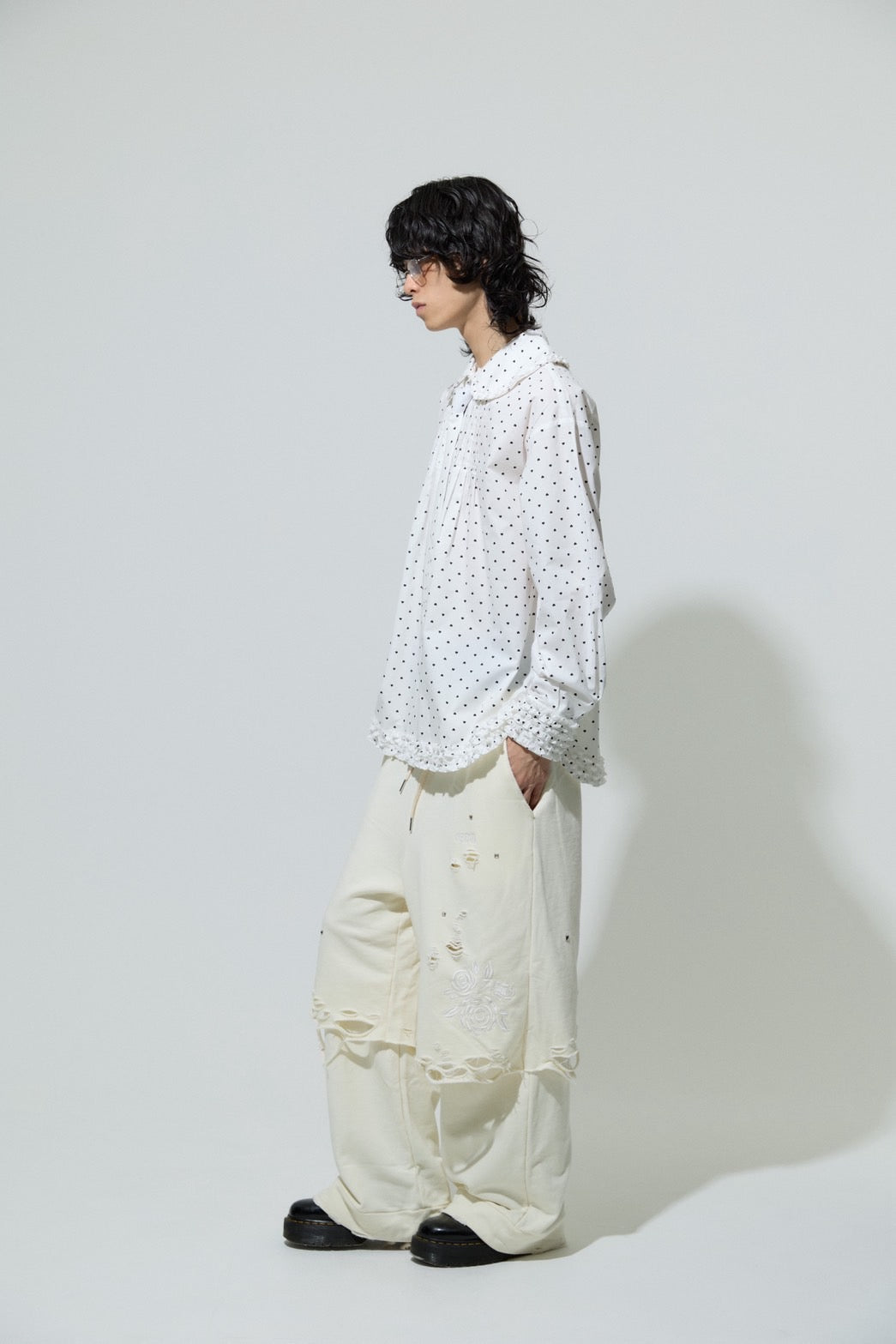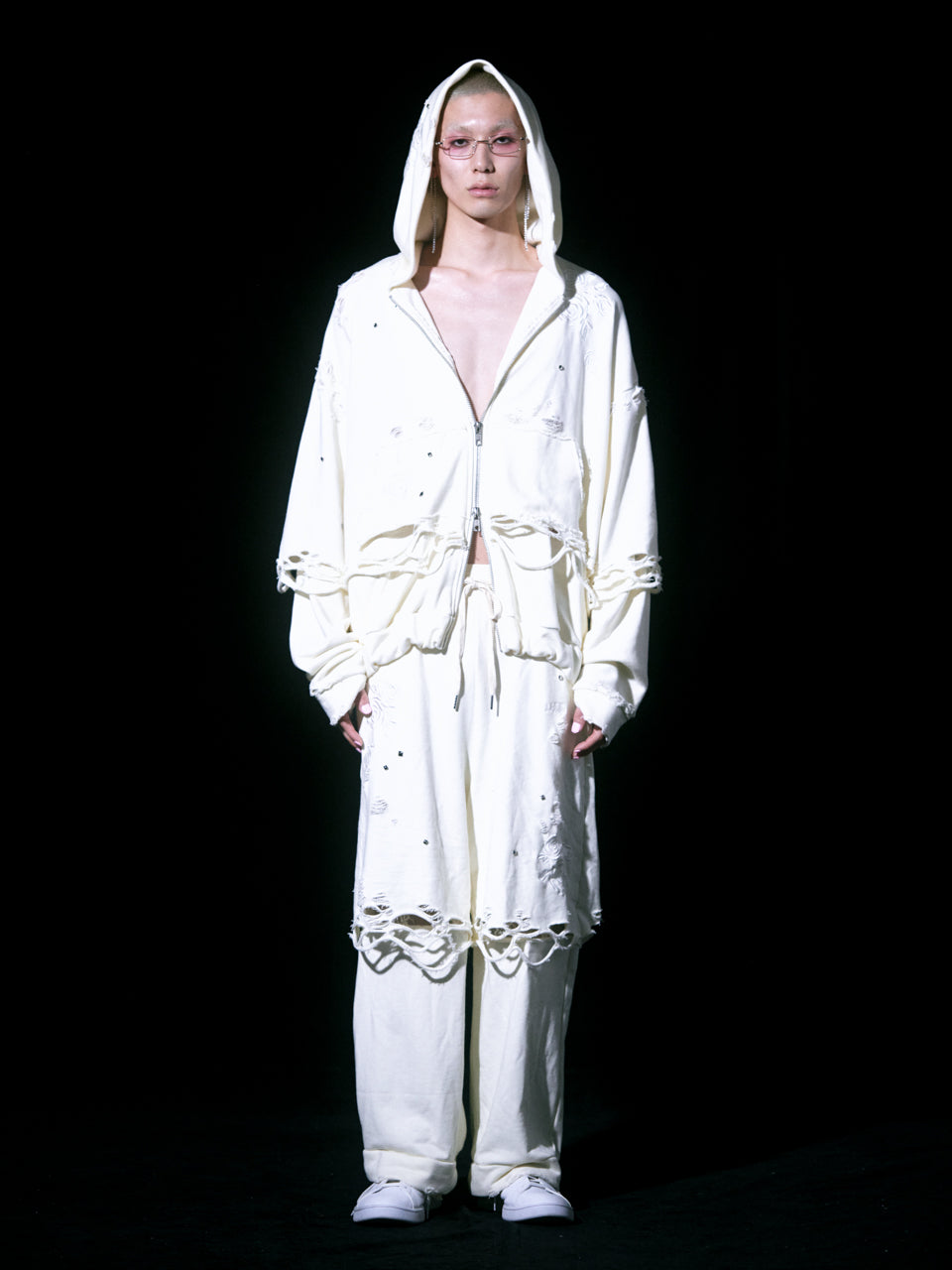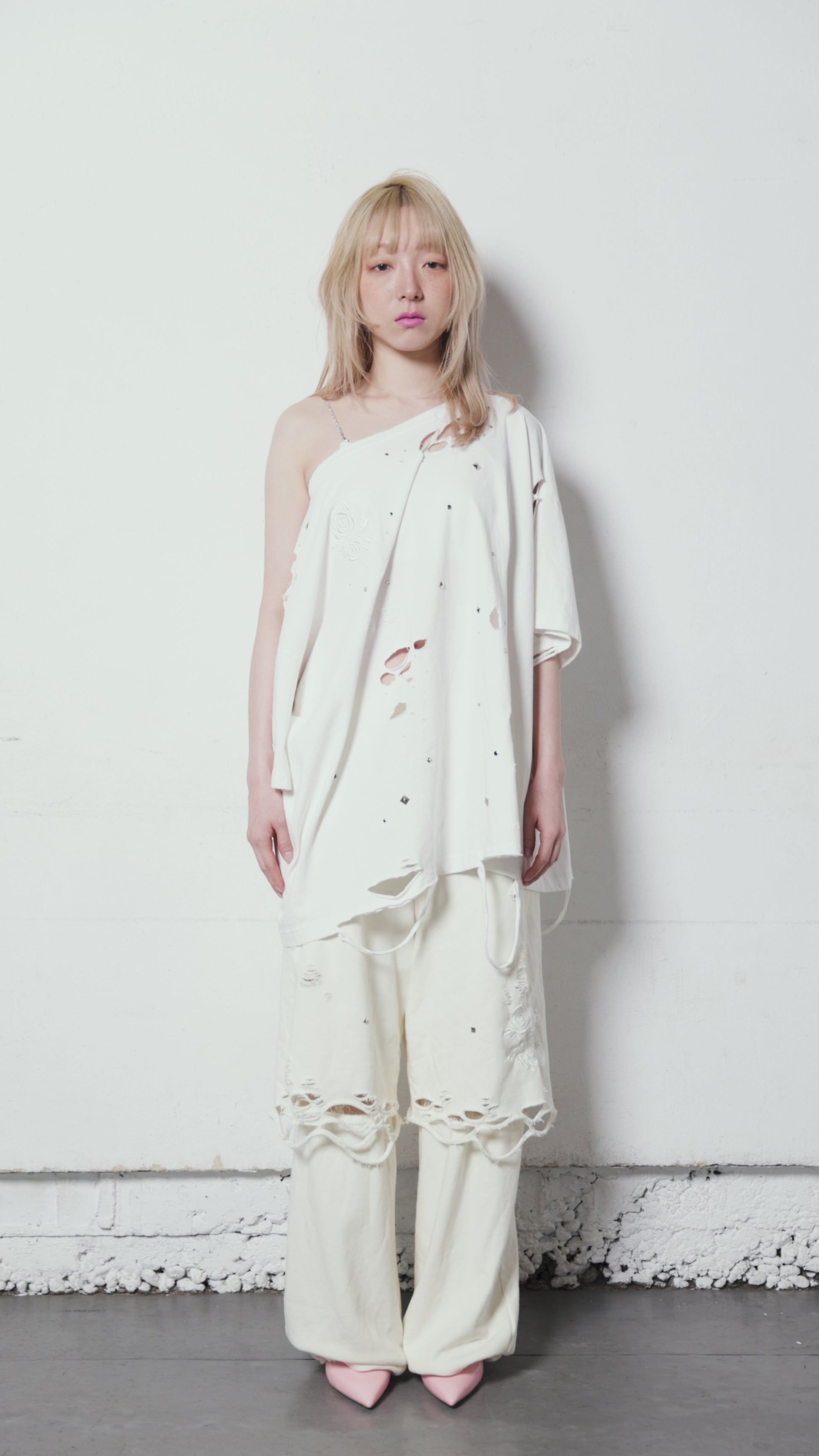 着心地の良いスウェット素材に大胆なダメージ加工を施しました。