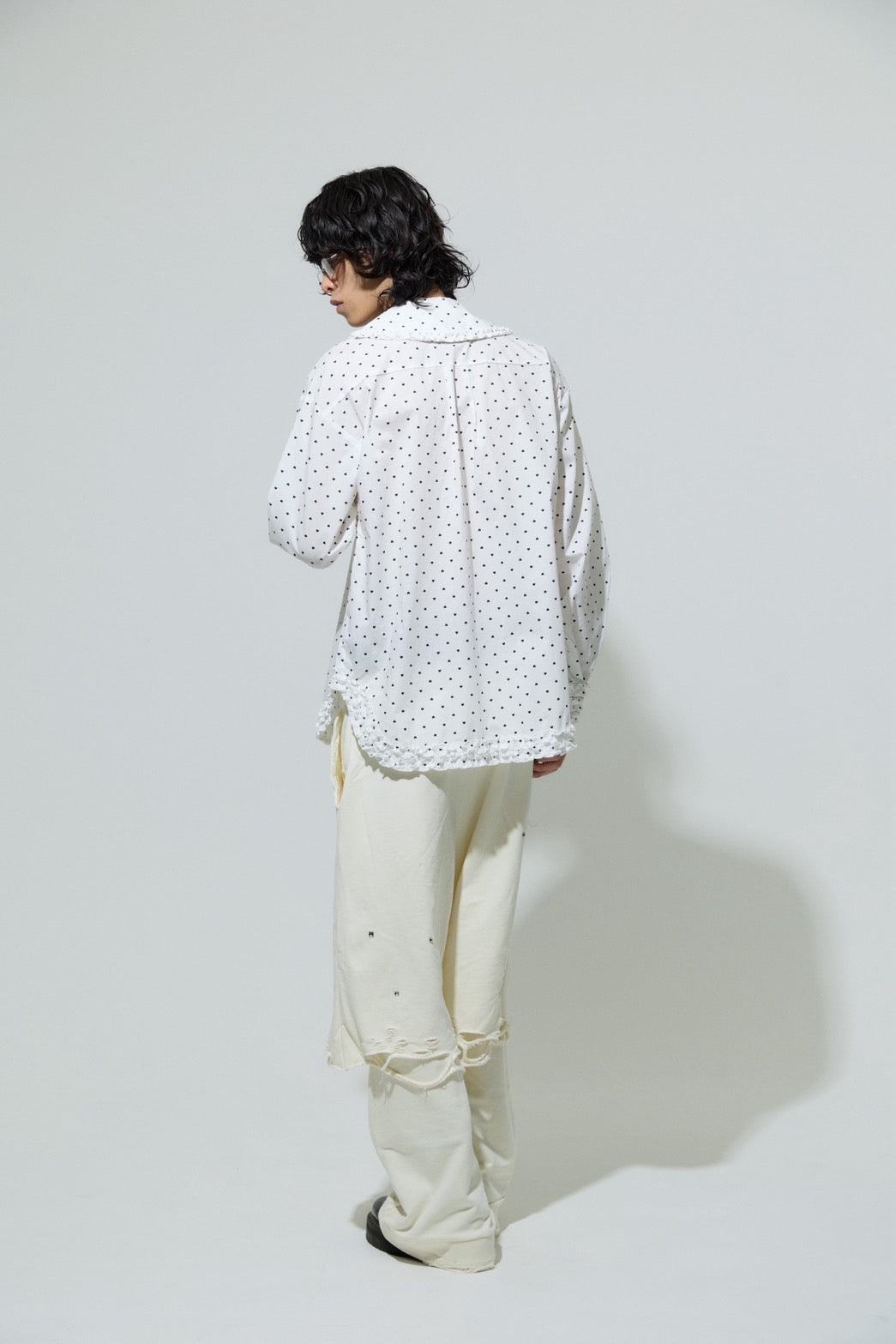 繊細なレースがダメージ加工の向こうに見え隠れします。激しいダメージ加工と同色の刺繍はレースをイメージしました。ハードなイメージのスタッズですが、散りばめて配置することでスタッズとは思えない煌めきを生み出したのがポイント。手間と時間を惜しまず作られた存在感のあるデザインです。