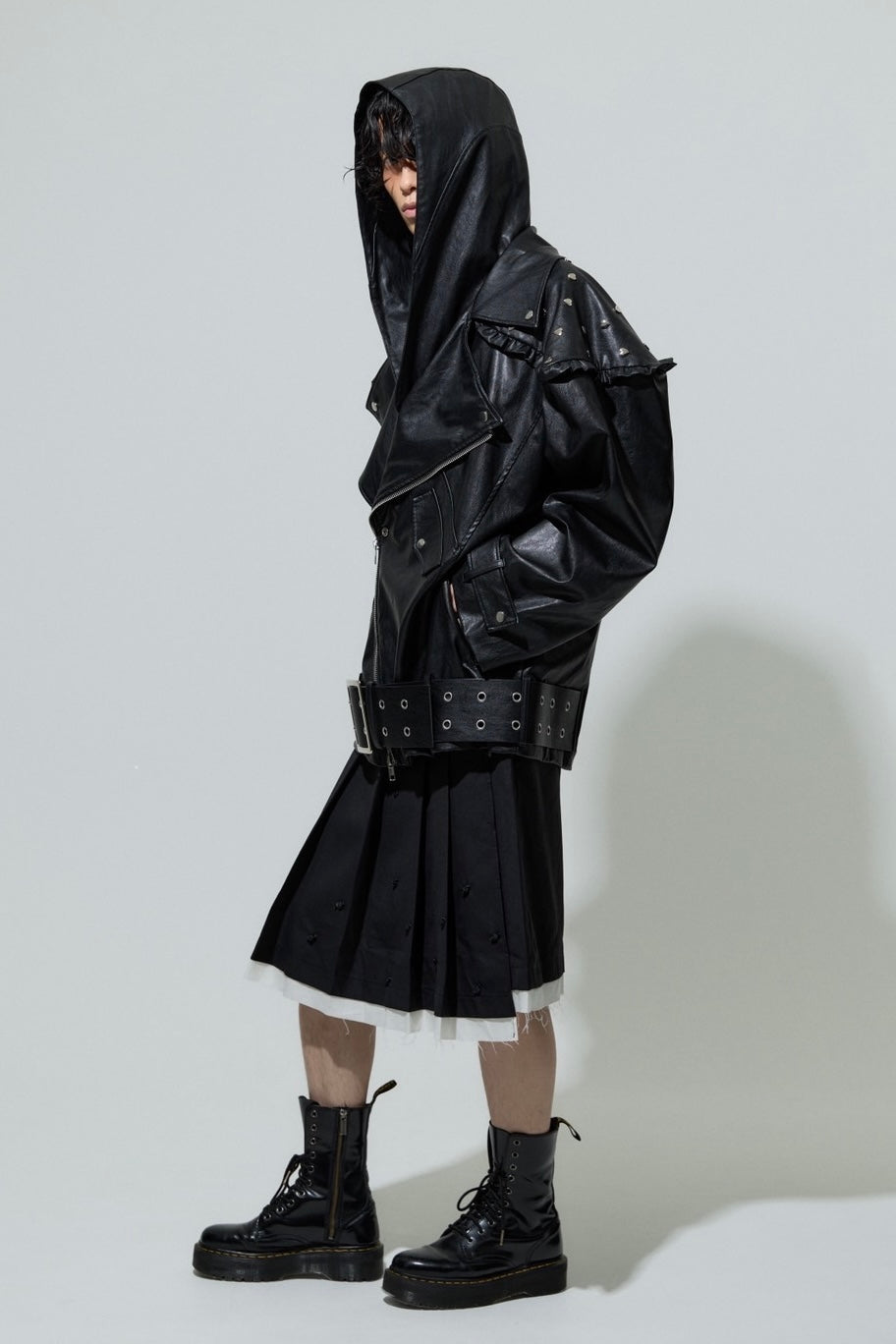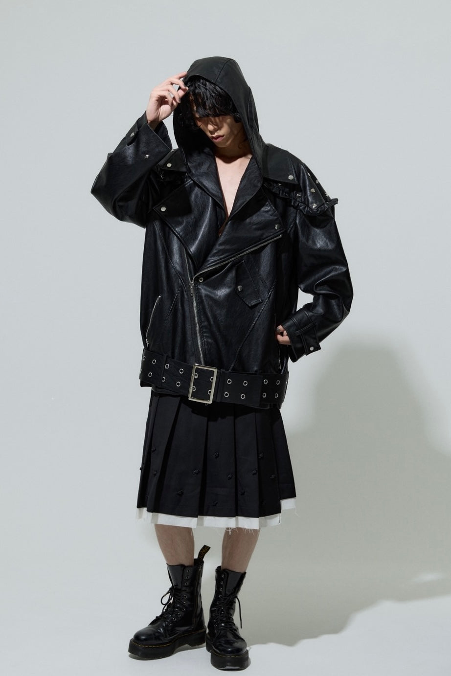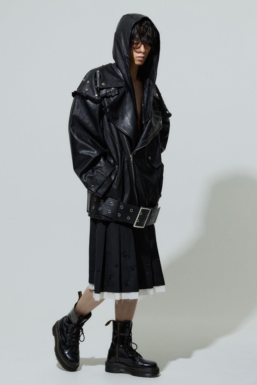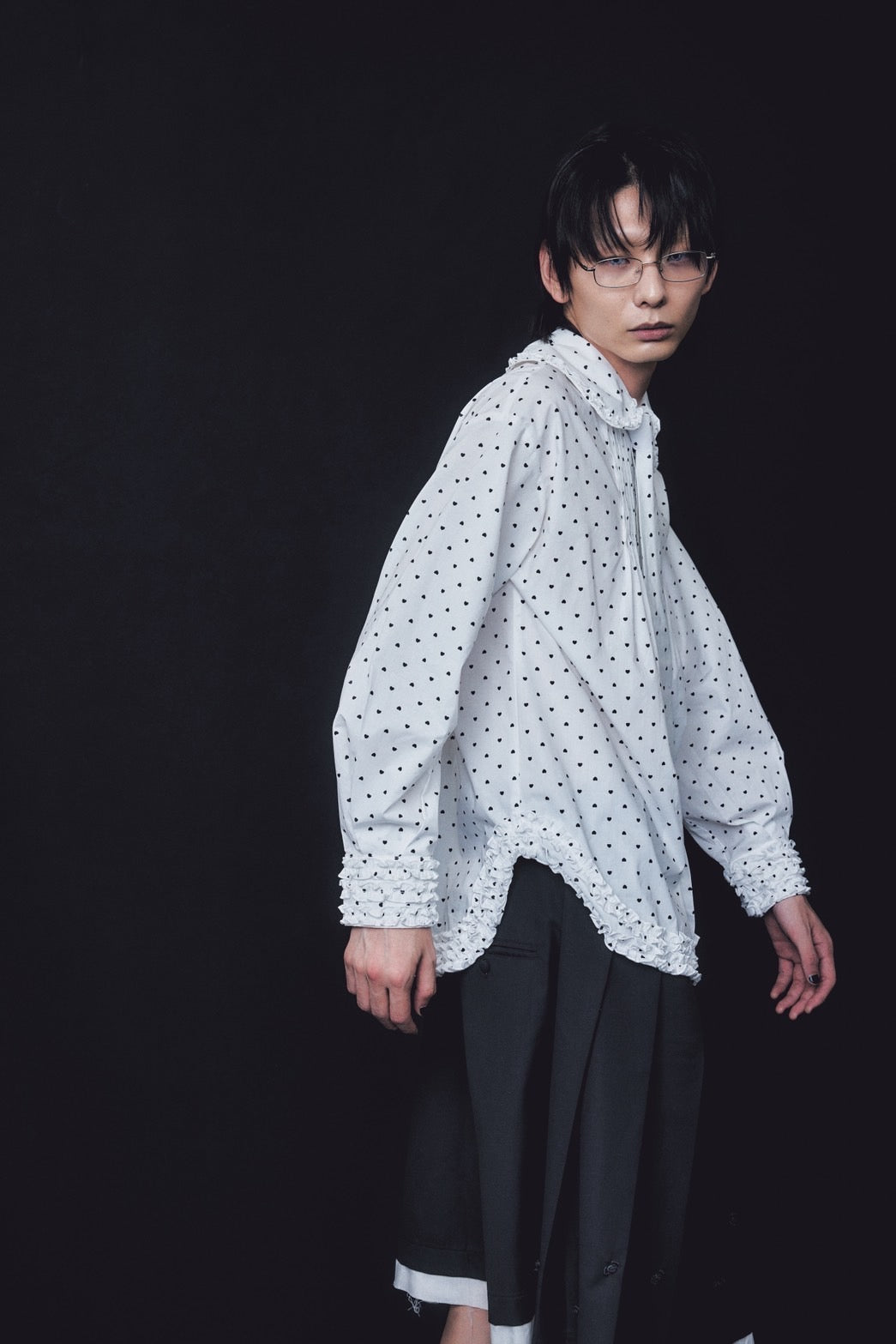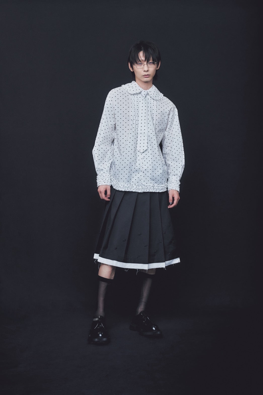 前から見るとプリーツスカート、後ろから見るとハーフパンツという面白いデザインです。男性に胸を張ってスカートを着てもらうために作りました。敢えて長めで一見野暮ったくも見える丈がナードな雰囲気で今っぽさがあります。大人の女性や男性もおしゃれに着ていただけます。