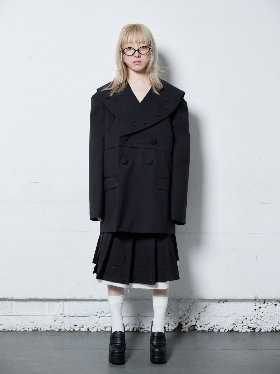 全面に芯を貼るというひと手間を加え、張りのあるシルエットを実現しました。断ち切りの裏地がプリーツやバラのモチーフとは裏腹なエッジの効いた強さを表現します。