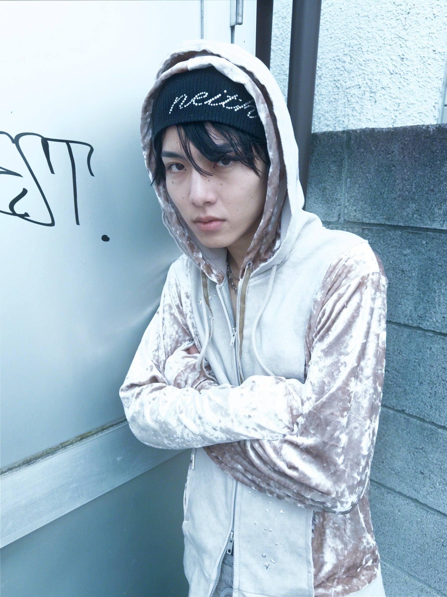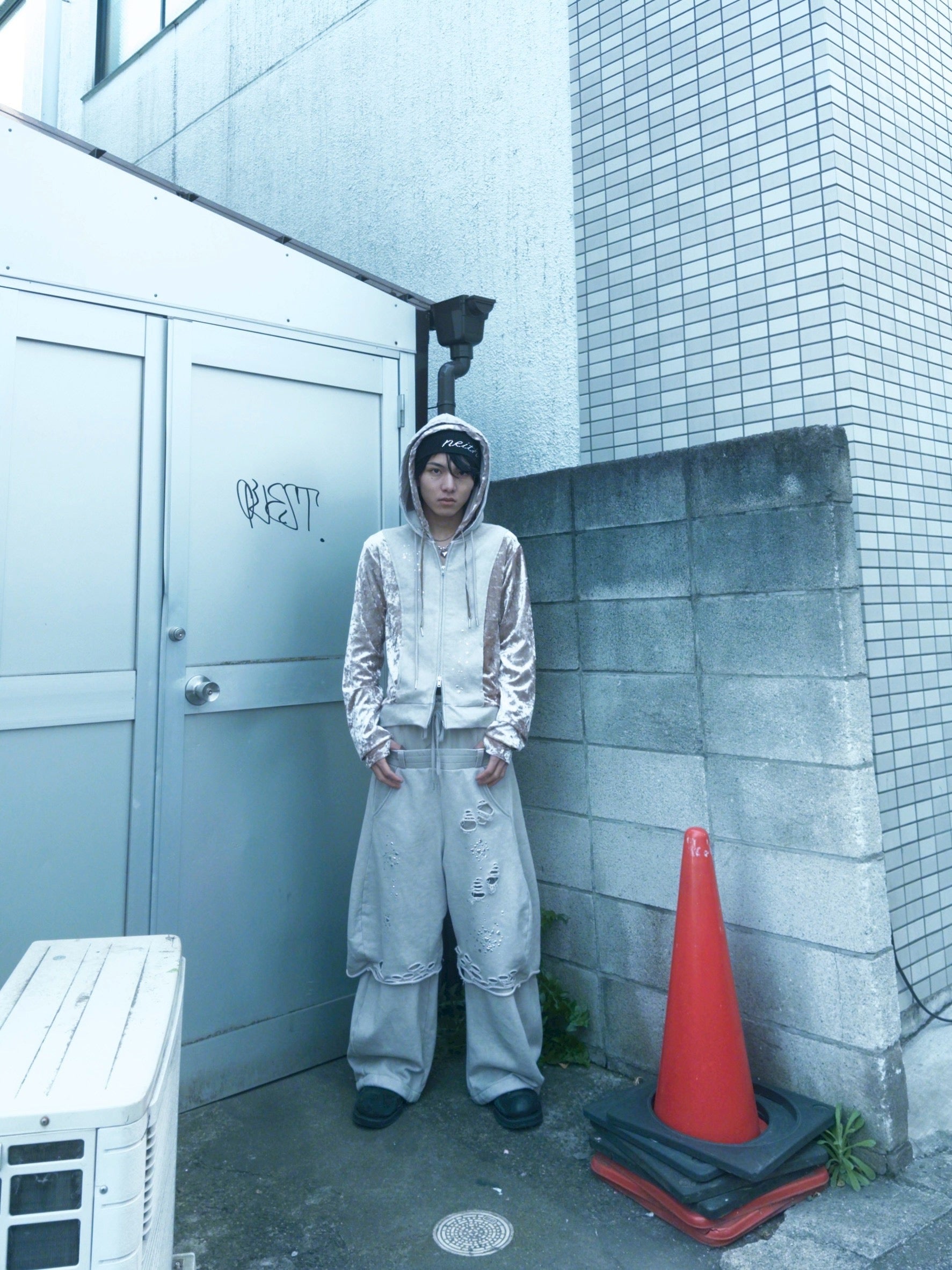 ・ヴィンテージ加工が施されたグランジ感のある裏毛生地と煌めくクラッシュベロアのギャップがポイント