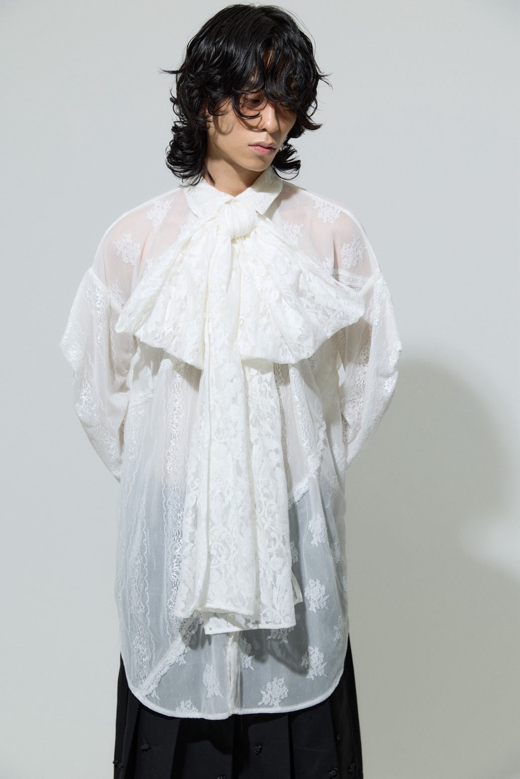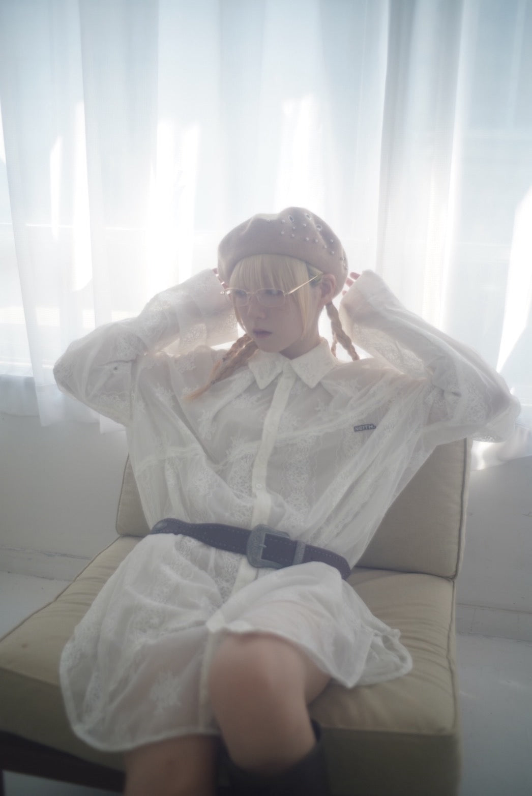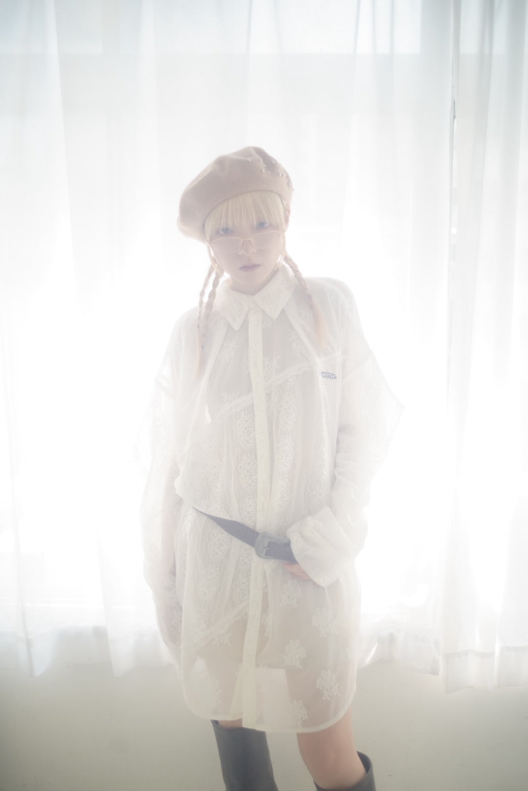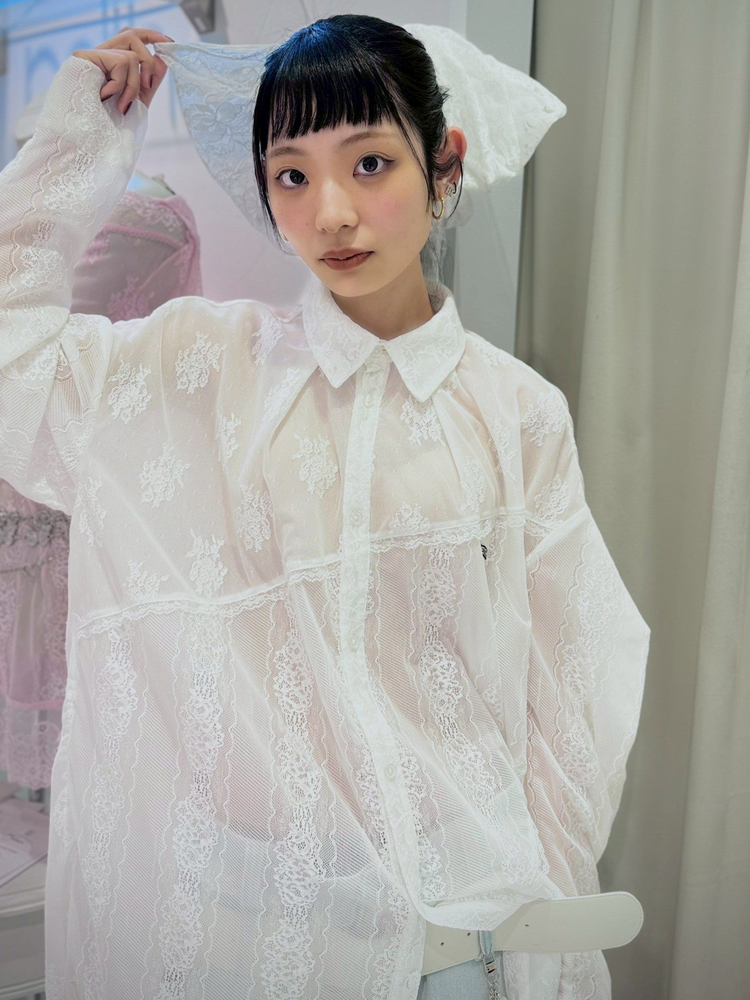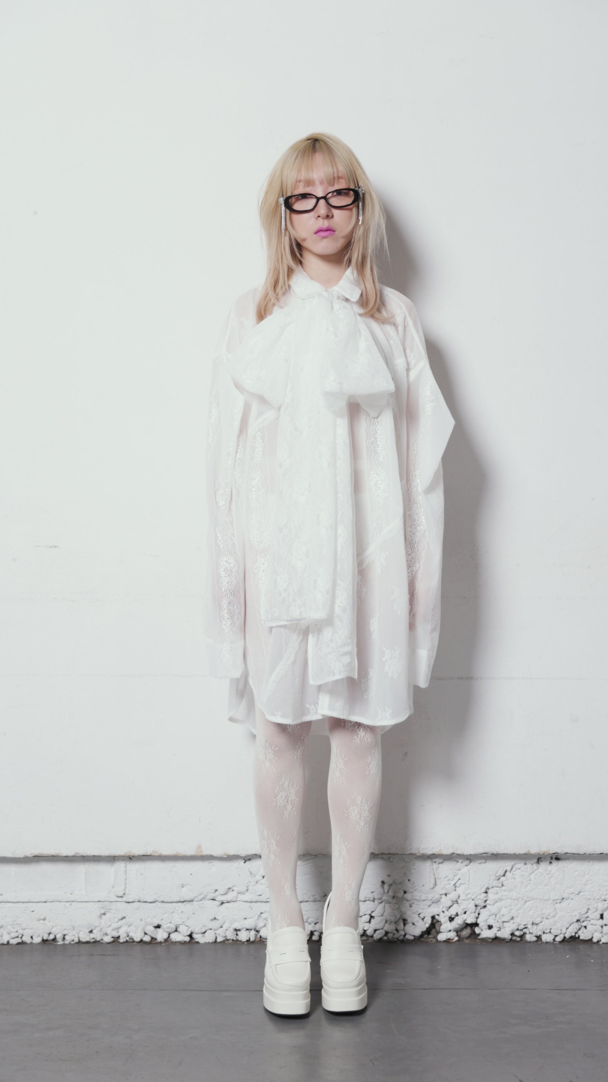 人気のシャツドレスを大胆なシルエットと大きなリボンはそのままに、今シーズンらしくレースにバージョンアップ。レースとレースの切り替え部分にはレースリボンを挟み込み、丁寧に作りこまれています。