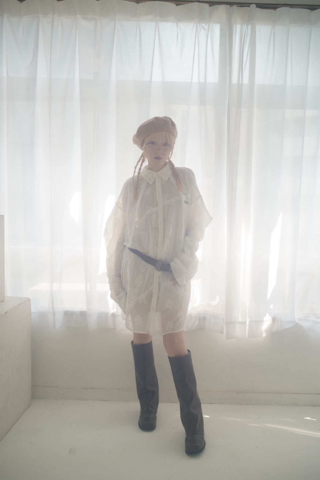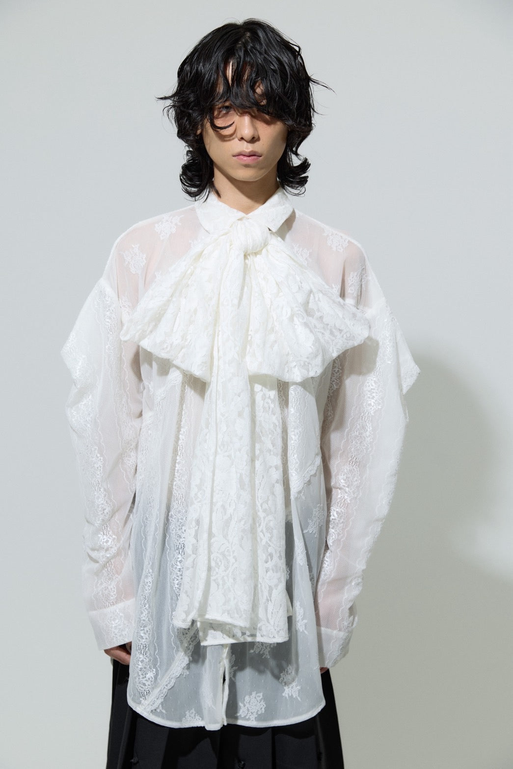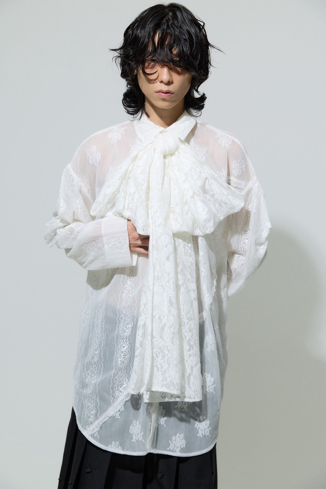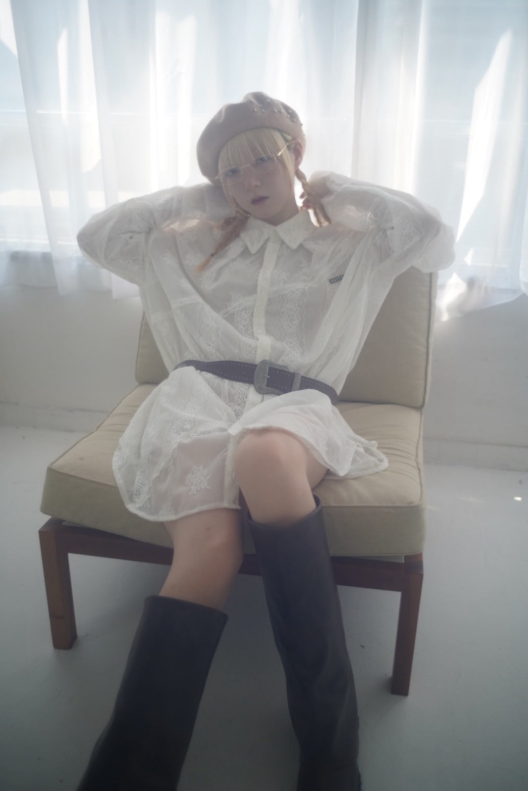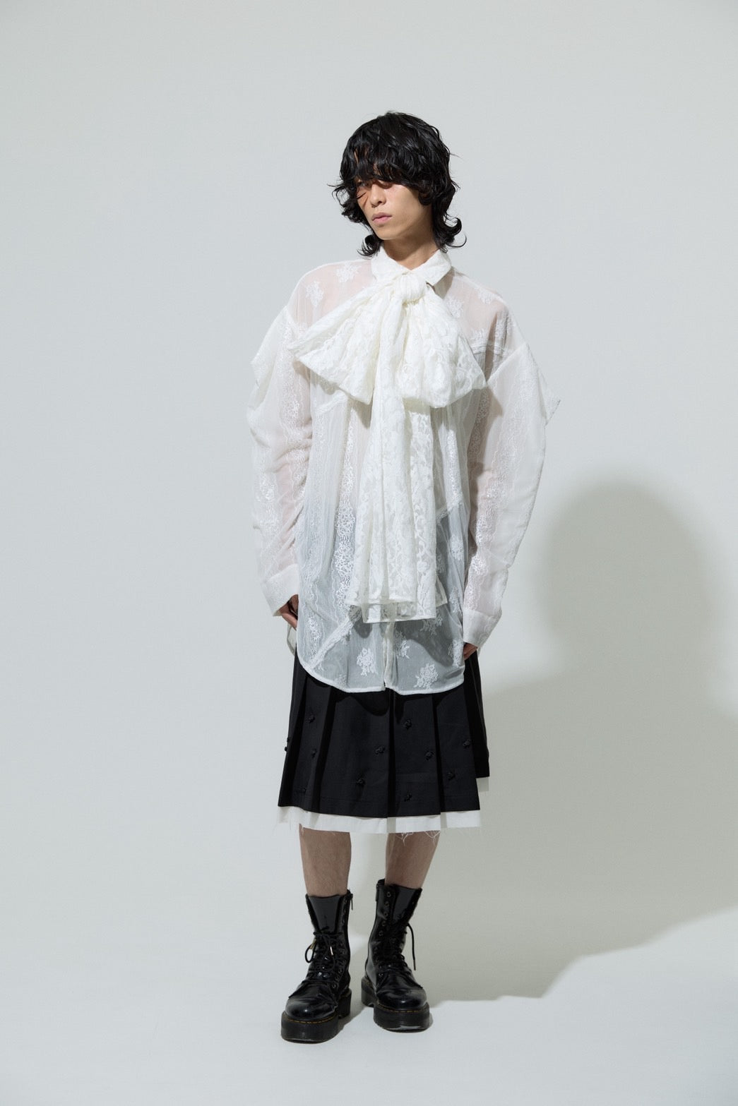 人気のシャツドレスを大胆なシルエットと大きなリボンはそのままに、今シーズンらしくレースにバージョンアップ。レースとレースの切り替え部分にはレースリボンを挟み込み、丁寧に作りこまれています。