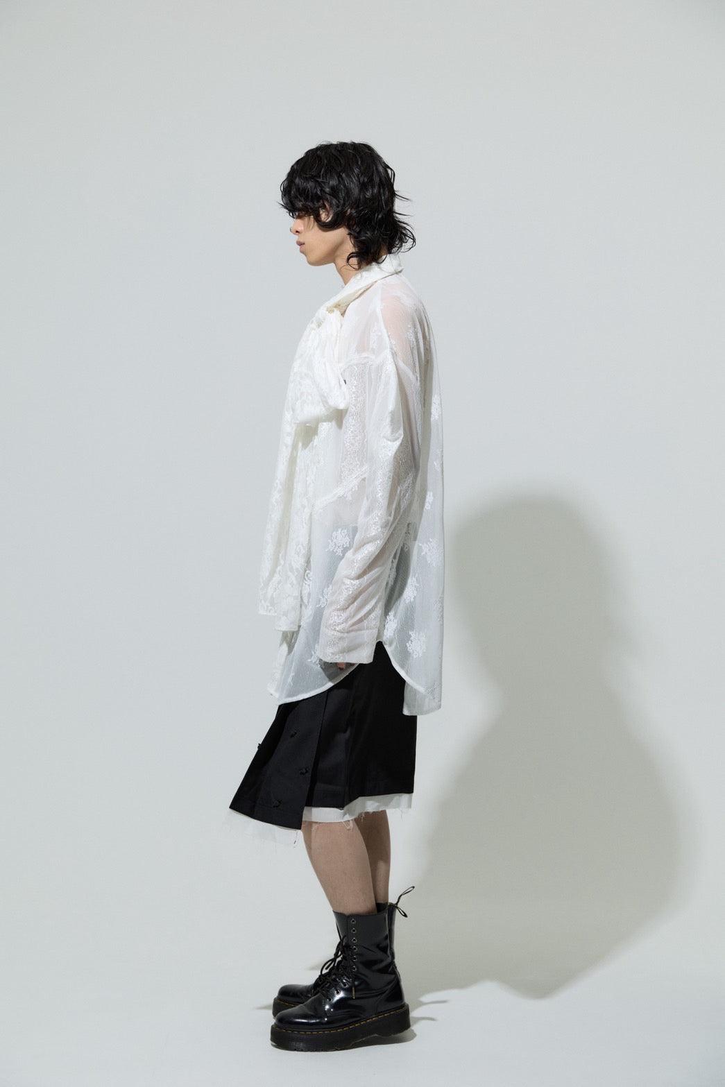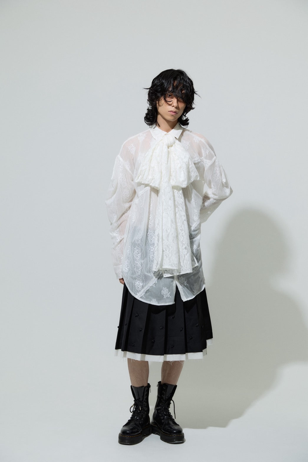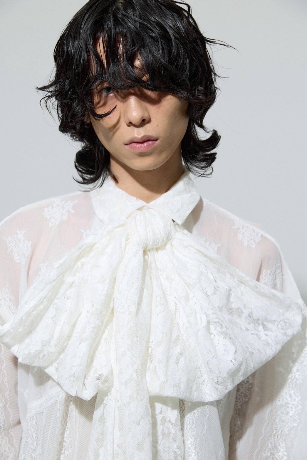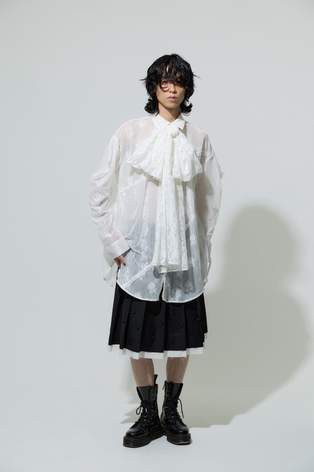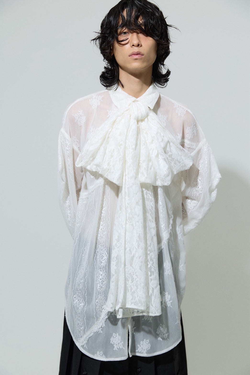 人気のシャツドレスを大胆なシルエットと大きなリボンはそのままに、今シーズンらしくレースにバージョンアップ。レースとレースの切り替え部分にはレースリボンを挟み込み、丁寧に作りこまれています。