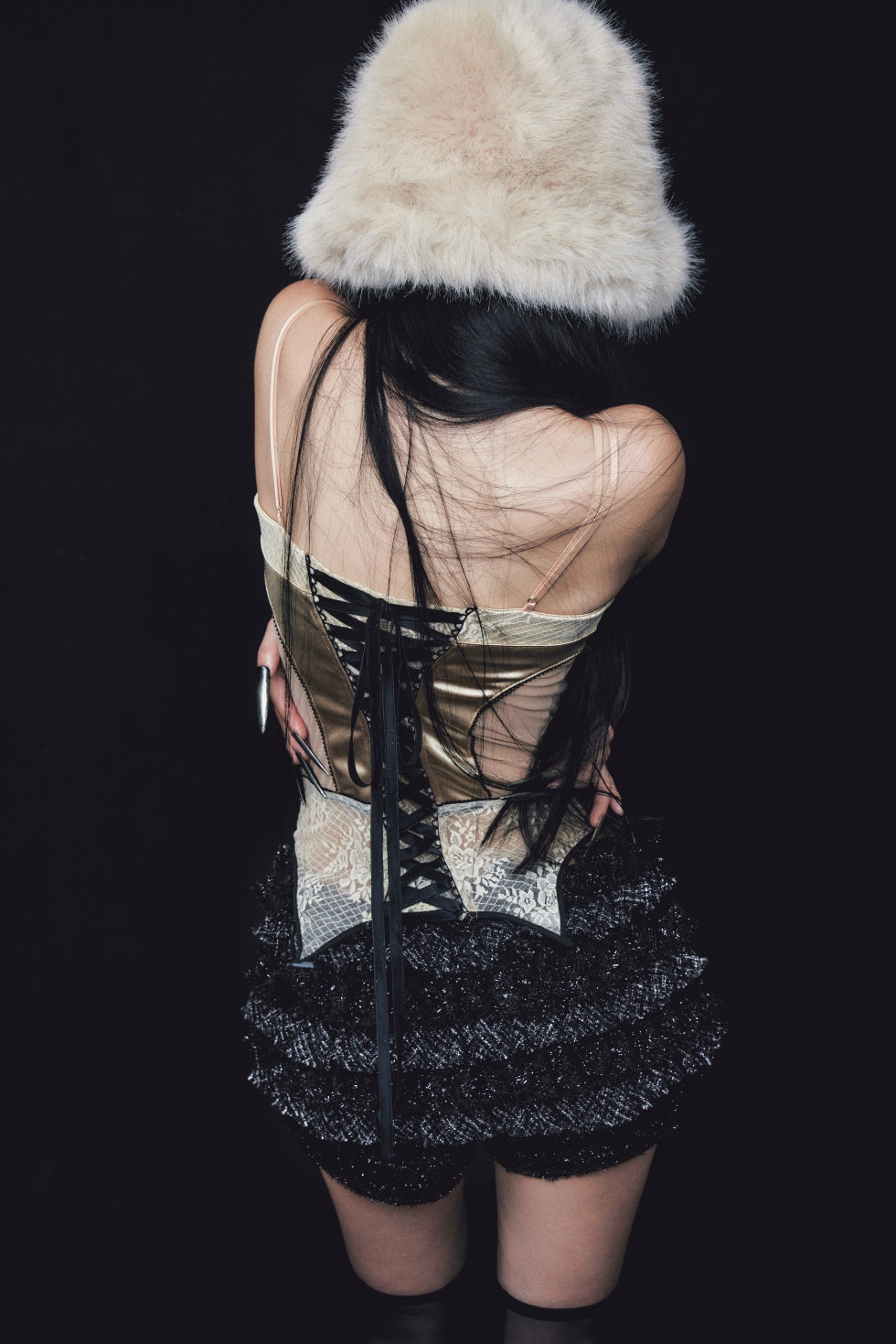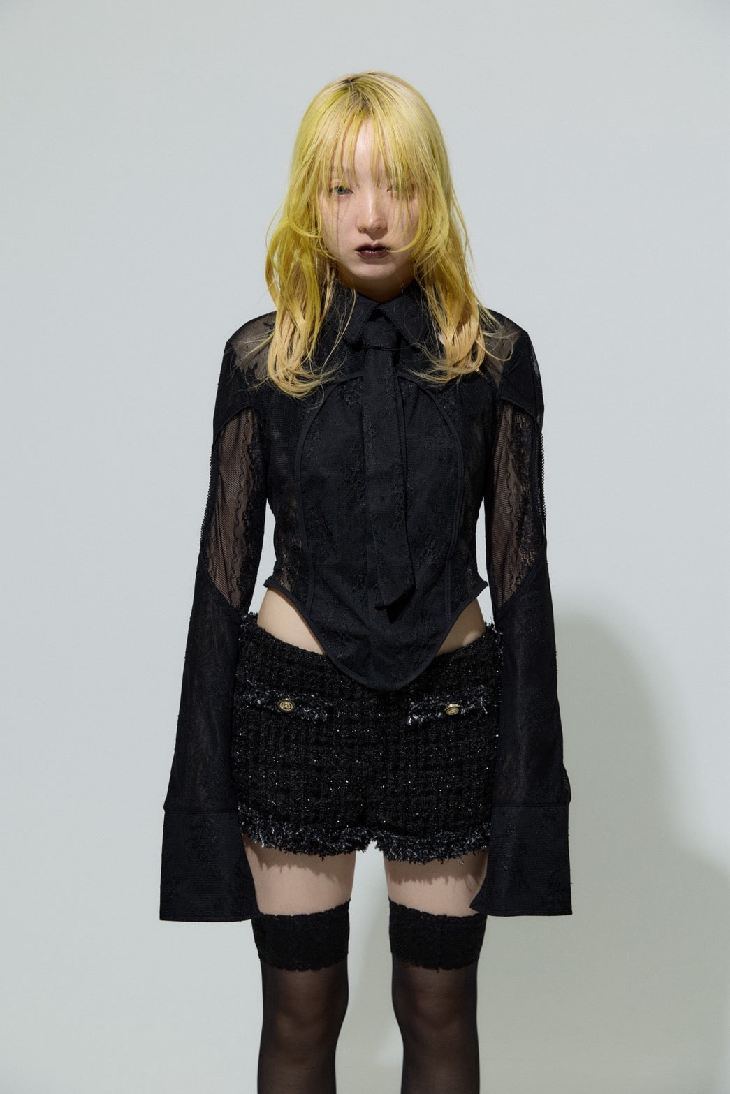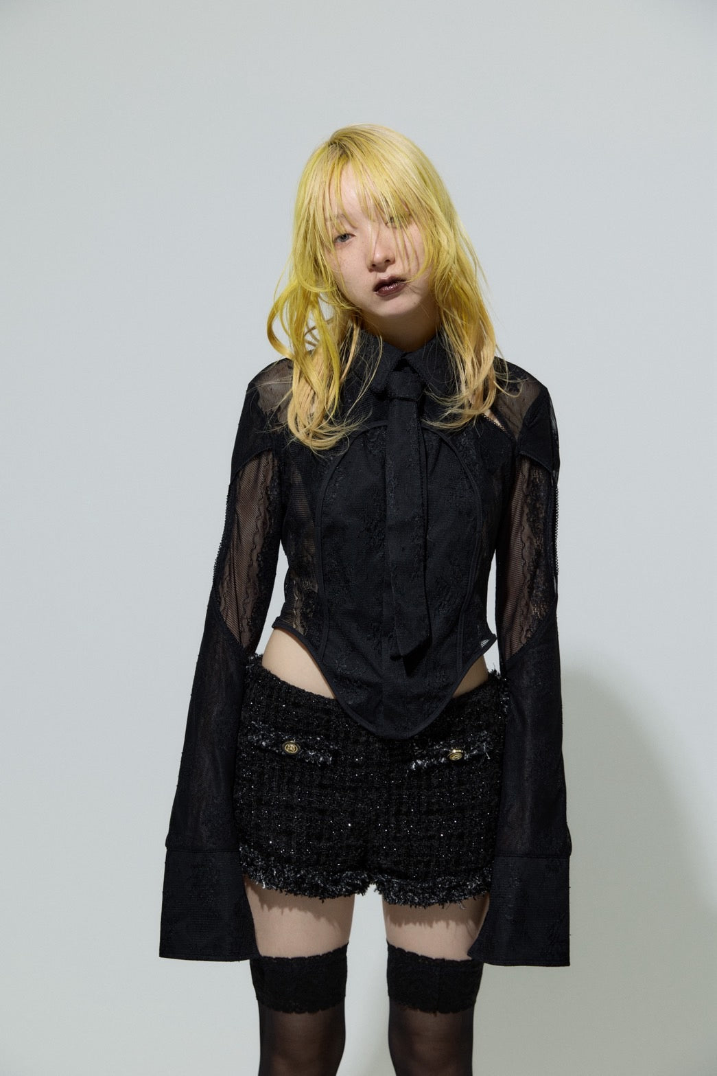 ・キラキラと光るラメ糸がリッチなツイード生地を2種類使用。同色使いがさり気ないアクセント。