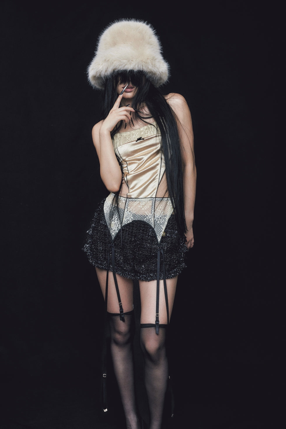 ・トラディショナルな印象のツイードもローライズで旬なスタイルに