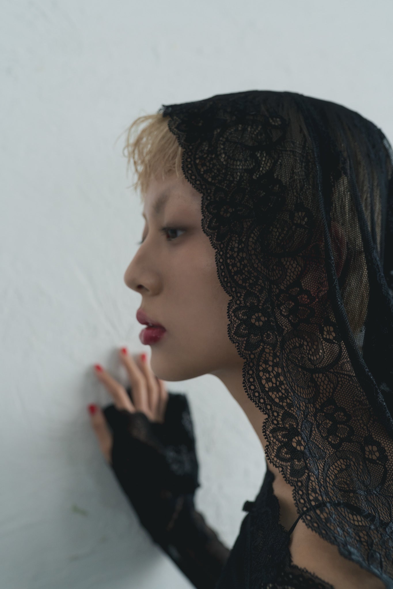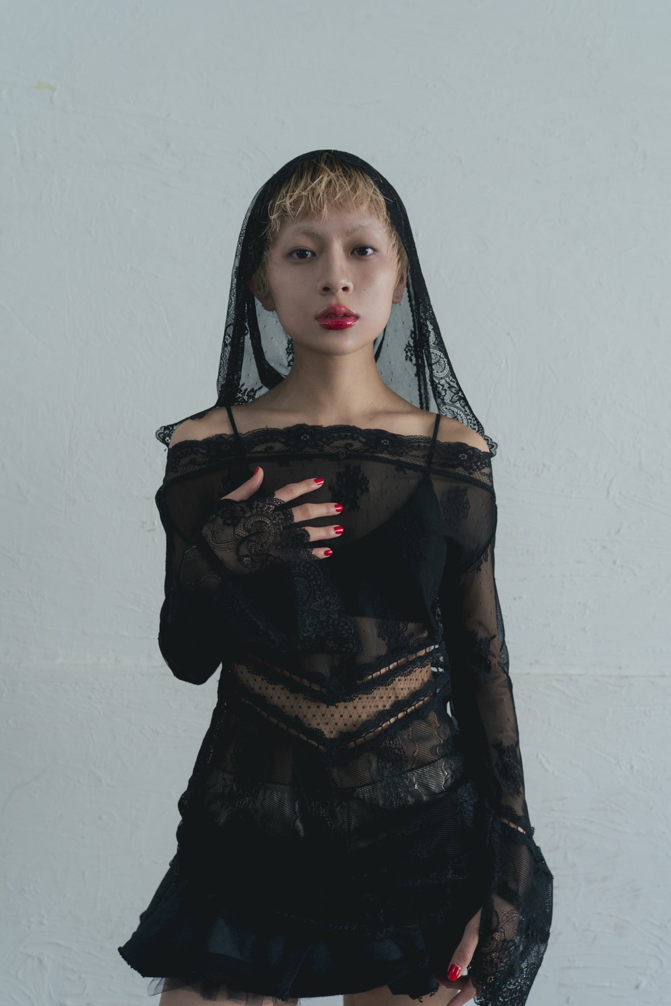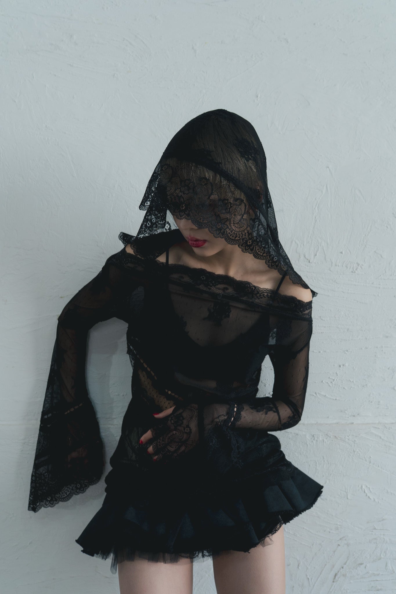 3種類のレース生地の組み合わせが美しいドレス。袖口とフード周りに施した太幅レースが印象的。レース生地はストレッチが効いておりサイズを問わず、着脱もノンストレスです。