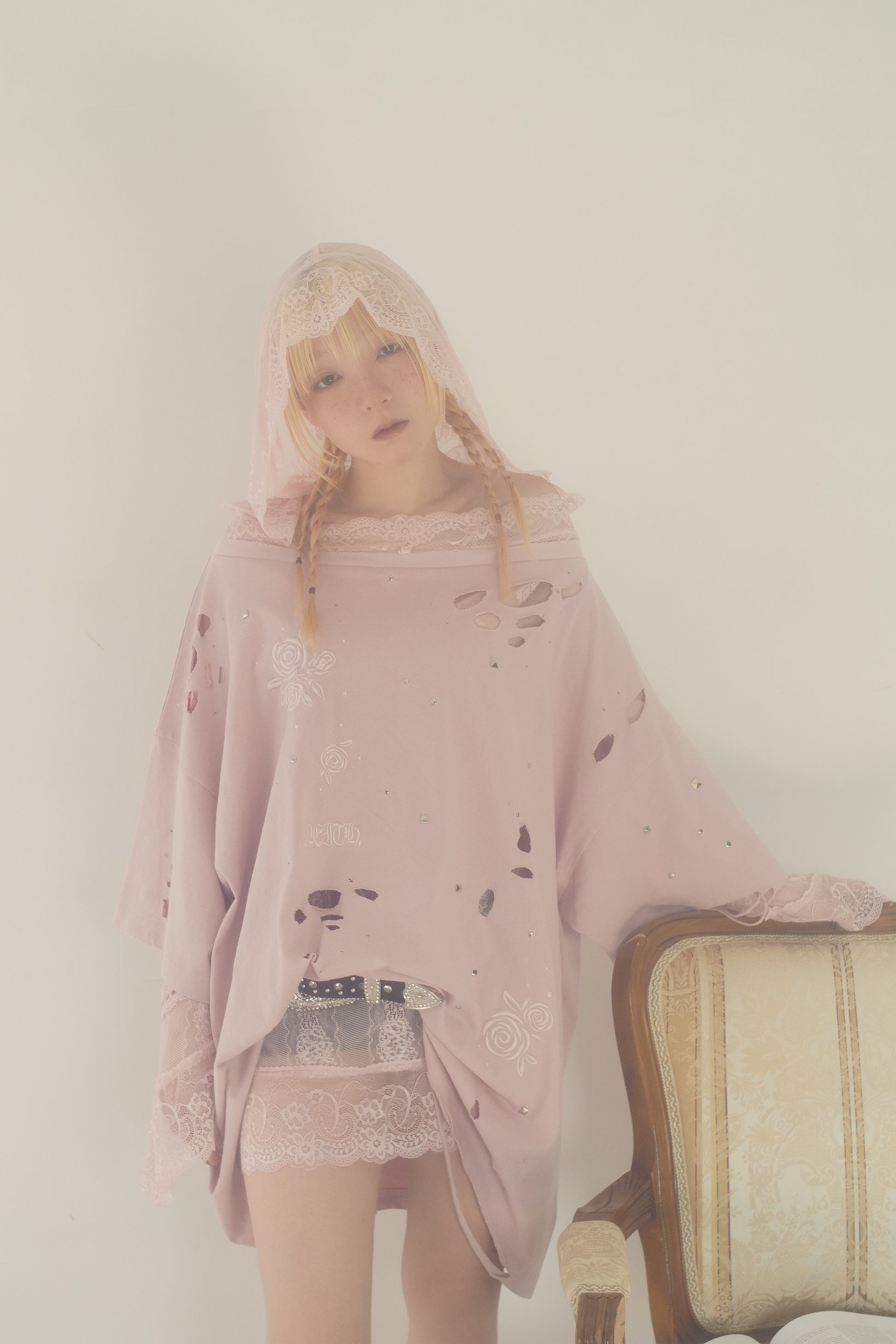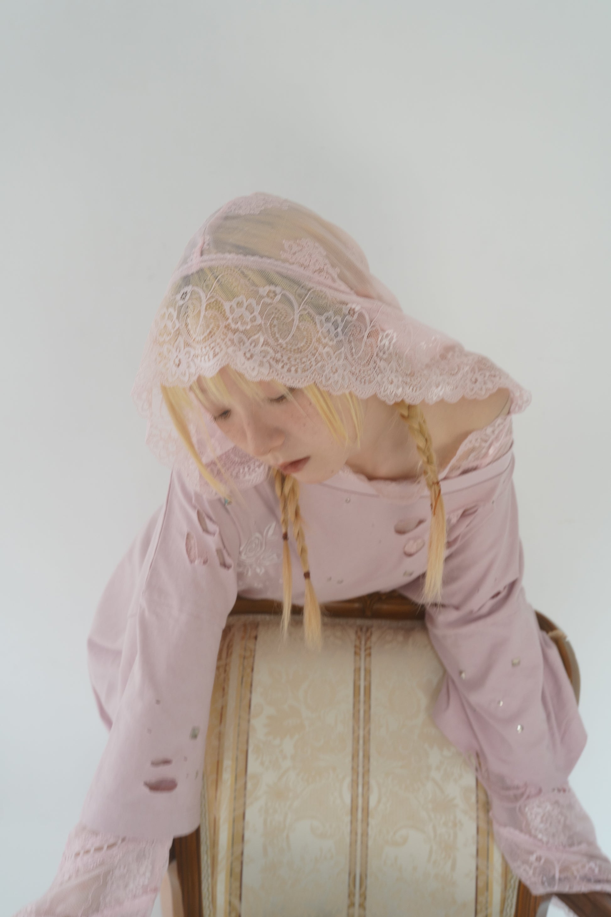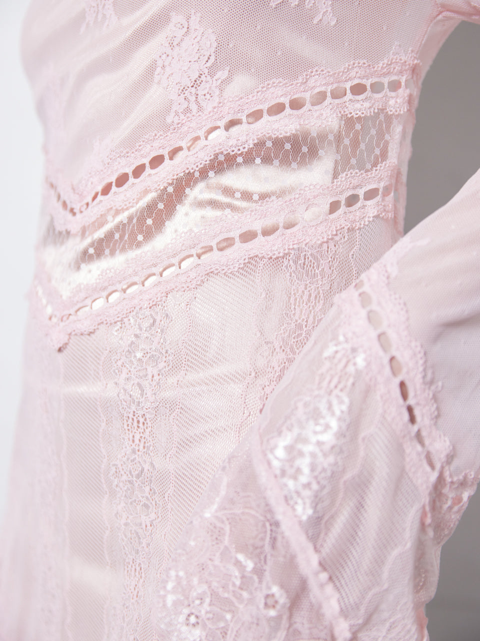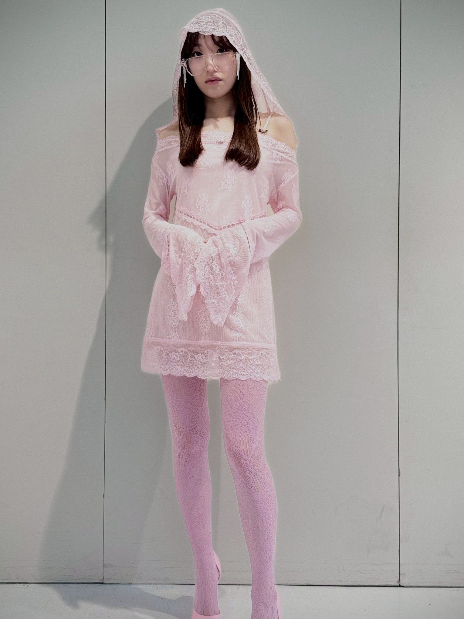 3種類のレース生地の組み合わせが美しいドレス。袖口とフード周りに施した太幅レースが印象的。レース生地はストレッチが効いておりサイズを問わず、着脱もノンストレスです。