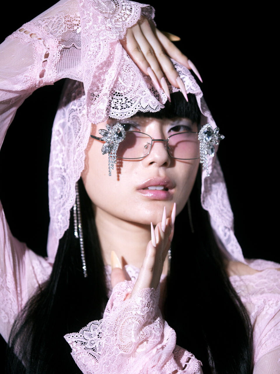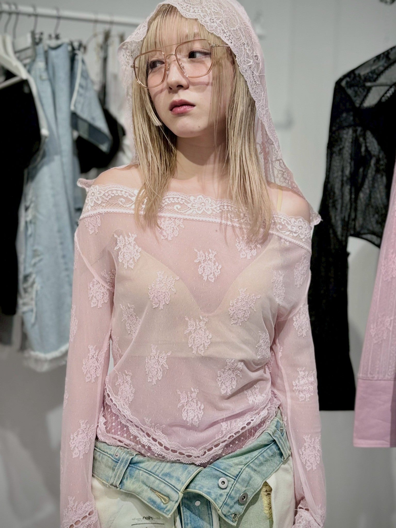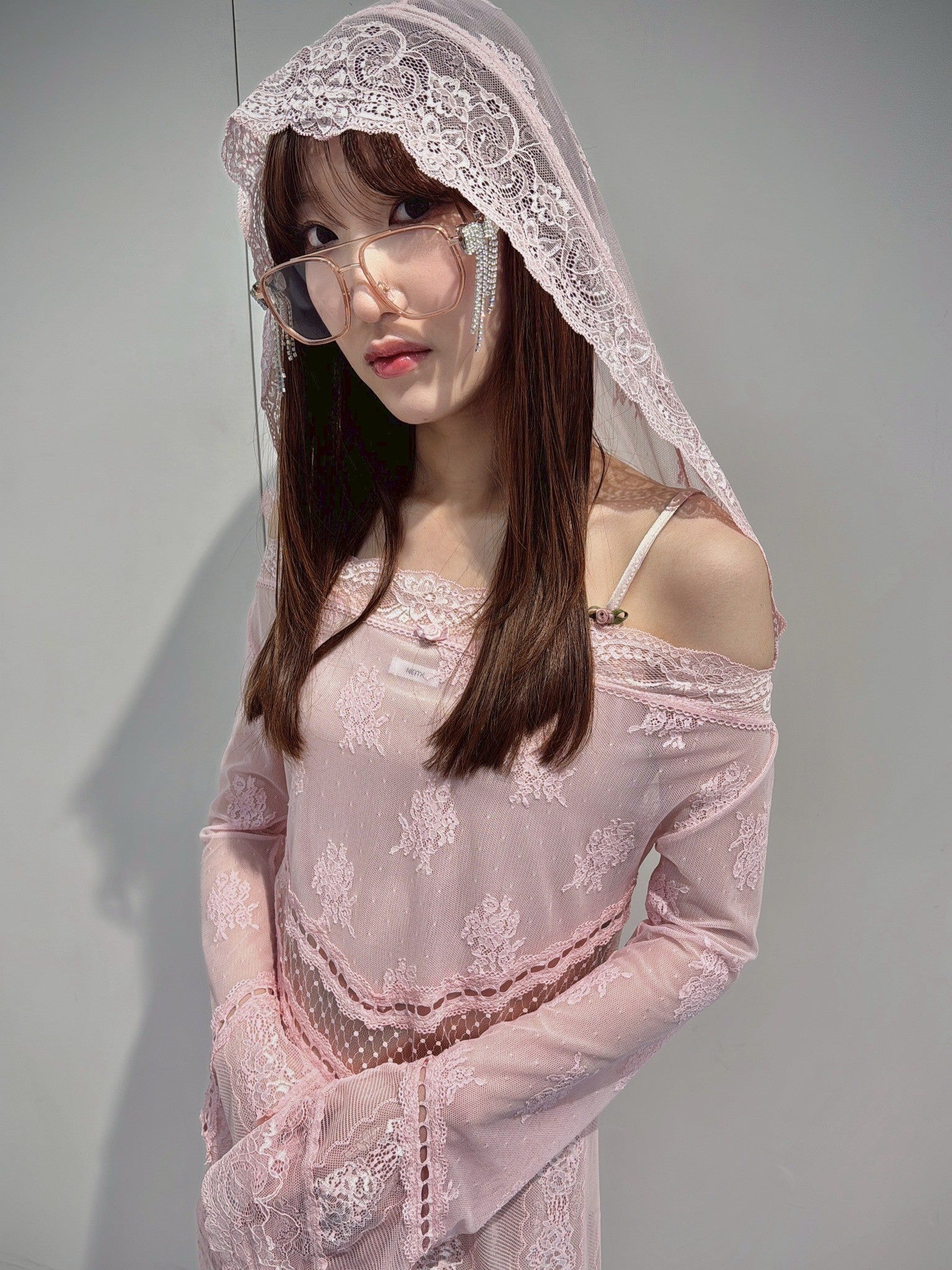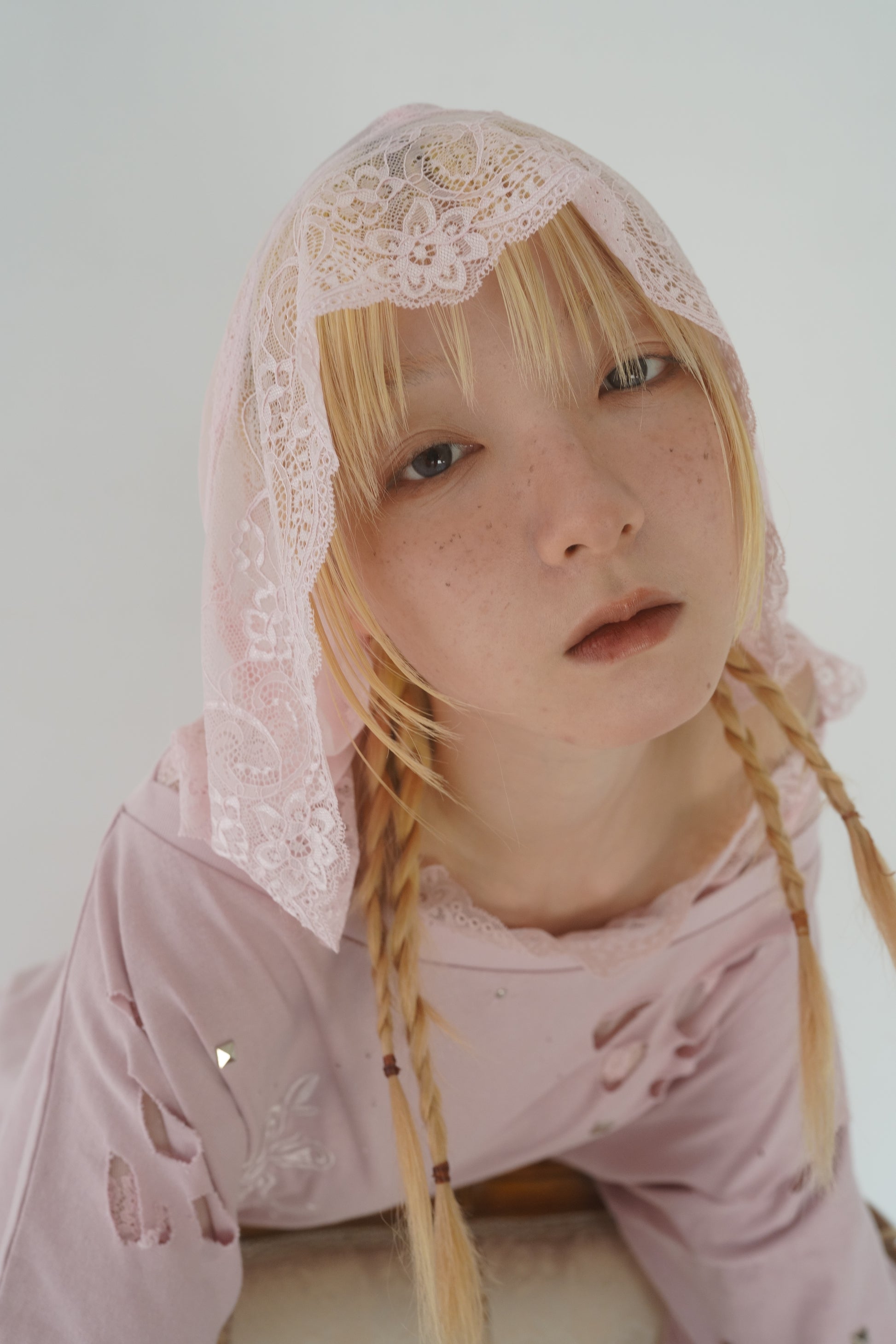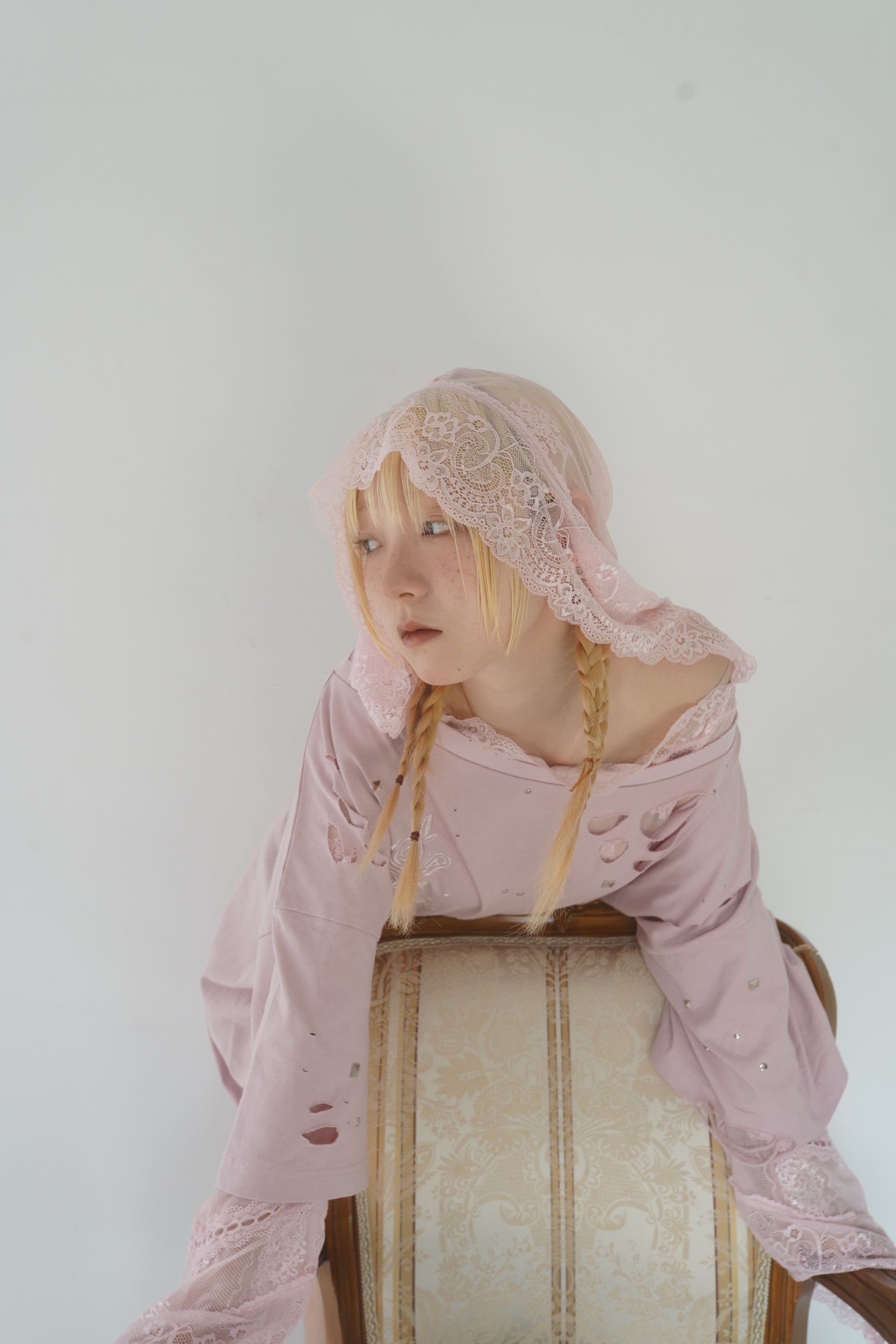 3種類のレース生地の組み合わせが美しいドレス。袖口とフード周りに施した太幅レースが印象的。レース生地はストレッチが効いておりサイズを問わず、着脱もノンストレスです。