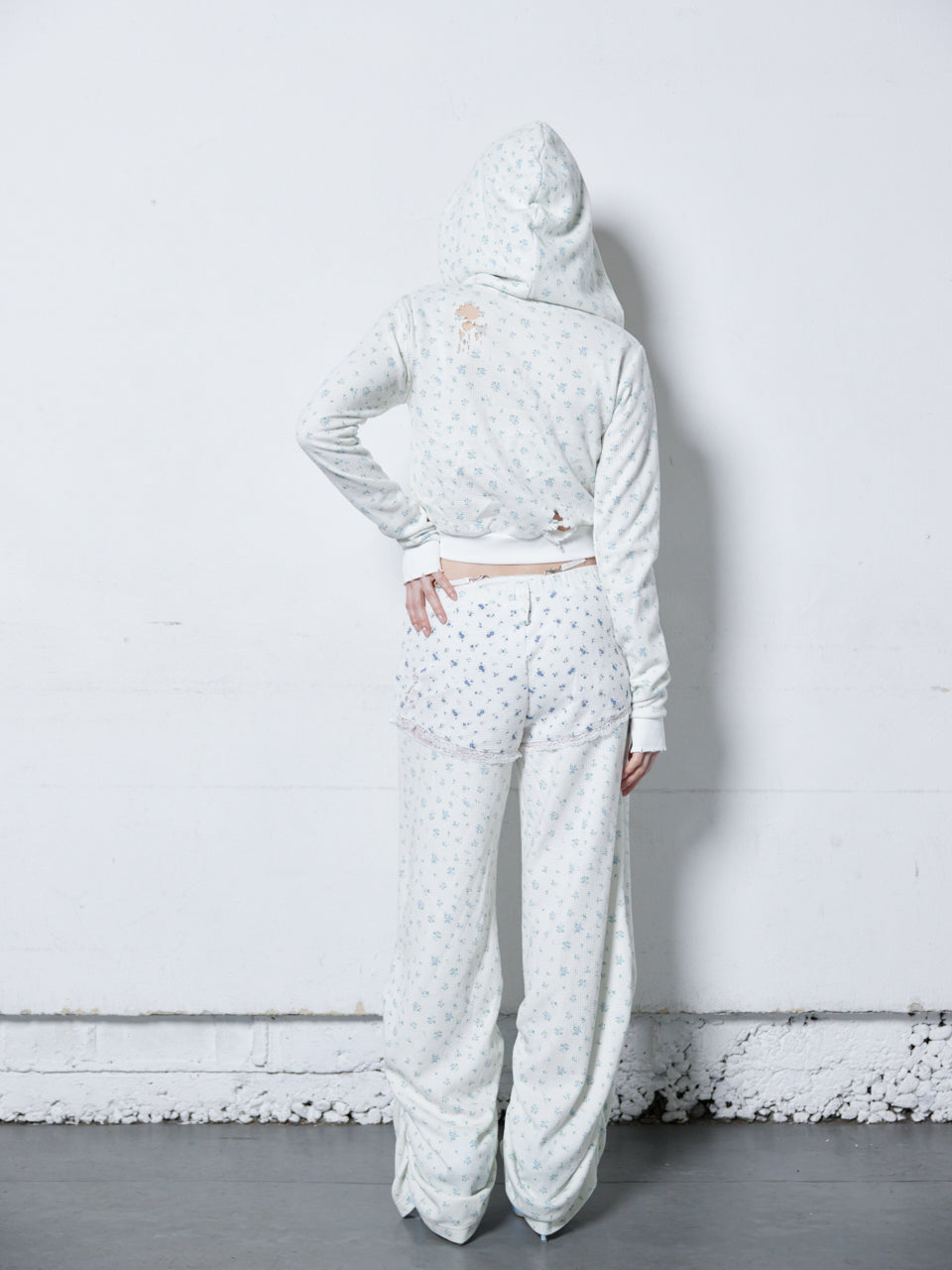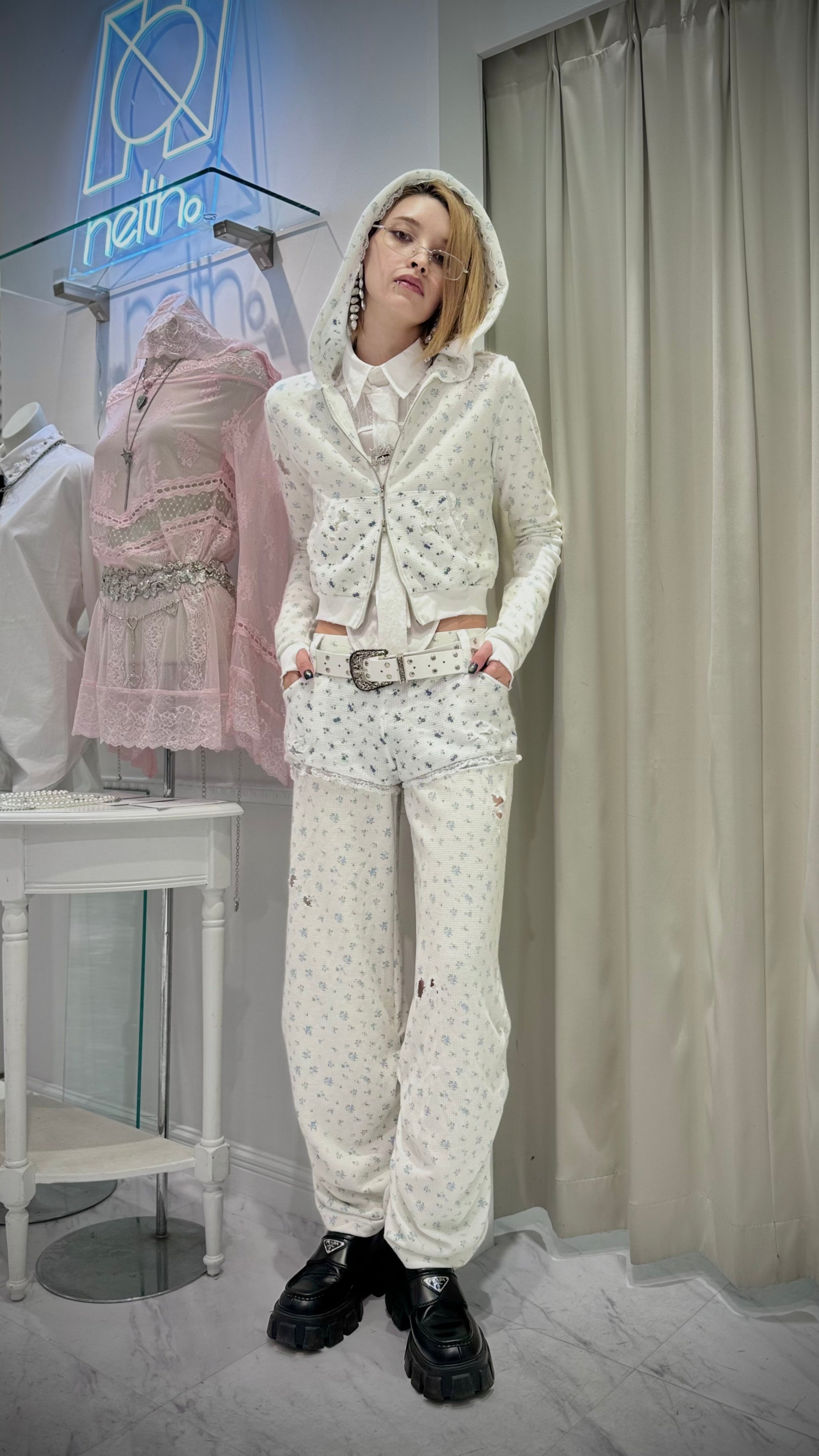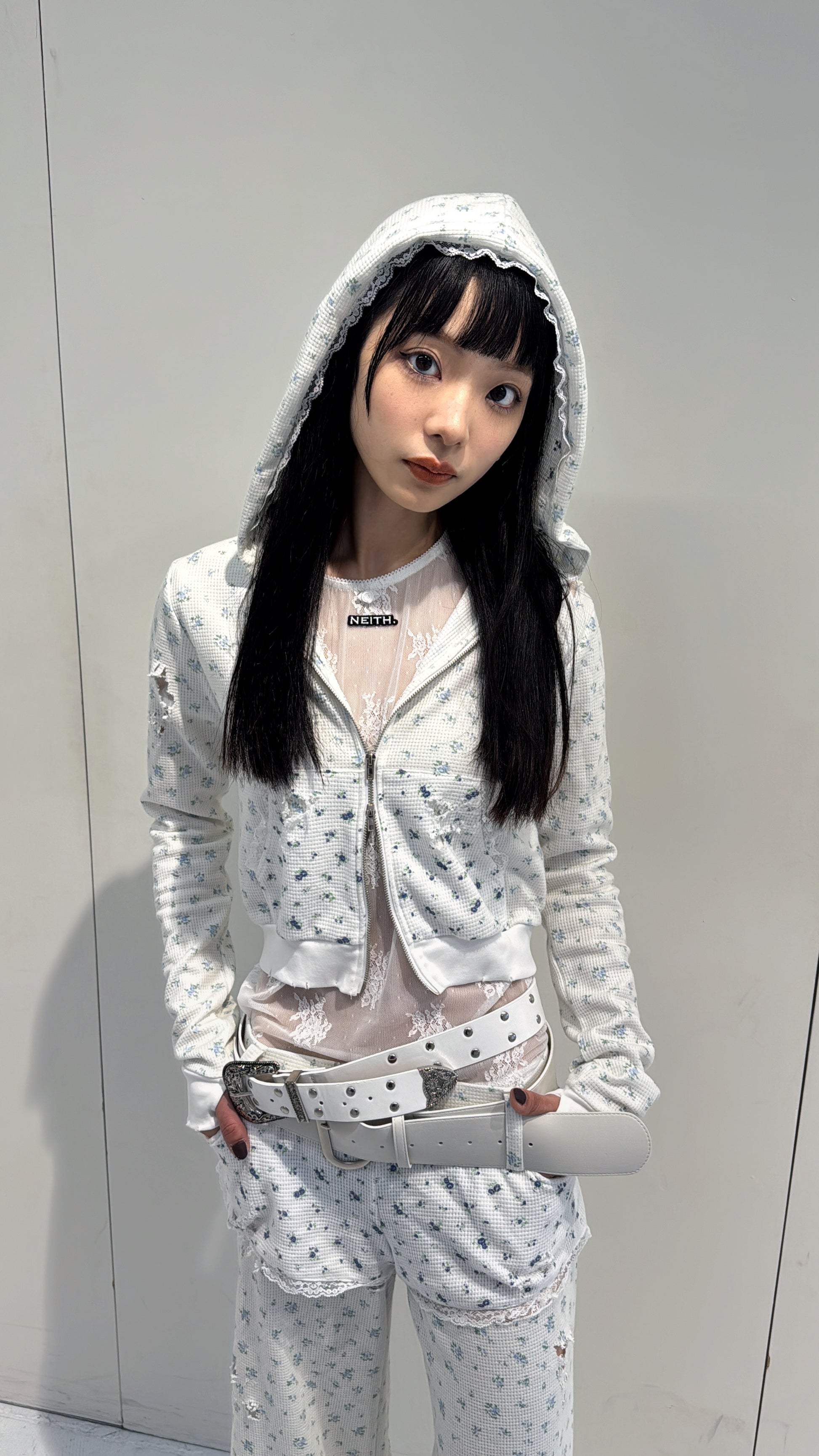 サーマル、ワッフルといわれる生地を使用しました。本来保温性が高く、冬の肌着などに用いられる素材です。今回はそのファッション性、可愛いらしさに注目し採用しました。小花柄の可愛いサーマルです。柄違いの小花柄を組み合わせています。ショートパンツの裏側には繊細なレースを使い、ダメージ加工の向こうにちらりと見え隠れします。