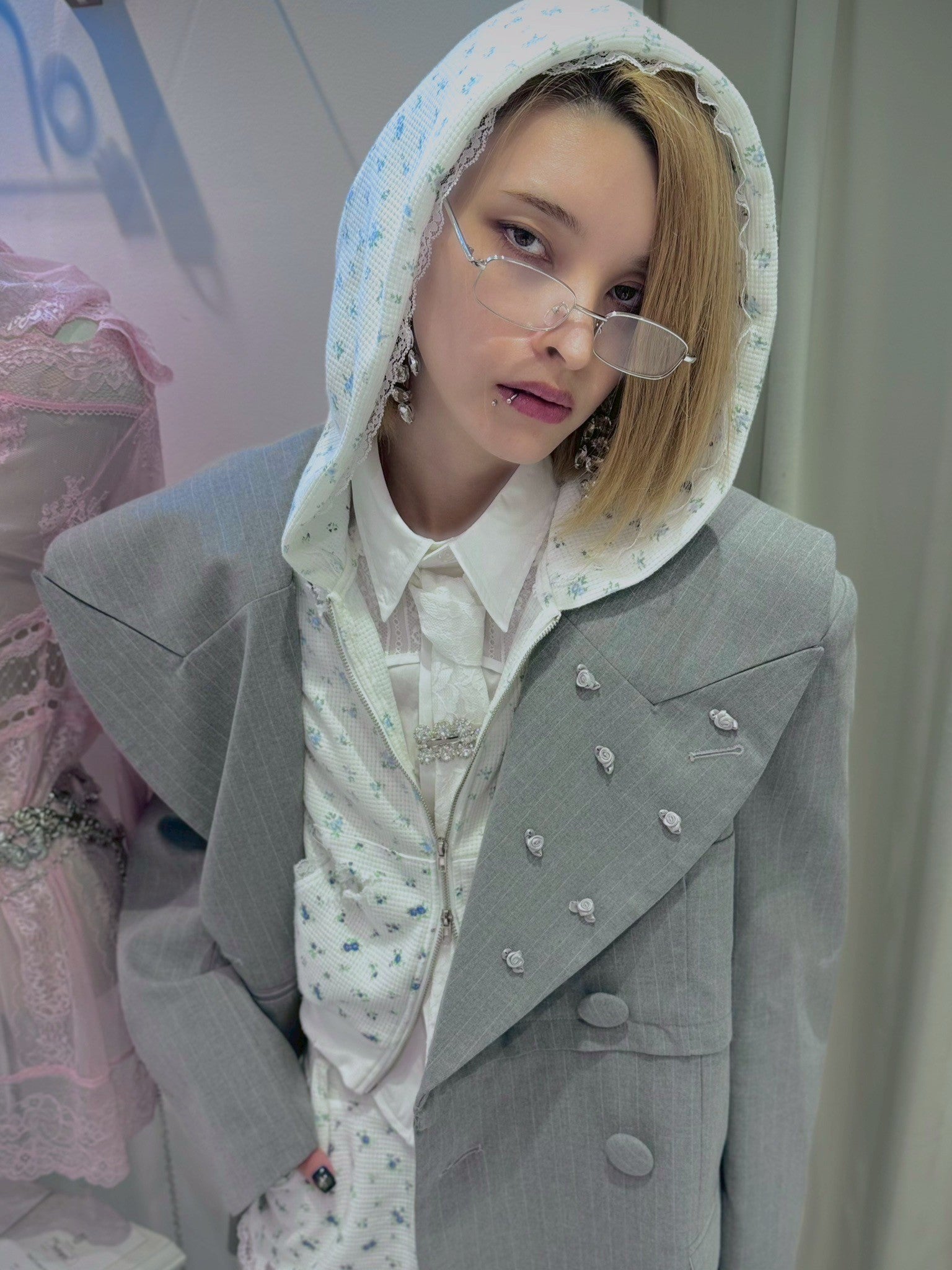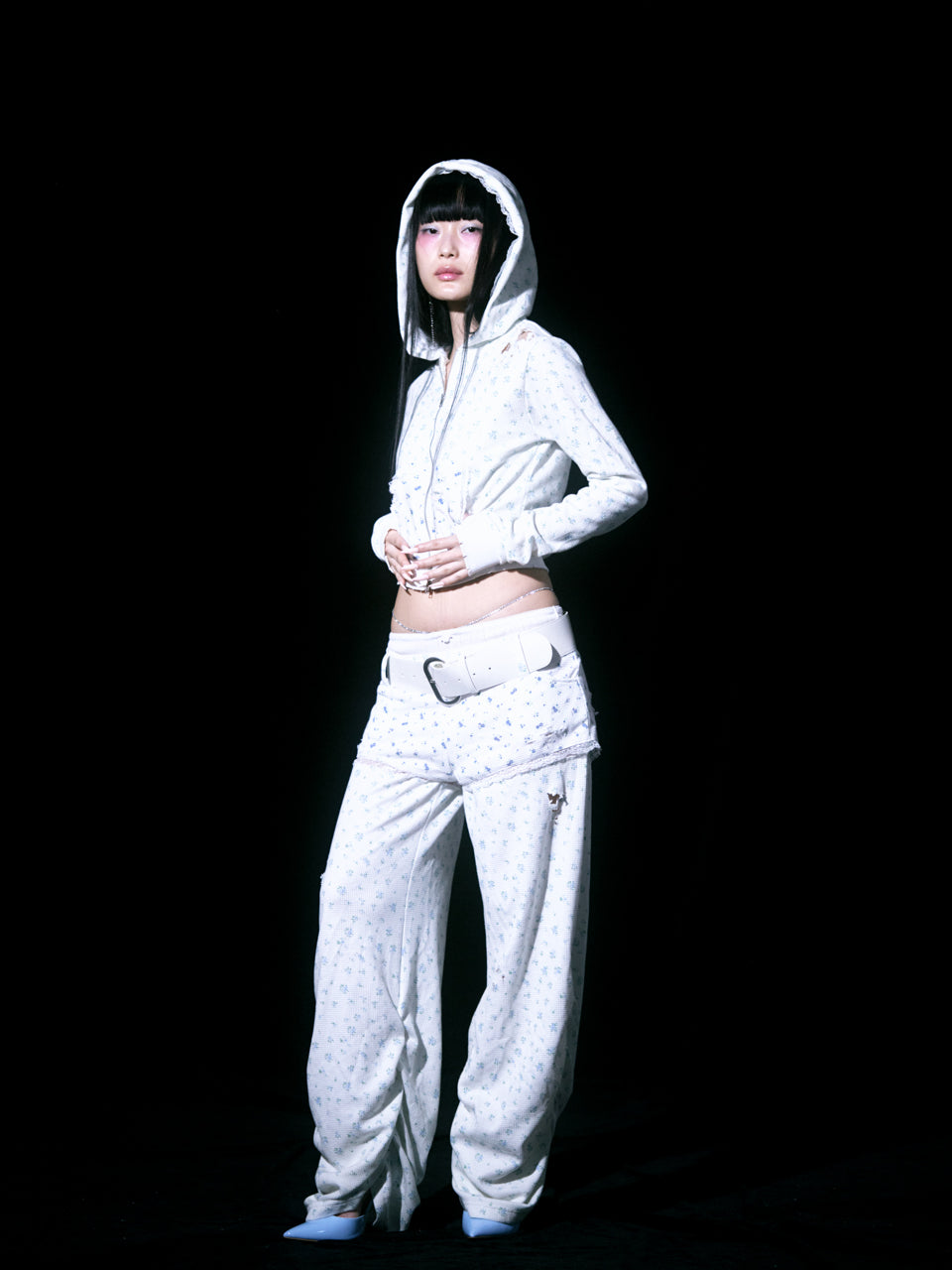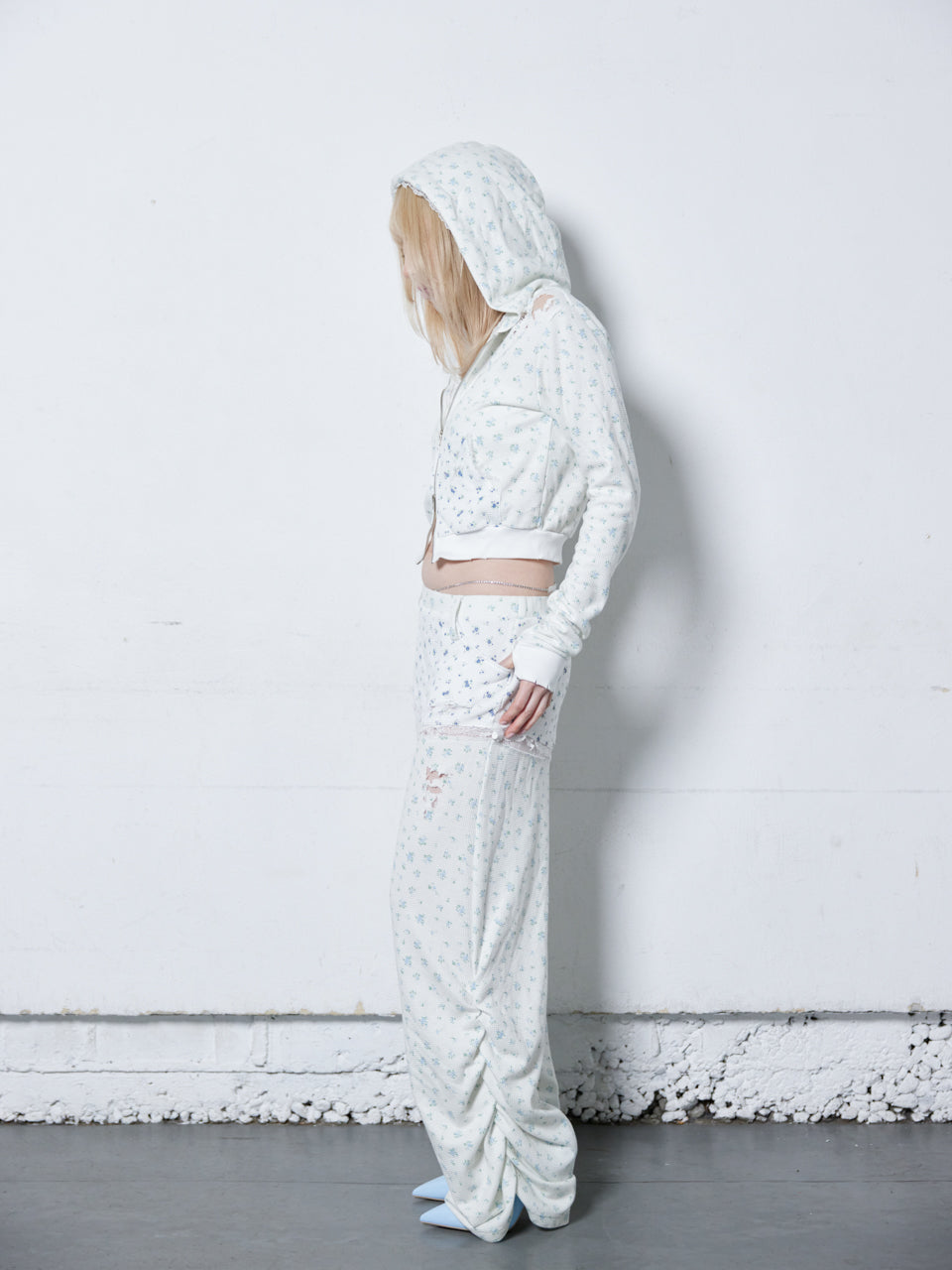 サーマル、ワッフルといわれる生地を使用しました。本来保温性が高く、冬の肌着などに用いられる素材です。今回はそのファッション性、可愛いらしさに注目し採用しました。小花柄の可愛いサーマルです。柄違いの小花柄を組み合わせています。ショートパンツの裏側には繊細なレースを使い、ダメージ加工の向こうにちらりと見え隠れします。