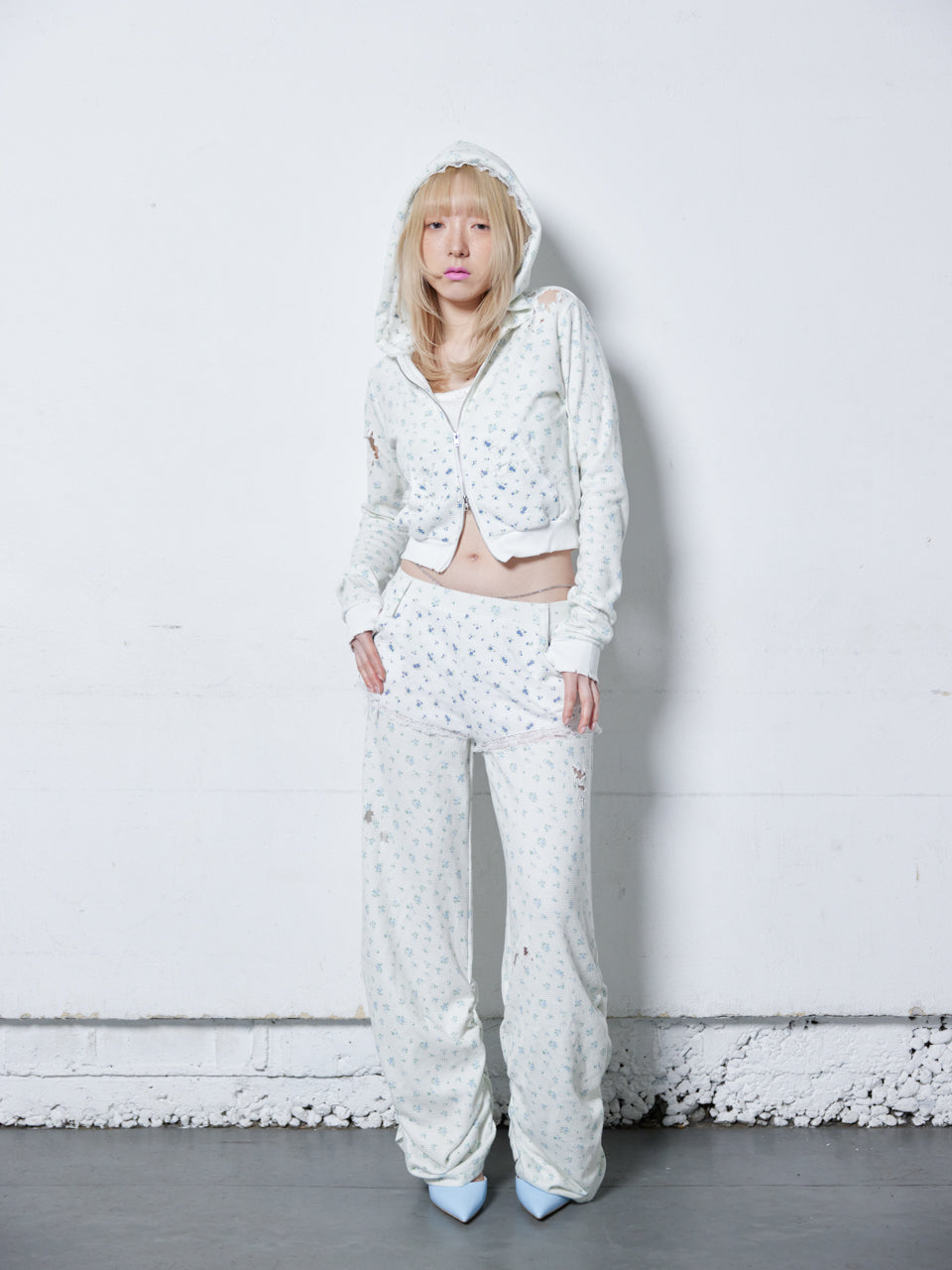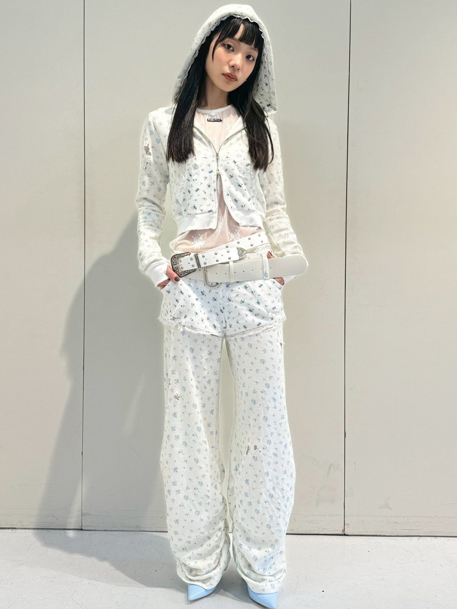 愛らしい小花柄に大胆なダメージのギャップが目を引く一着です。