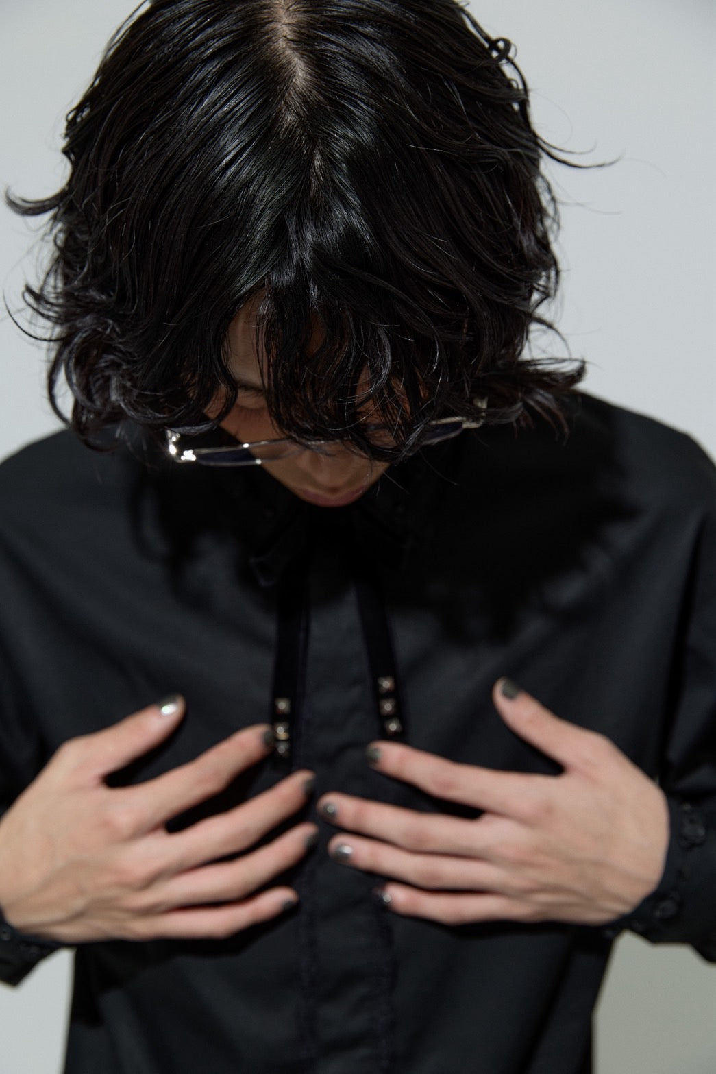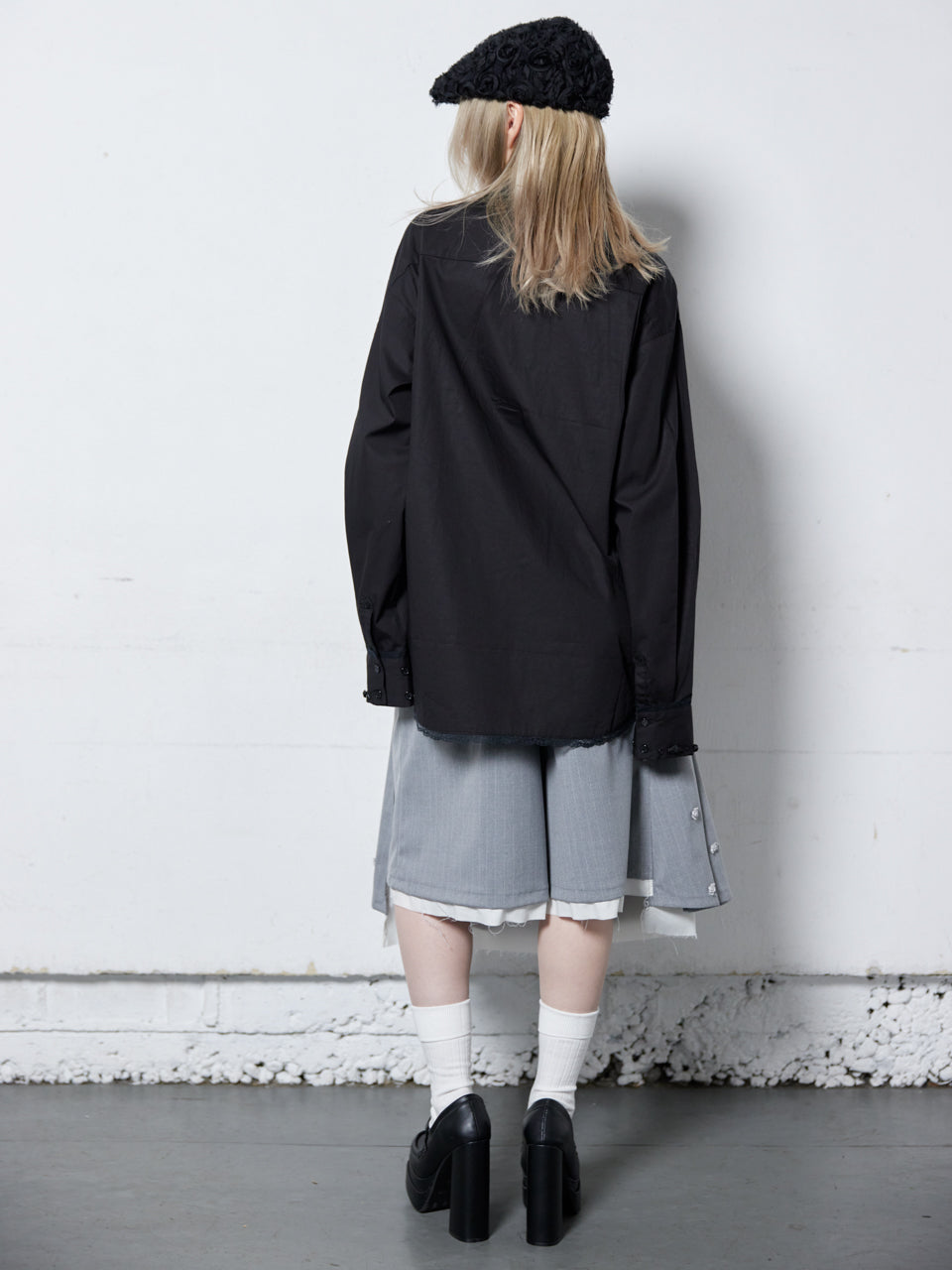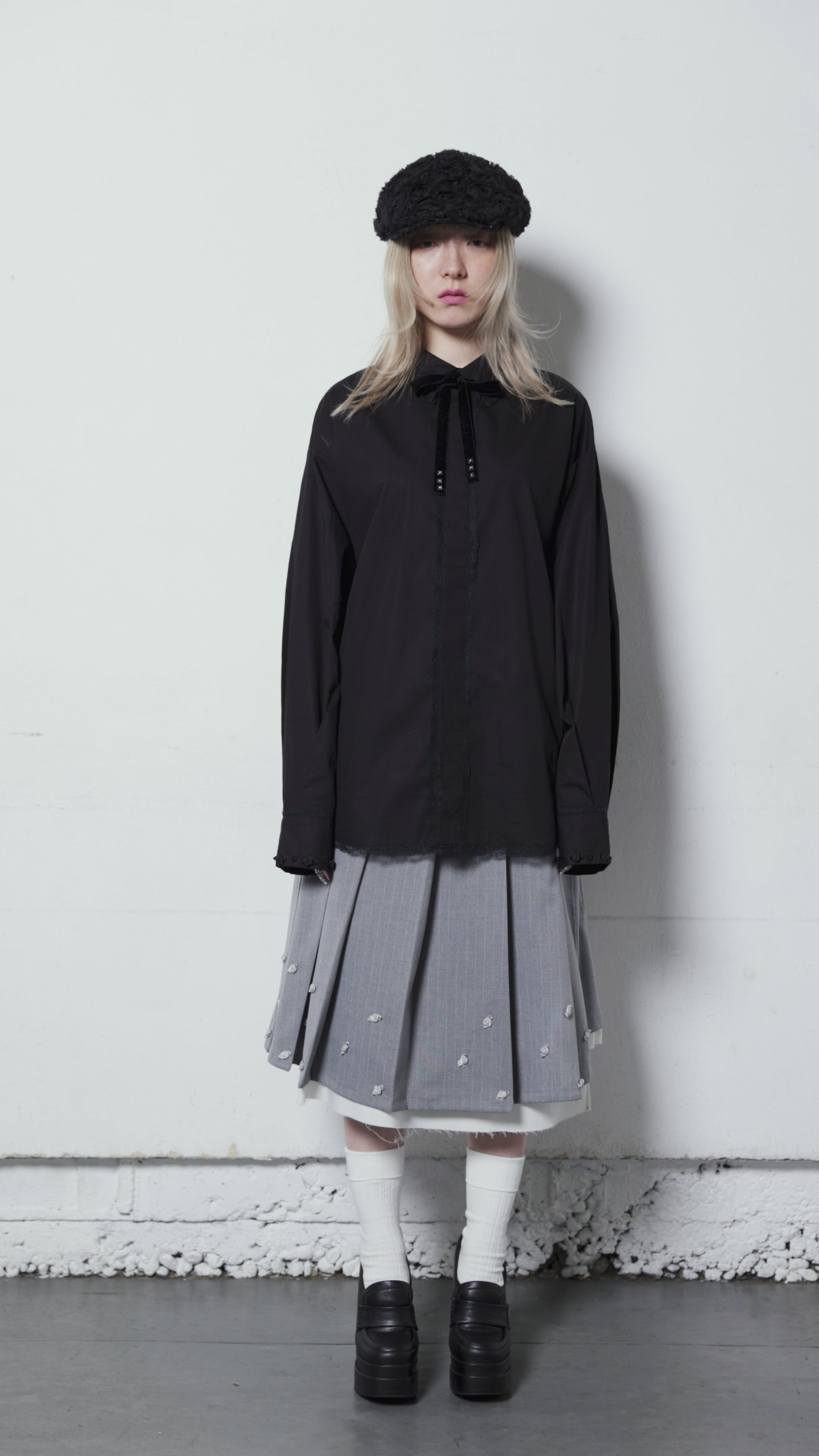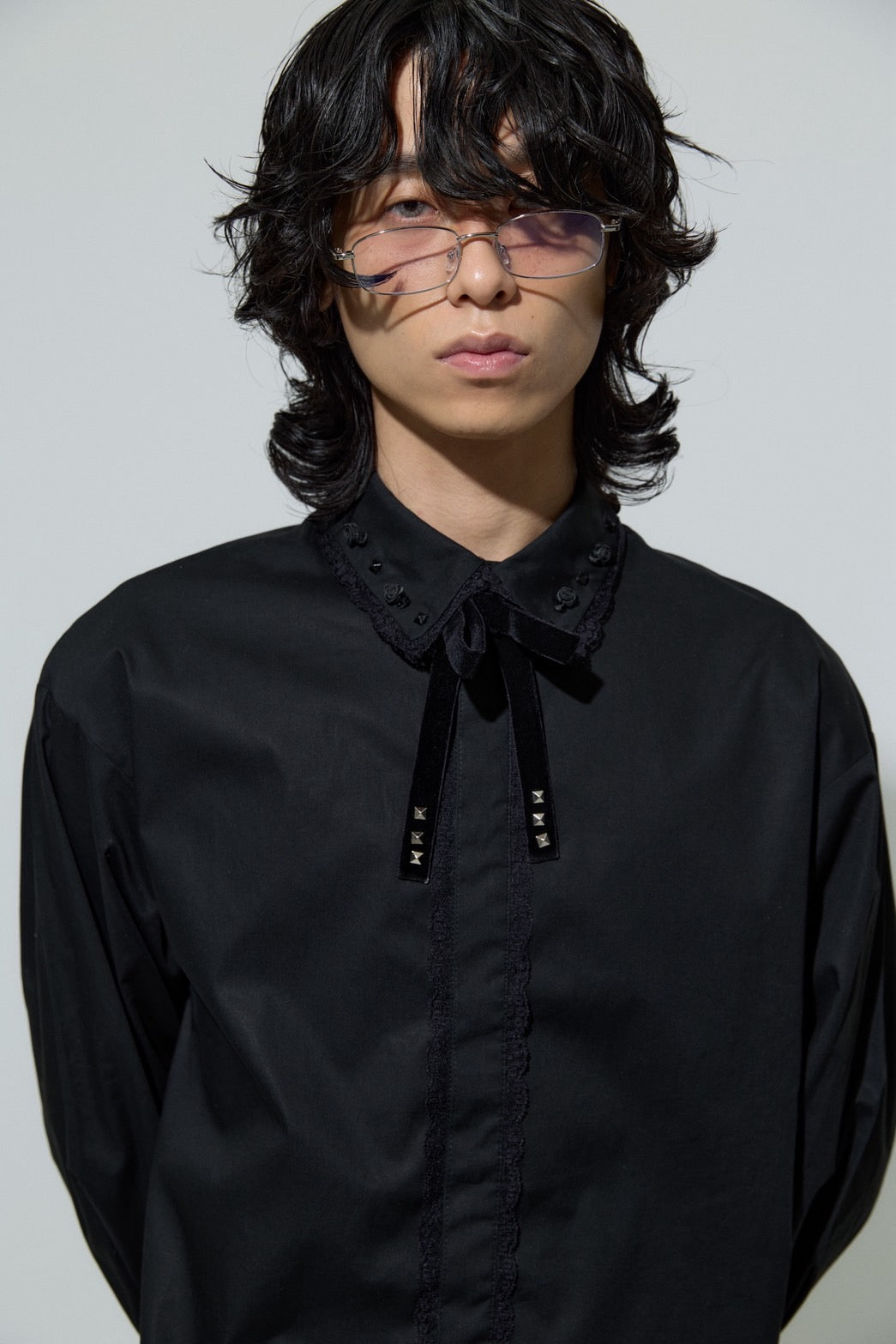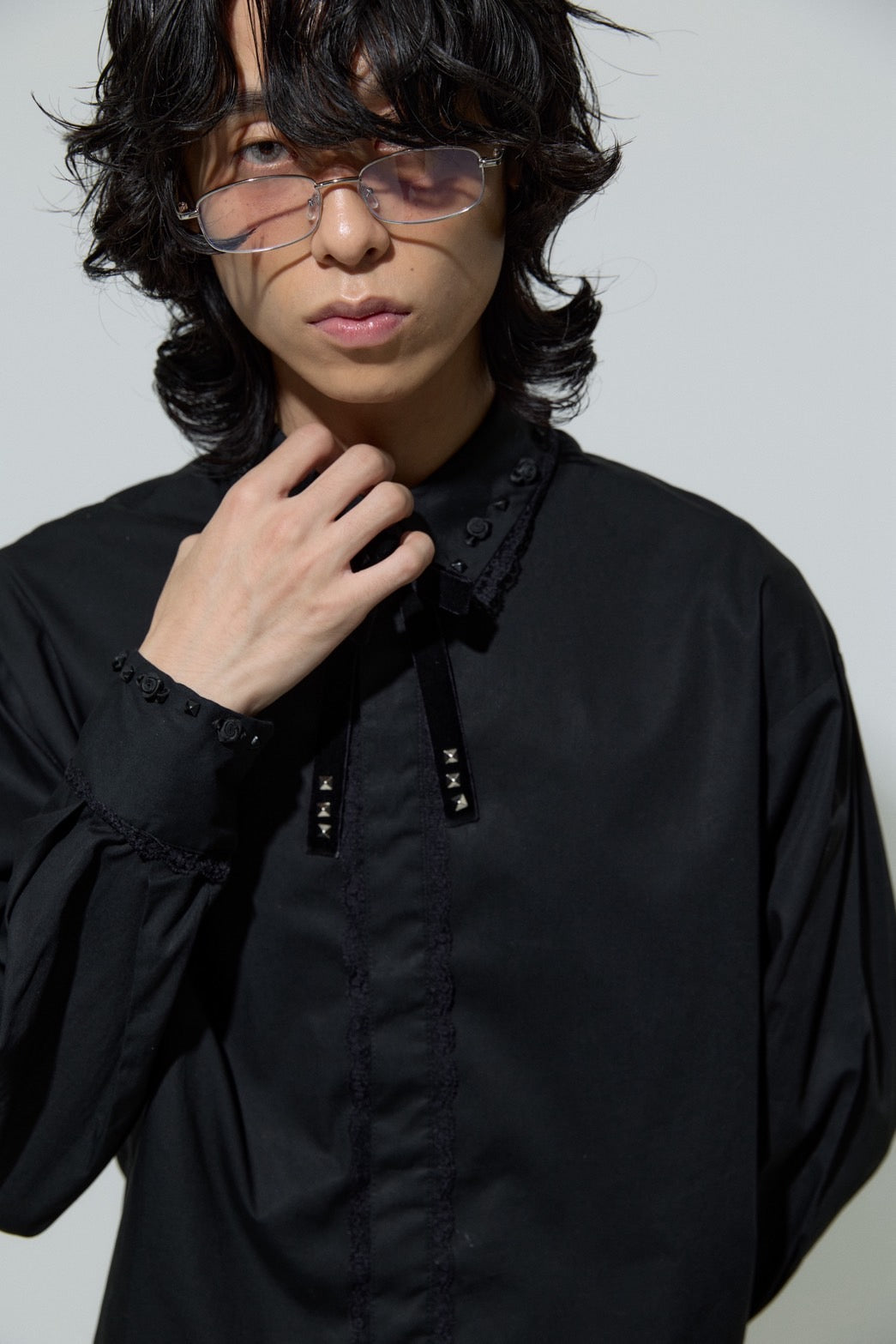Rose Pleats Skirt Pants、Stripe Lace Trousers、Too Big Stripe Jacketなどと合わせてマニッシュなスタイリングにぴったりです。また襟元のデザイン性を生かして、Tシャツやニットなどとレイヤードするのも◎。Rose Studs T-shirtsとスタイリングしていますので写真を参考にしてください。