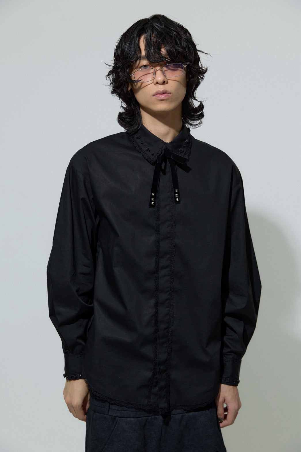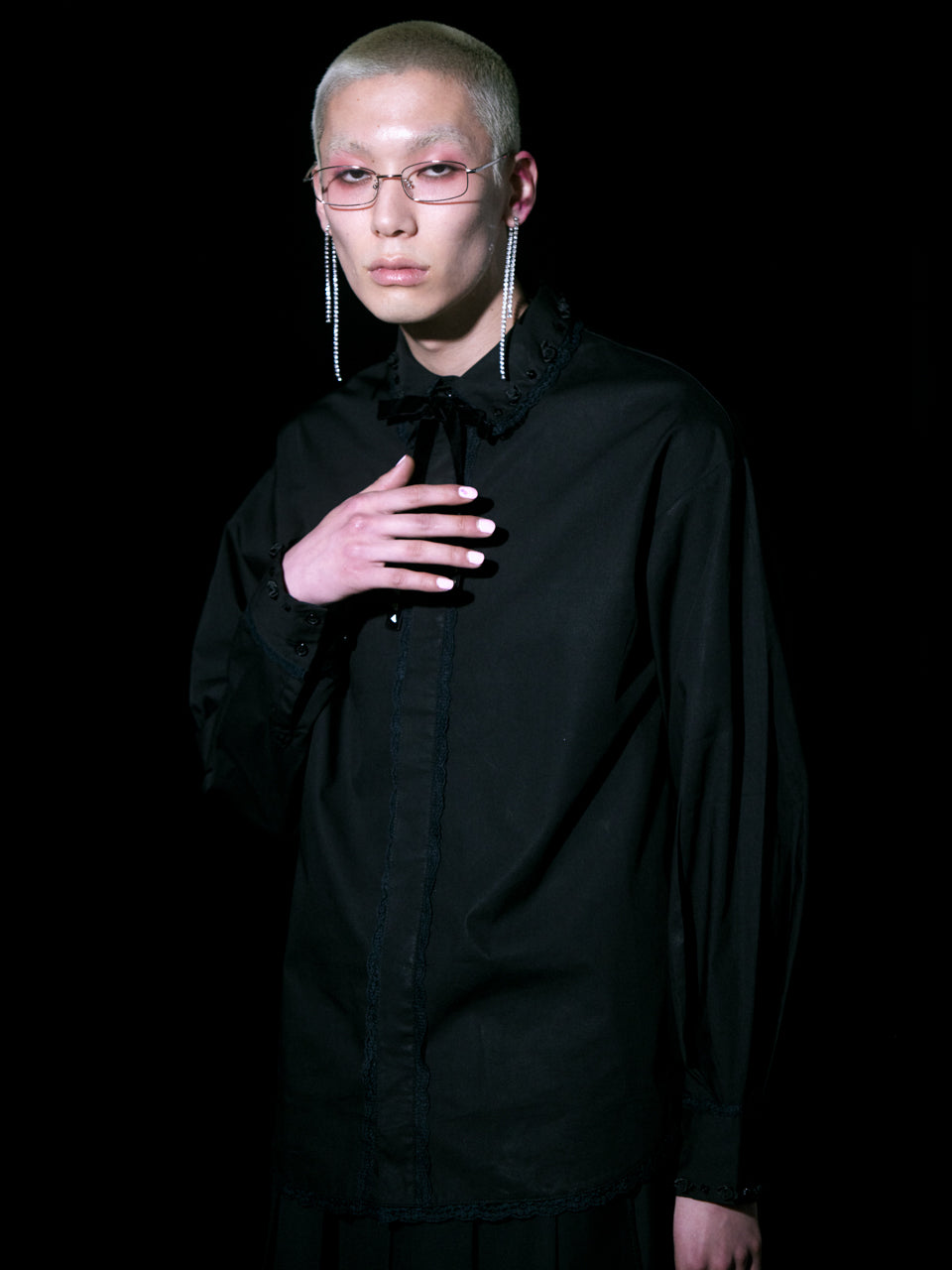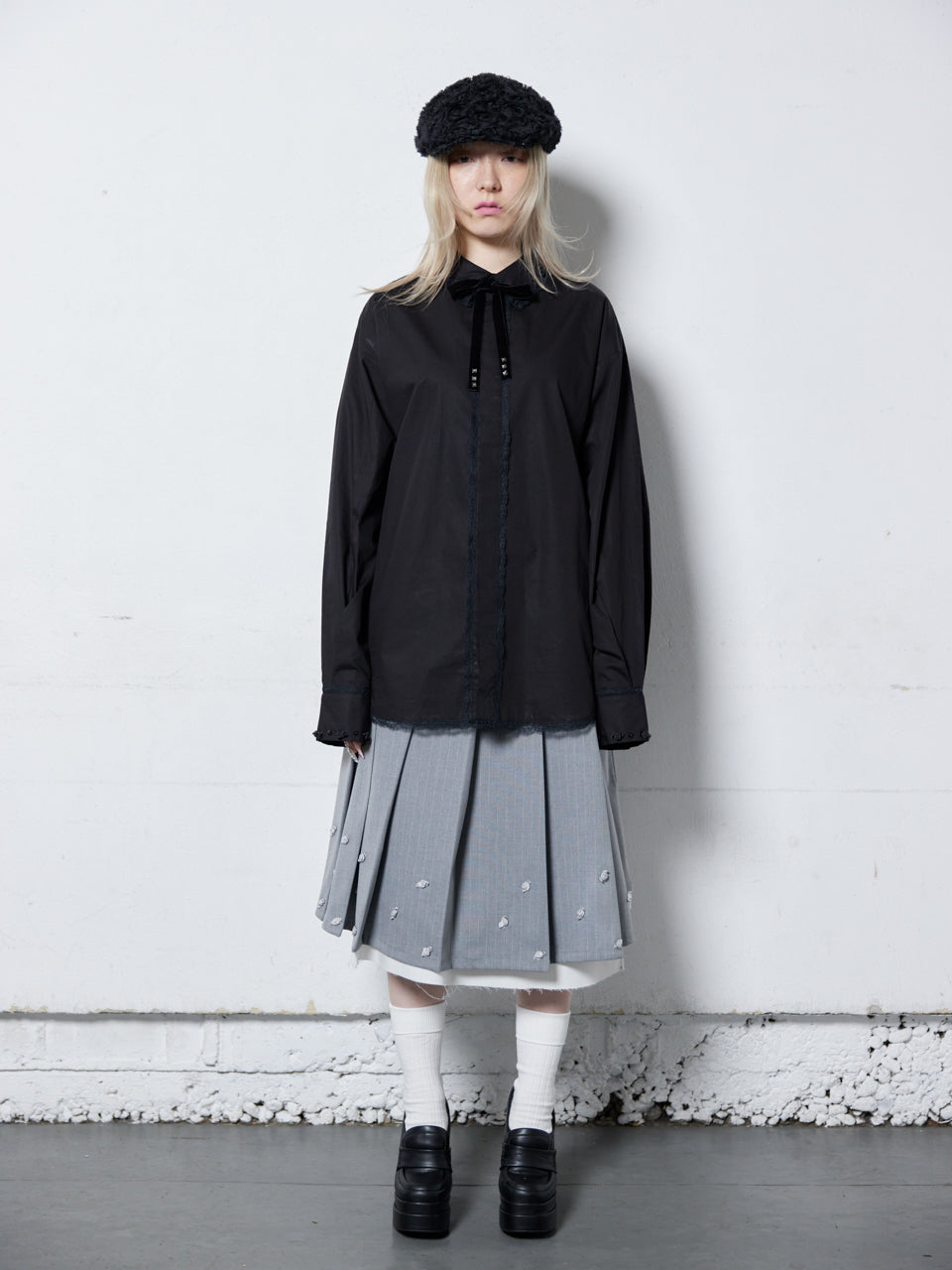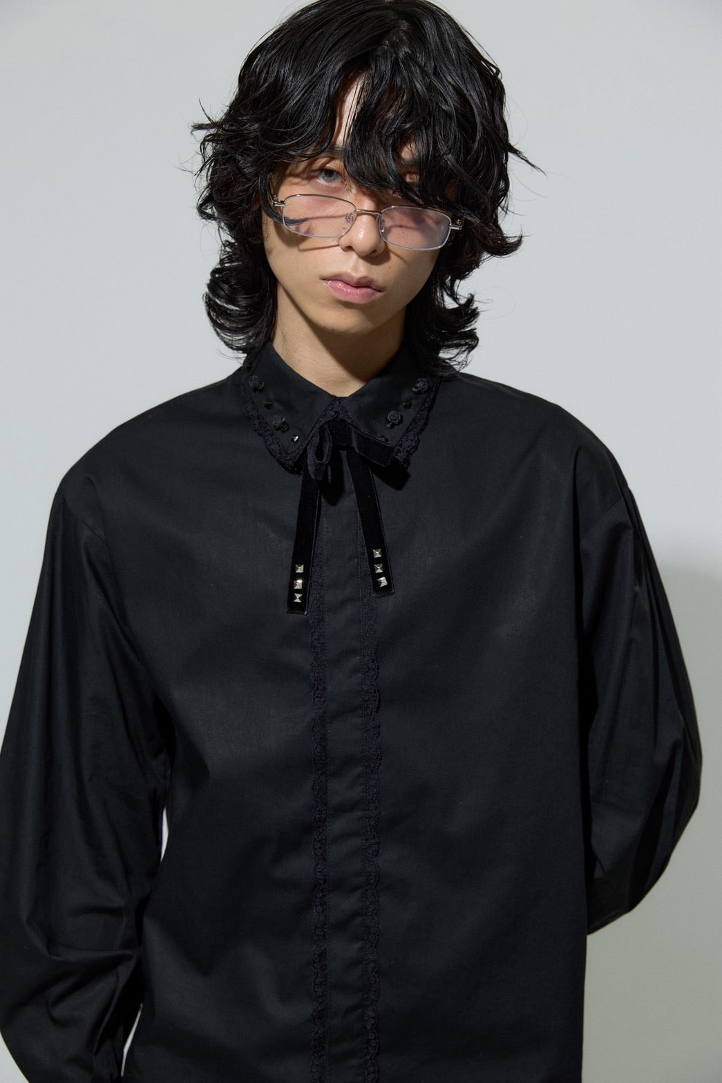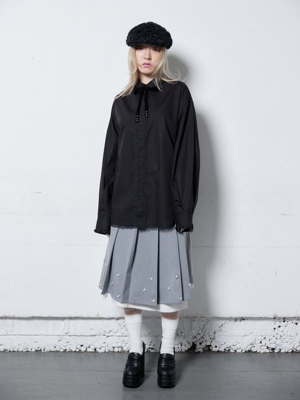 Rose Pleats Skirt Pants、Stripe Lace Trousers、Too Big Stripe Jacketなどと合わせてマニッシュなスタイリングにぴったりです。また襟元のデザイン性を生かして、Tシャツやニットなどとレイヤードするのも◎。Rose Studs T-shirtsとスタイリングしていますので写真を参考にしてください。