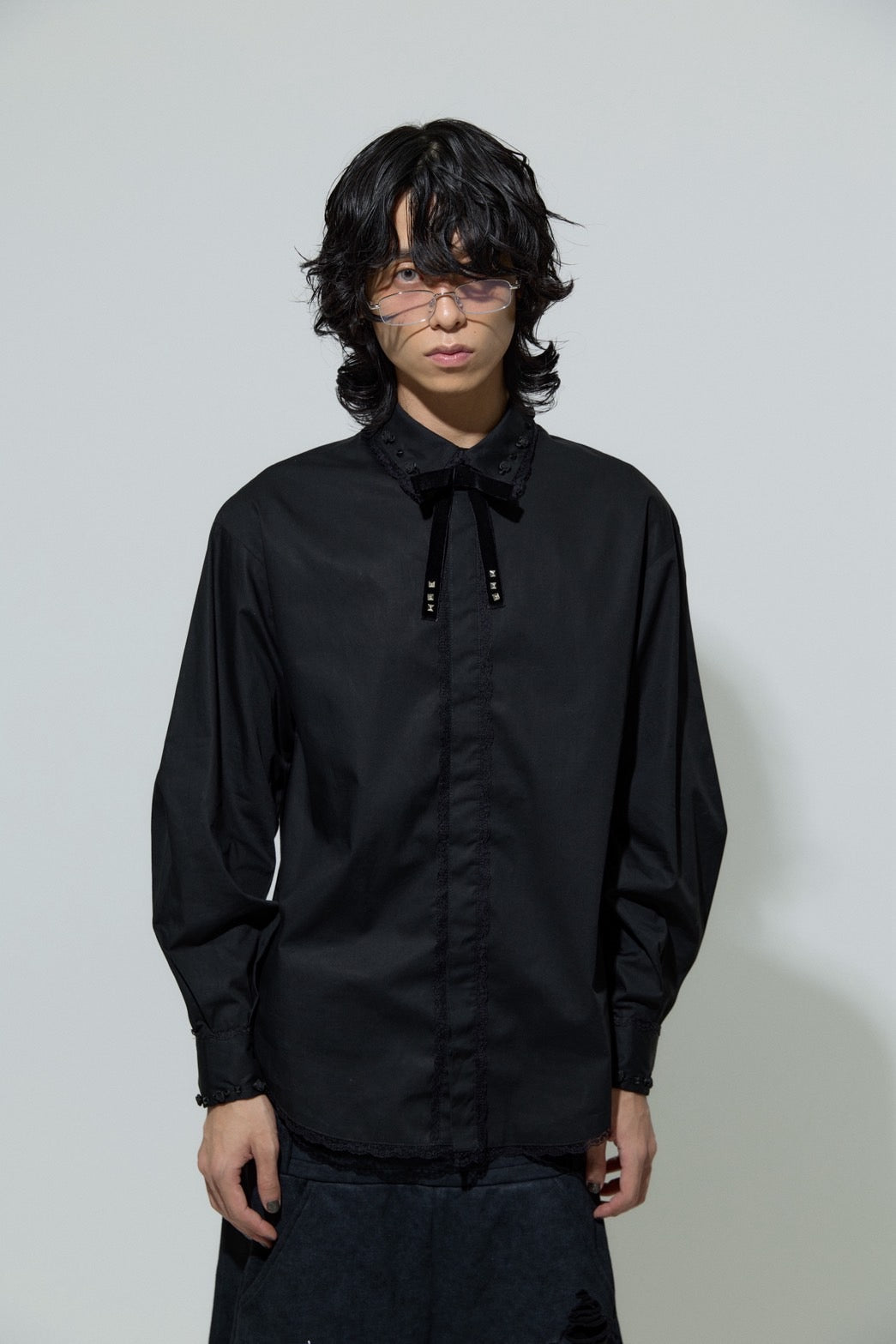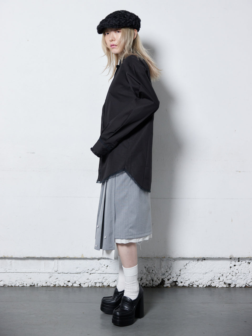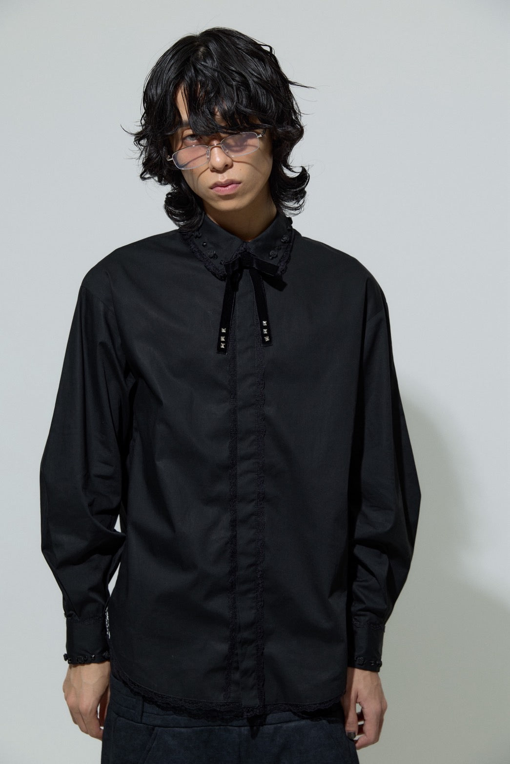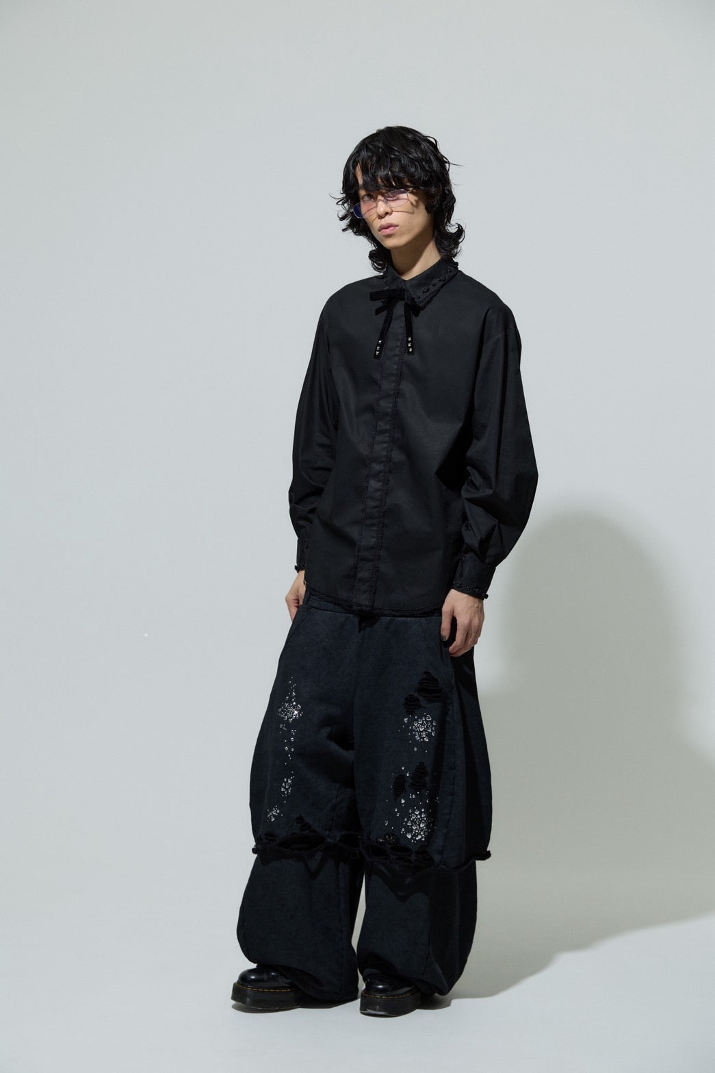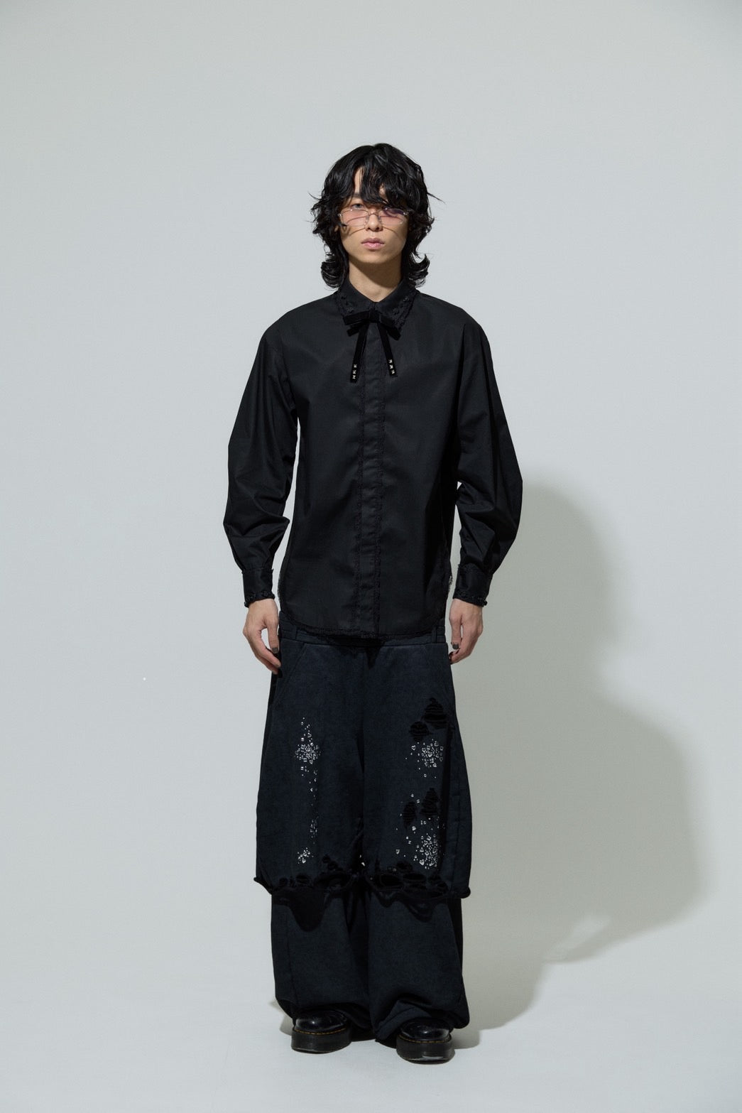 Rose Pleats Skirt Pants、Stripe Lace Trousers、Too Big Stripe Jacketなどと合わせてマニッシュなスタイリングにぴったりです。また襟元のデザイン性を生かして、Tシャツやニットなどとレイヤードするのも◎。Rose Studs T-shirtsとスタイリングしていますので写真を参考にしてください。