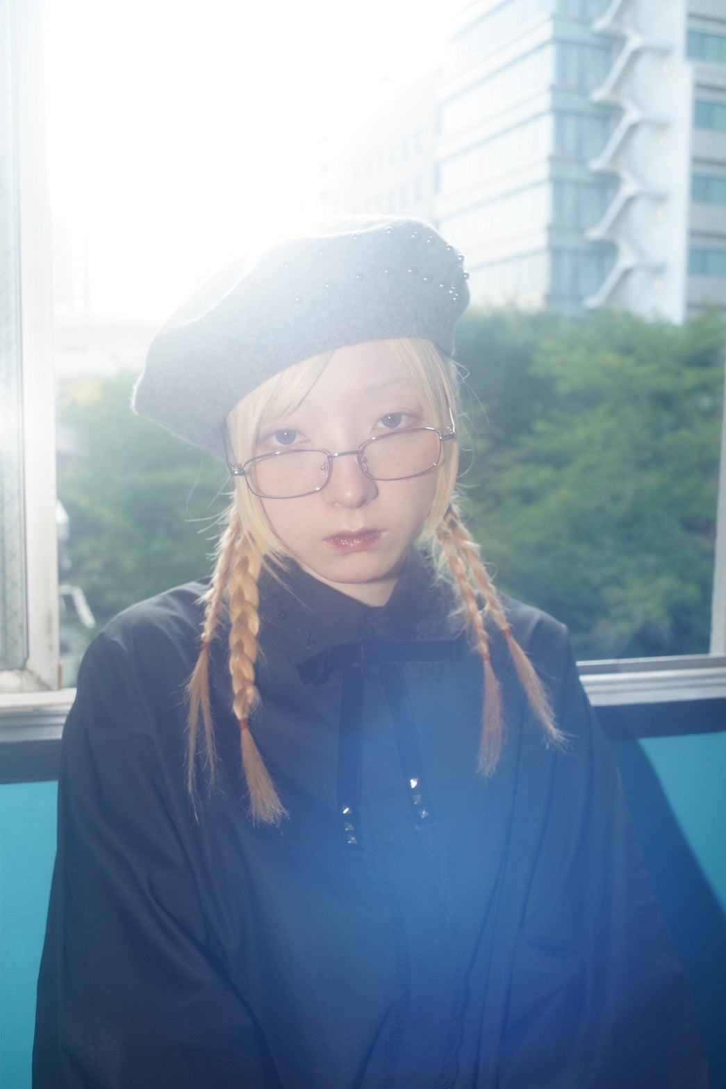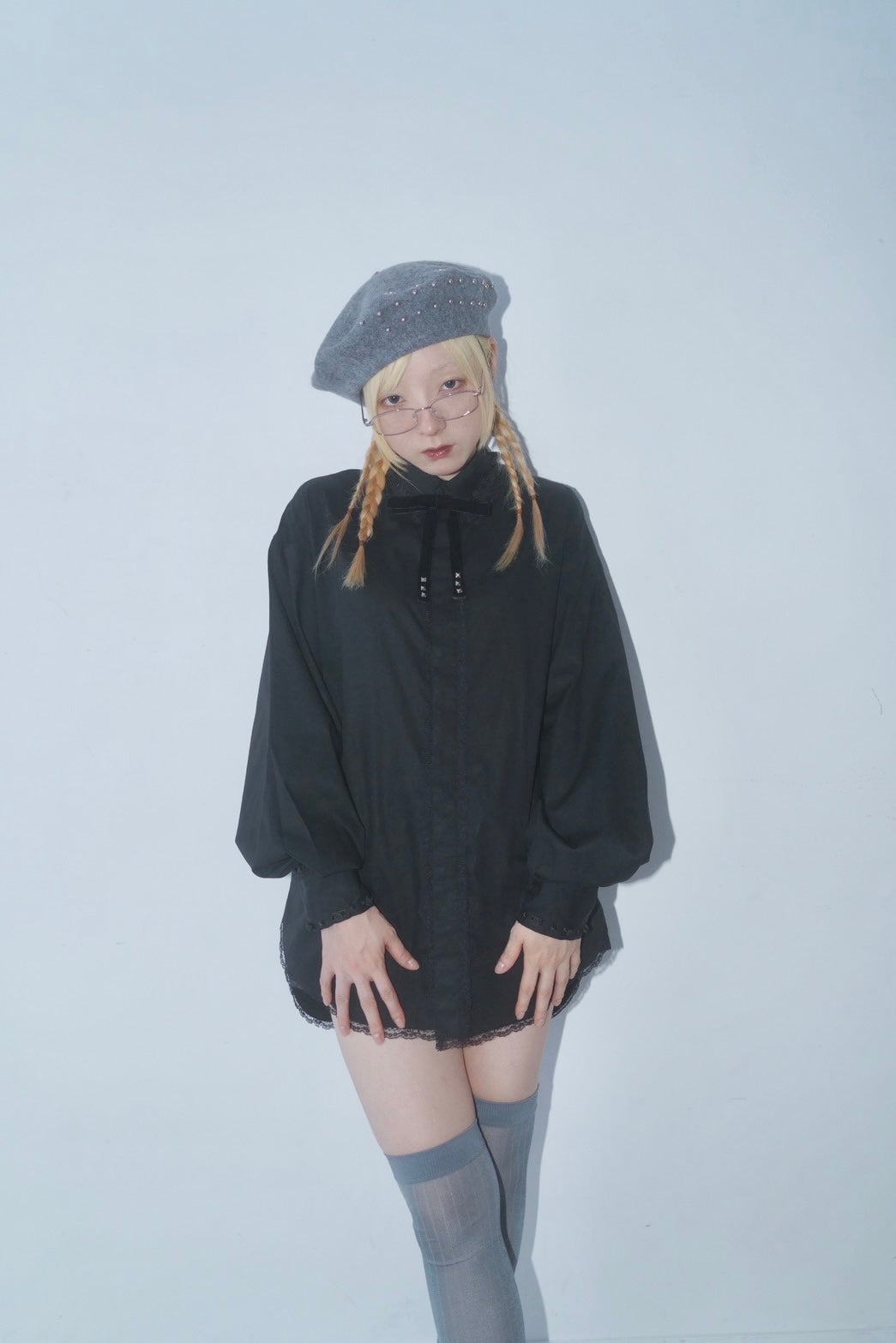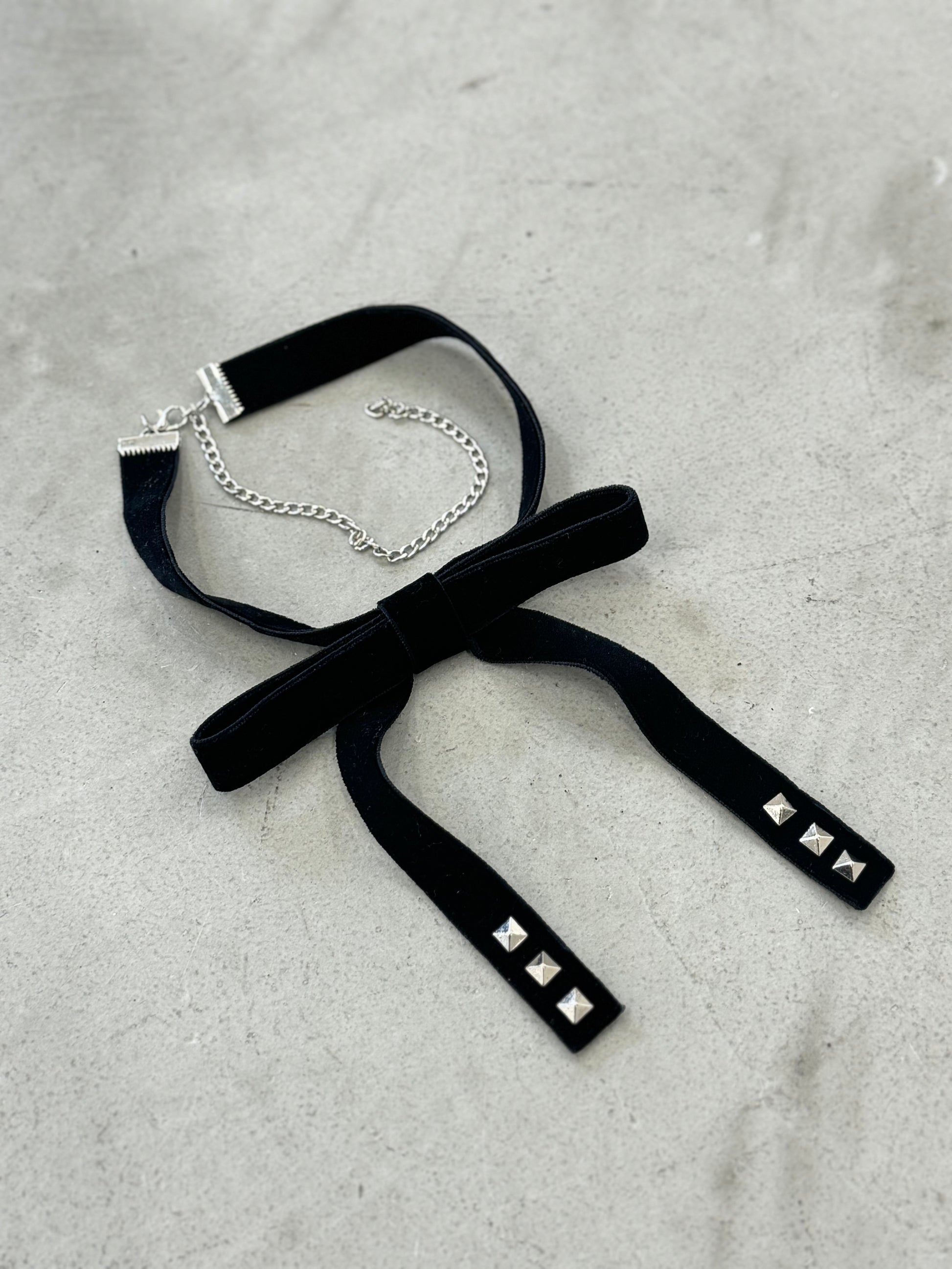 デザインポイントは言わずもがなの襟元。配色ブラックのベロアリボンタイが着こなしのアクセントに。リボンタイはネックレスのような仕様になっており単品でチョーカーのように使うこともできます。