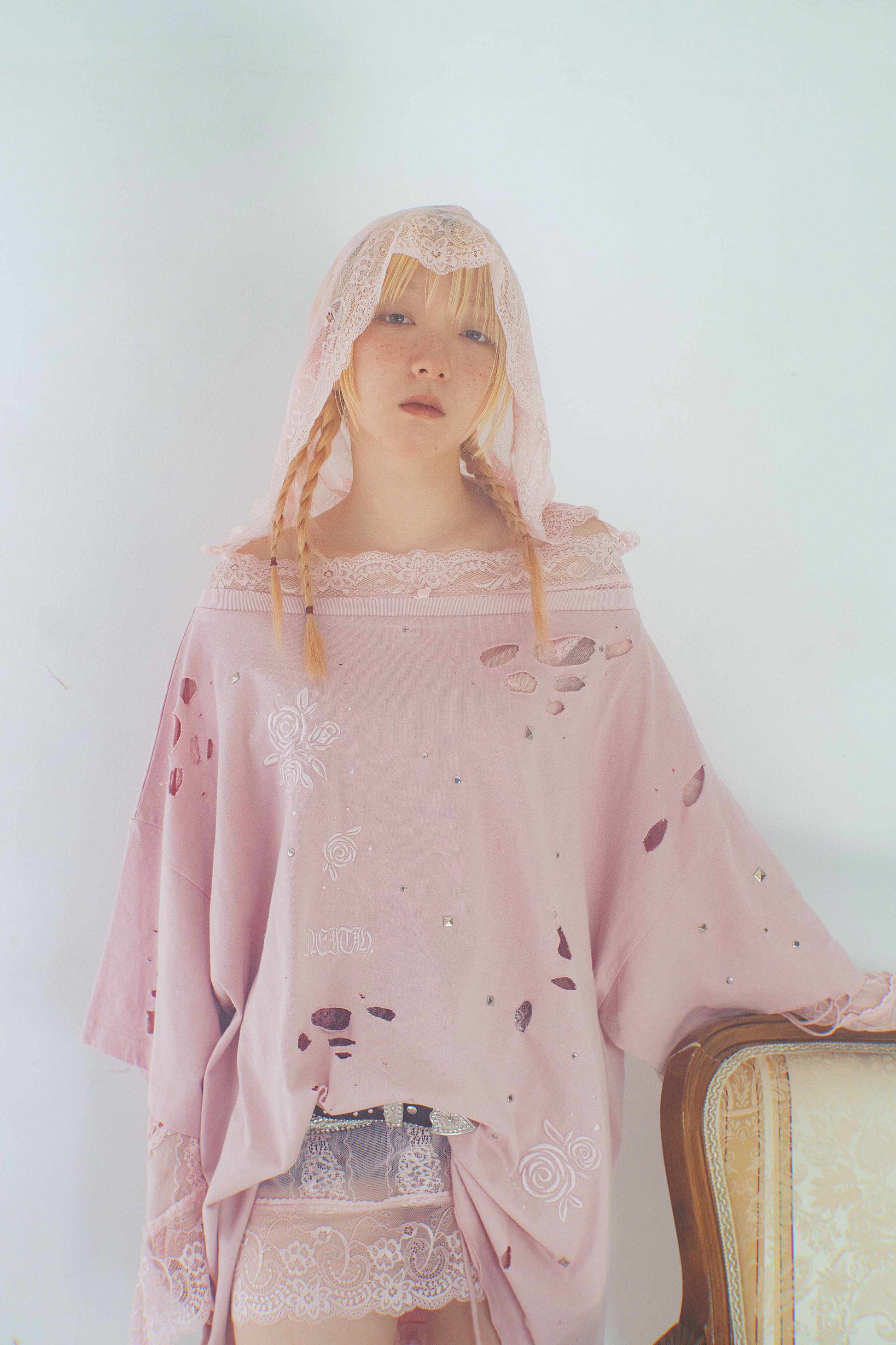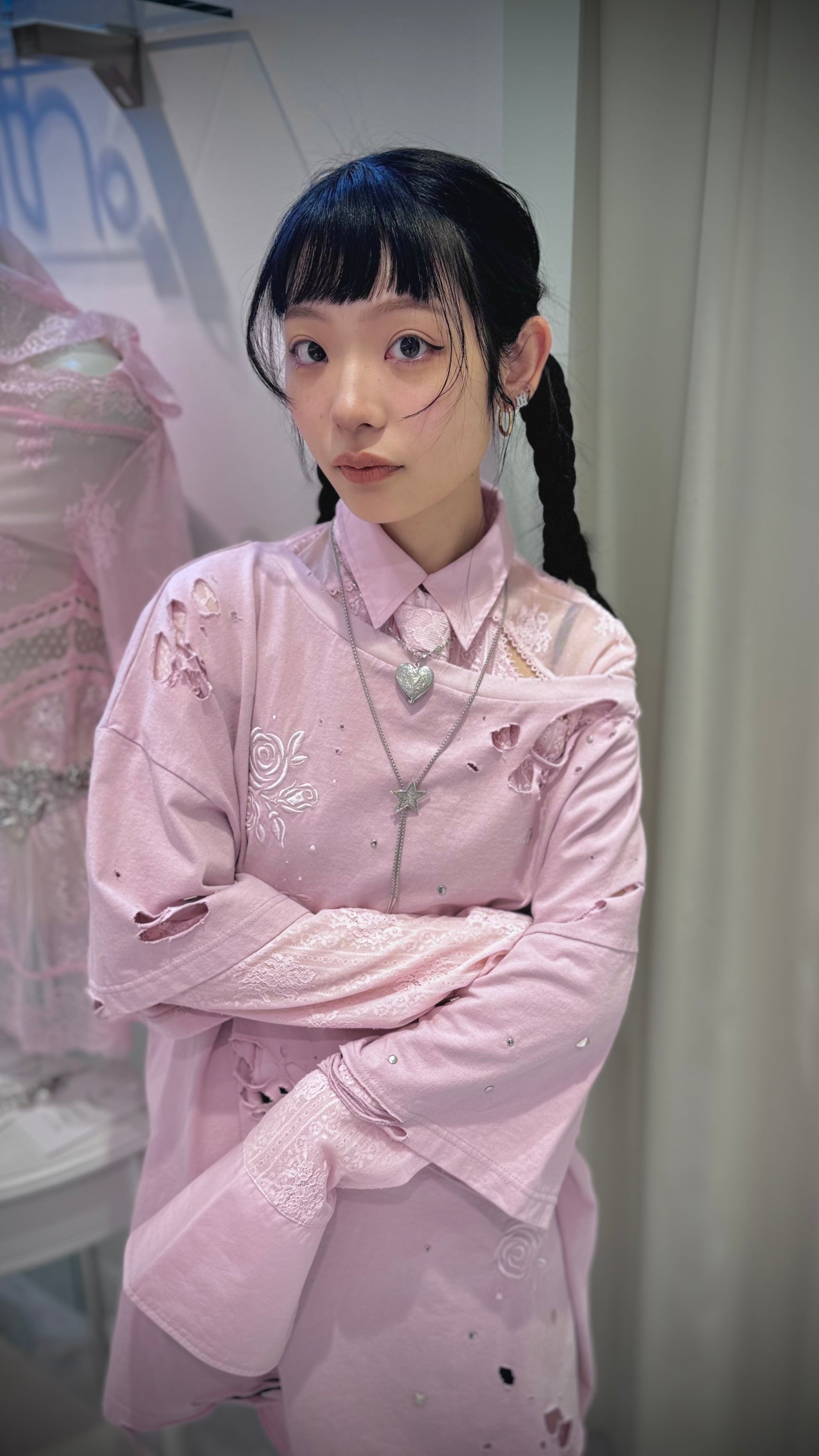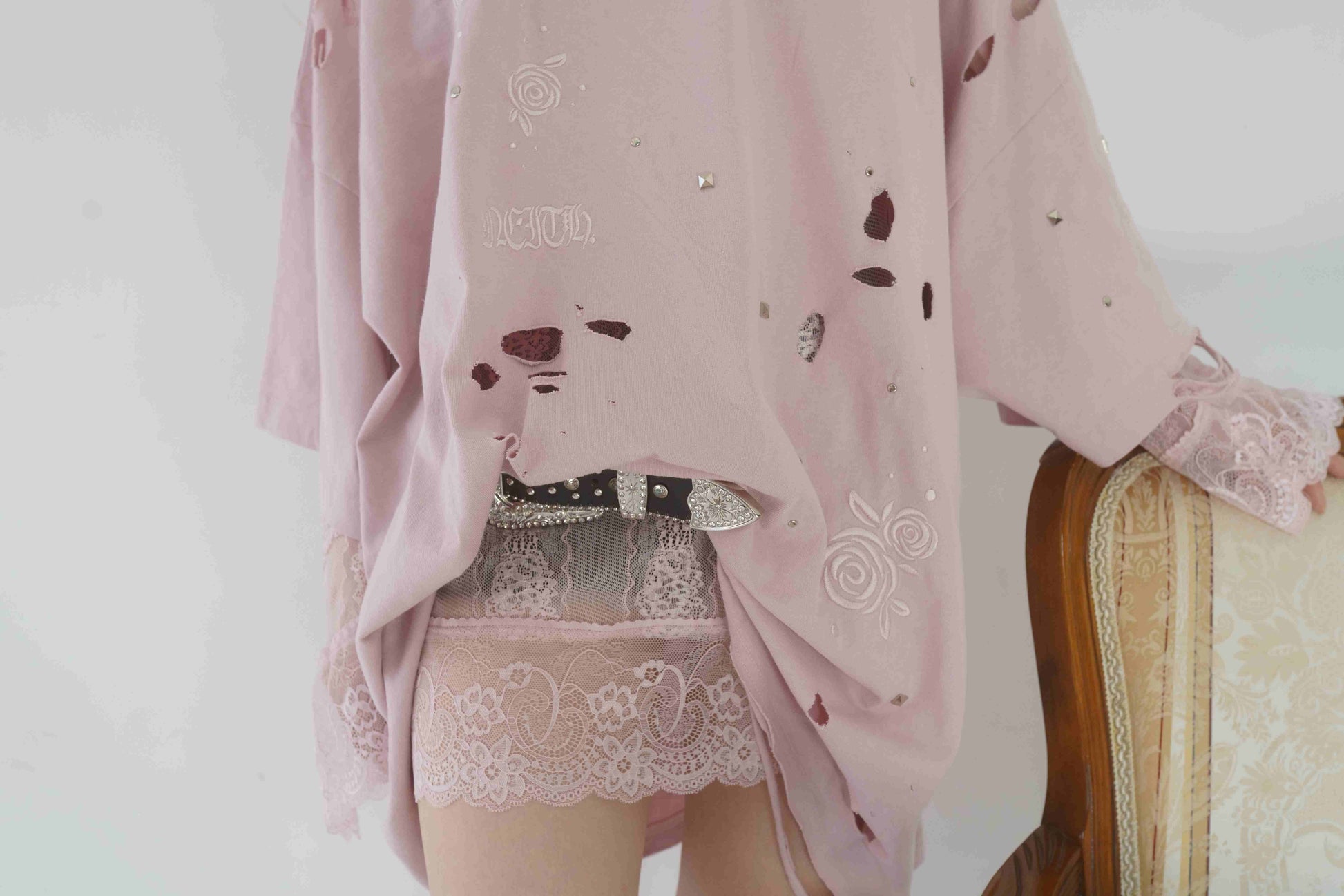 激しいダメージ加工と同色の刺繍でレースをイメージしました。
