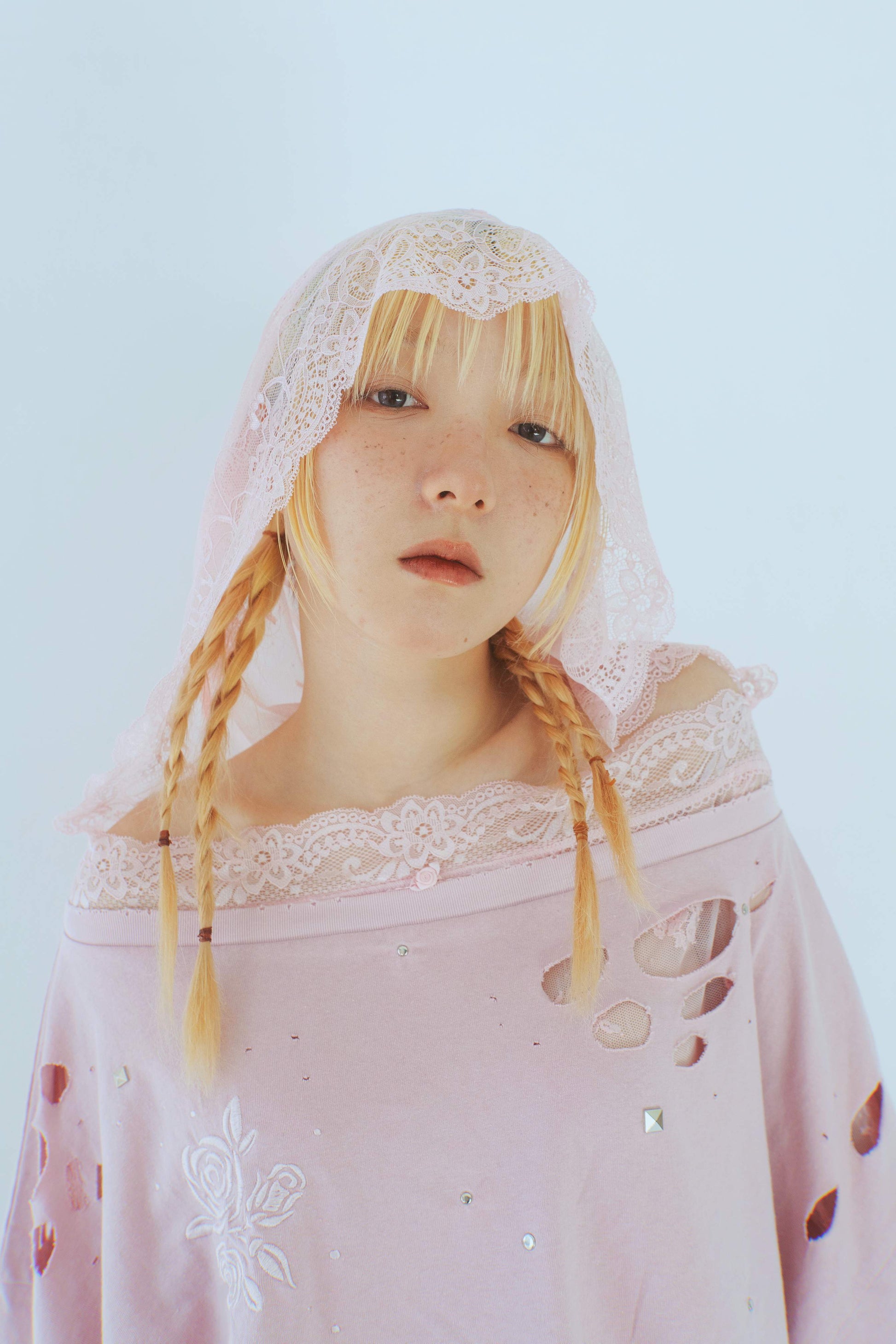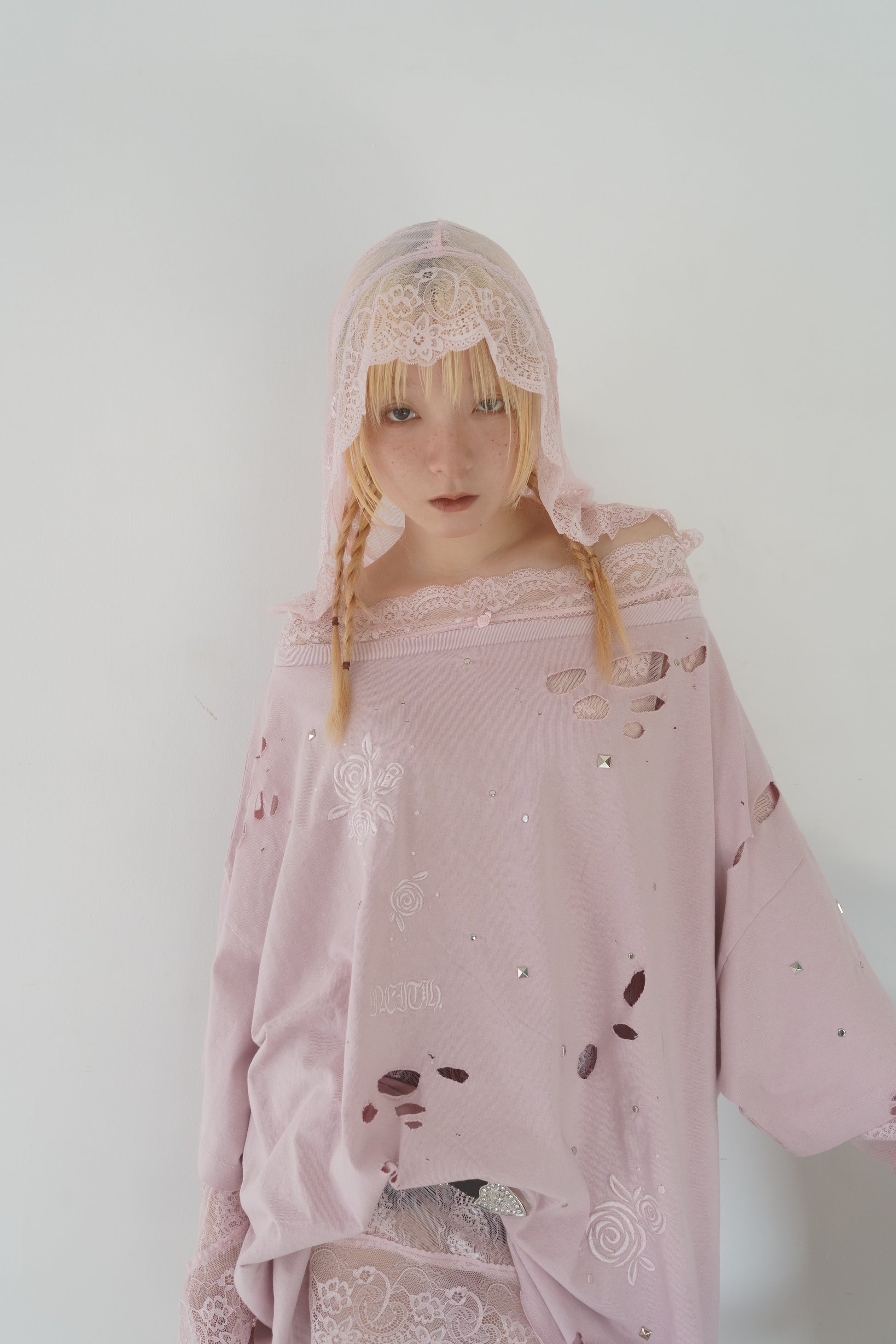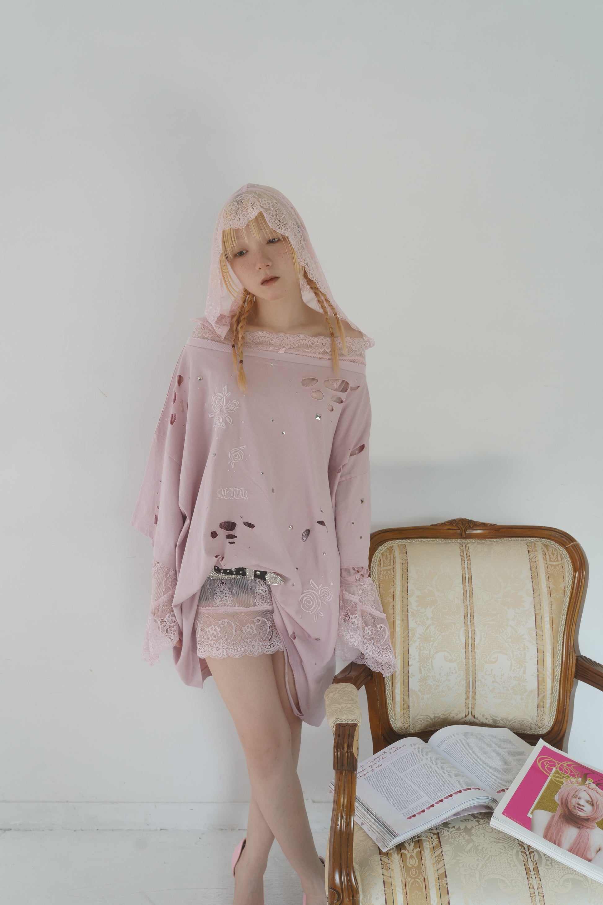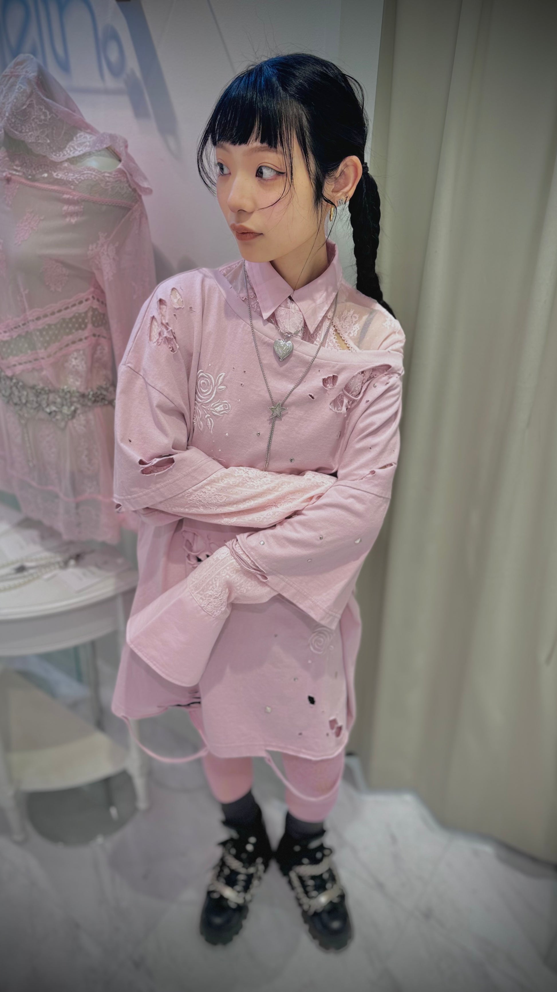 激しいダメージ加工と同色の刺繍でレースをイメージしました。