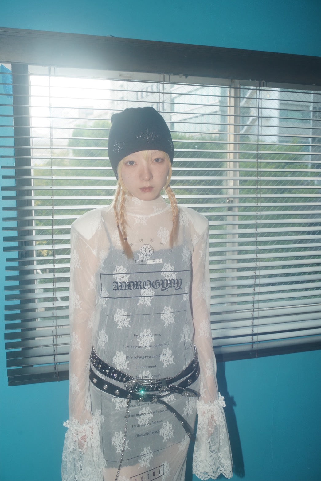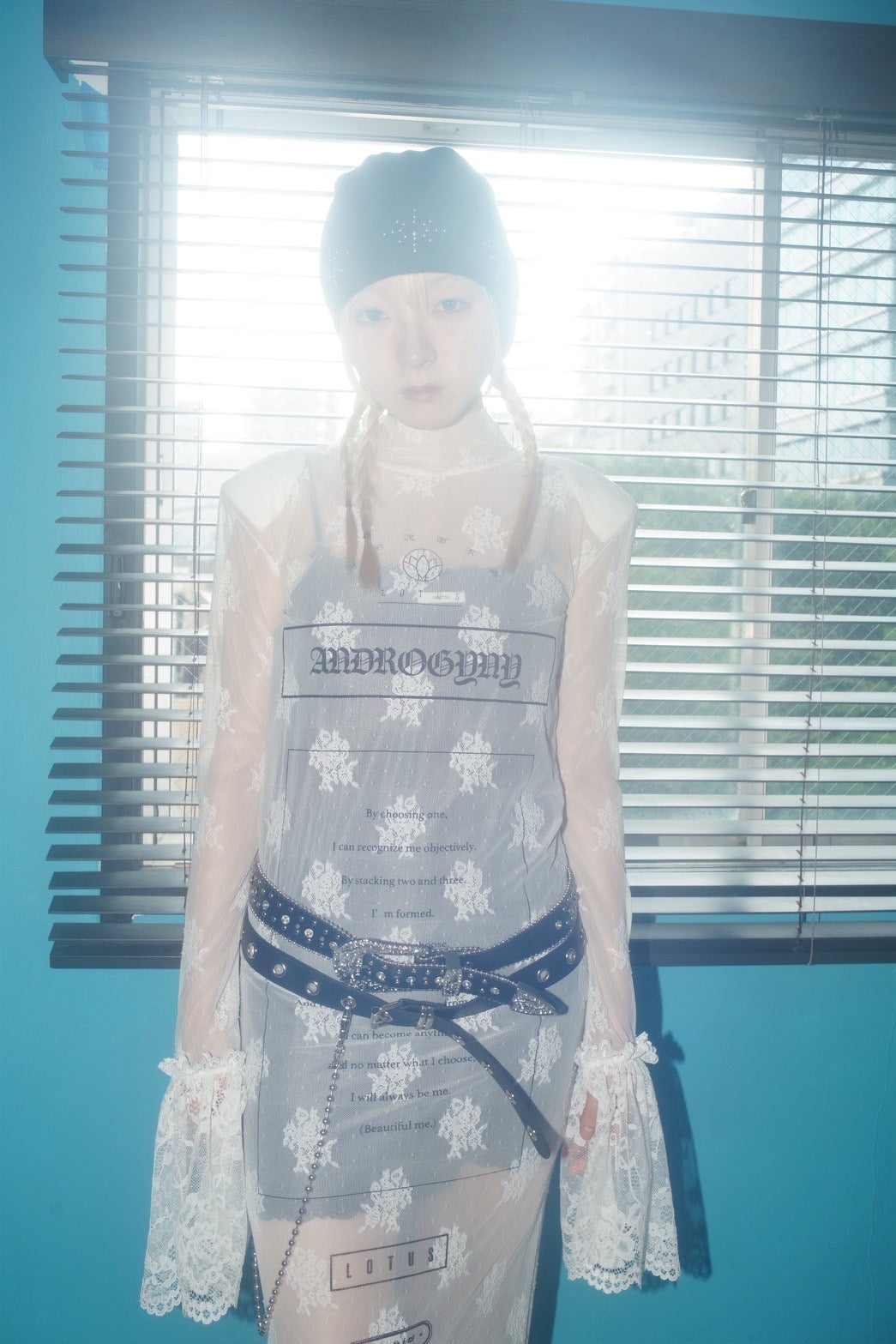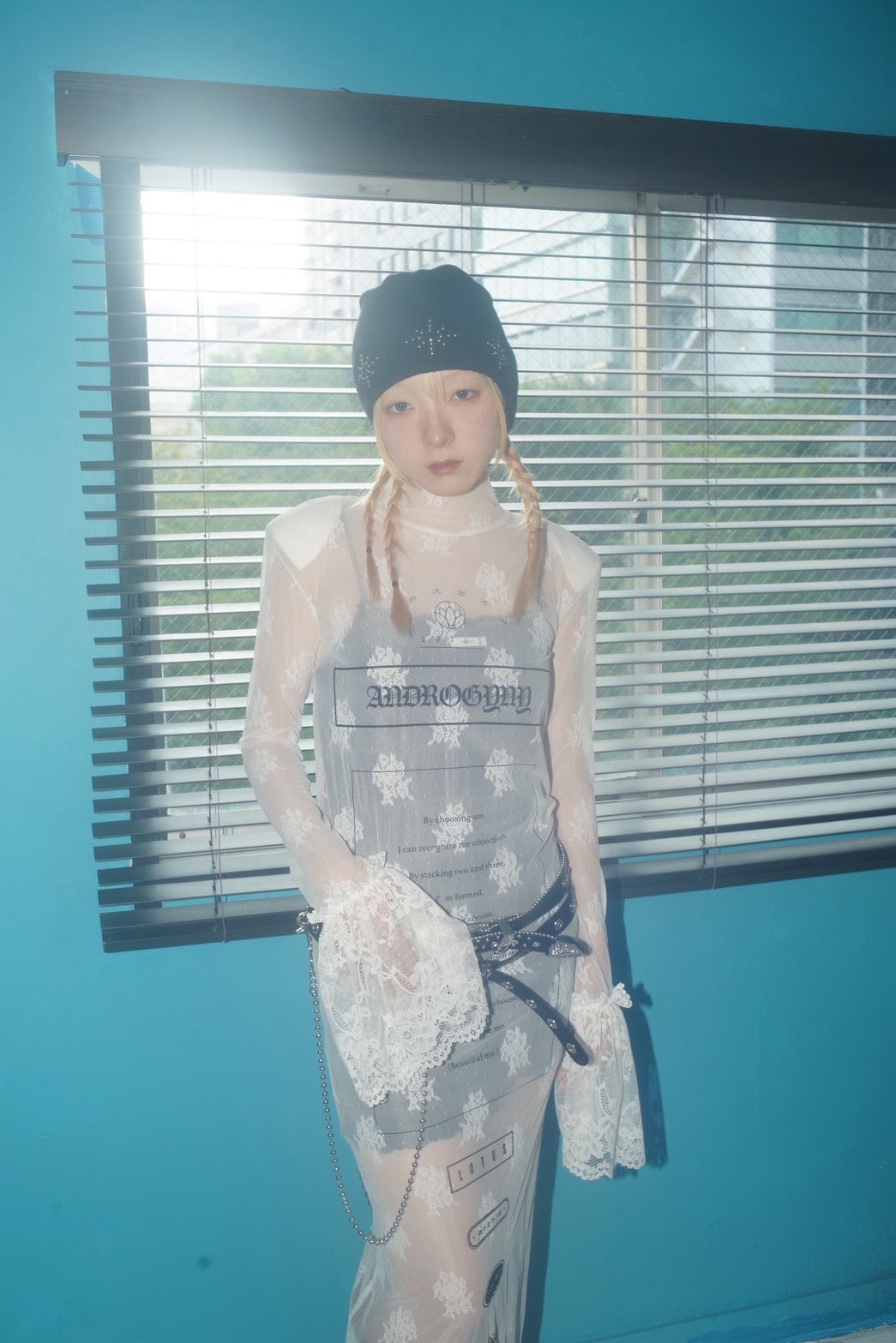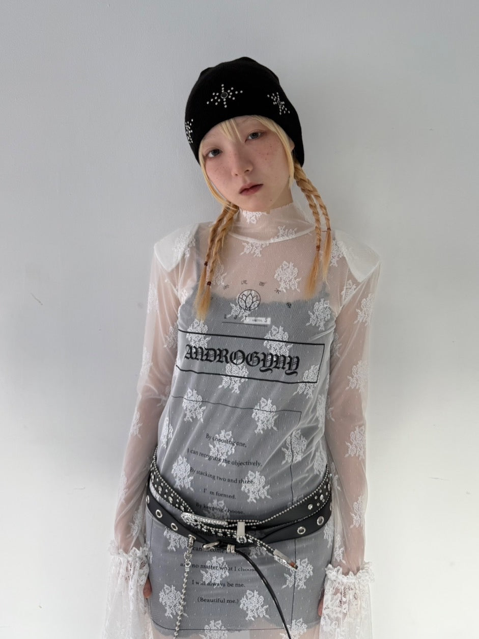 7th Collection"Androgyny"のテーマからイメージを広げたグラフィックが繊細なレース生地と絡み合います。前後どちらを前にしても着用可能。気分やコーディネートに合わせてお楽しみください。