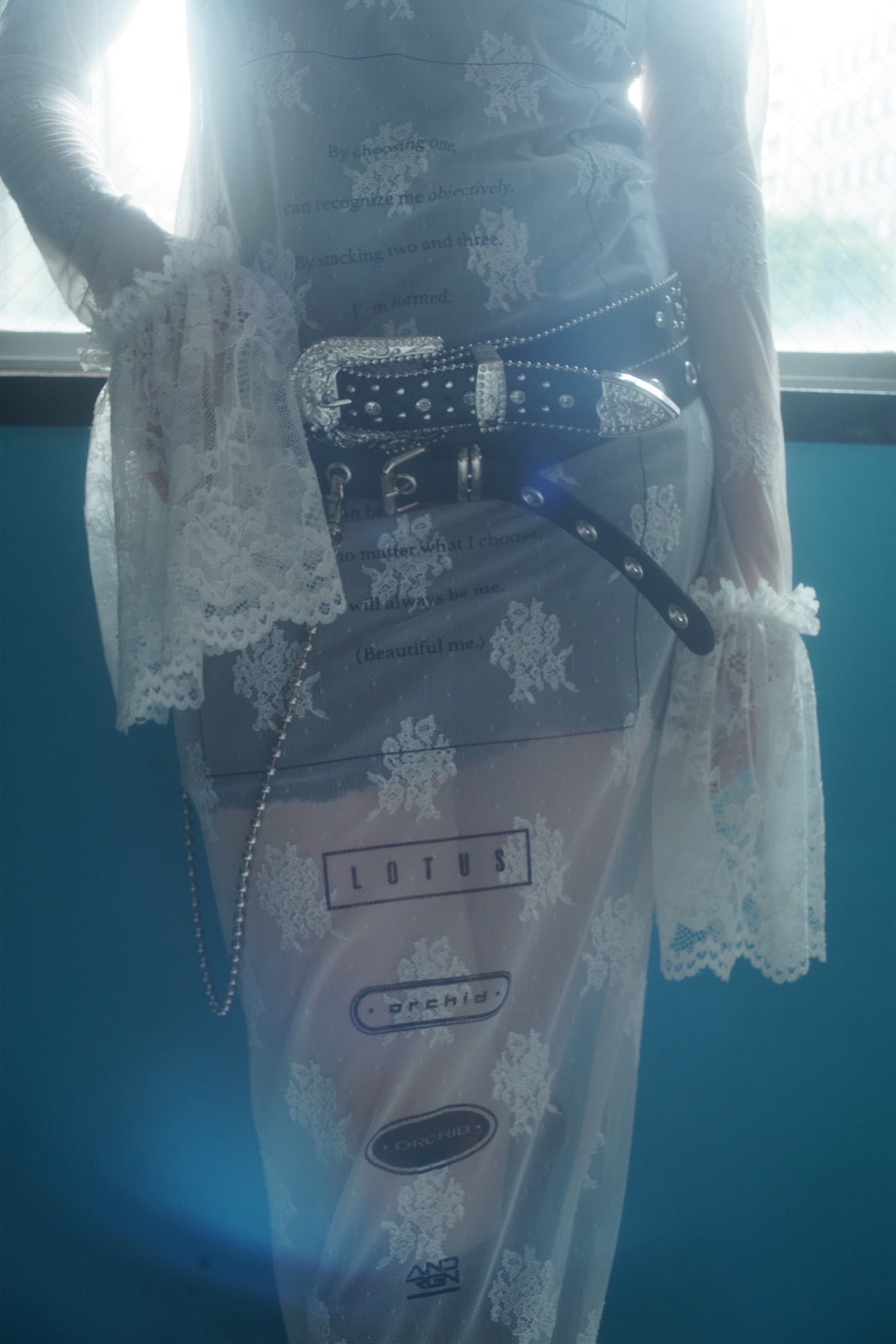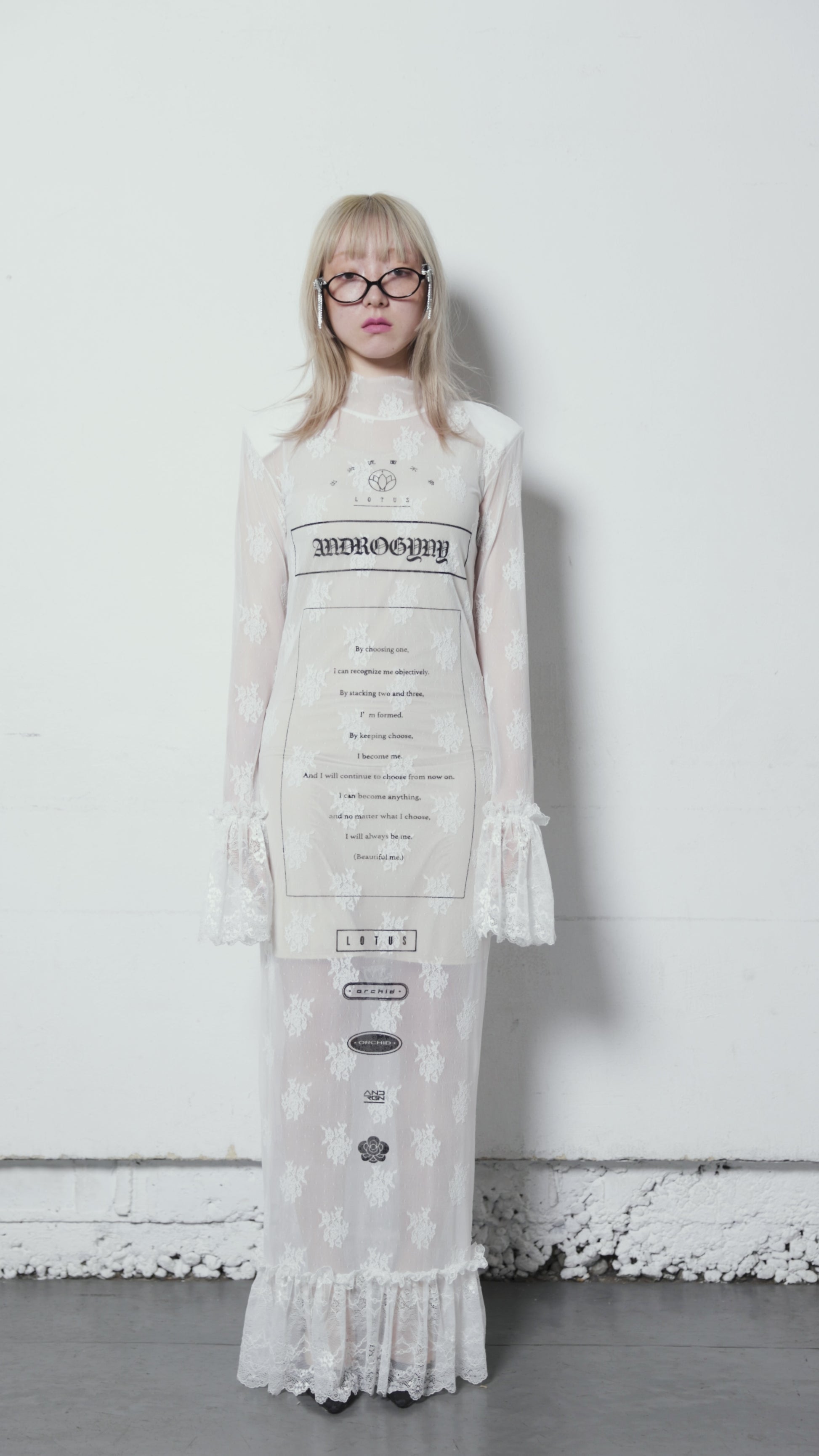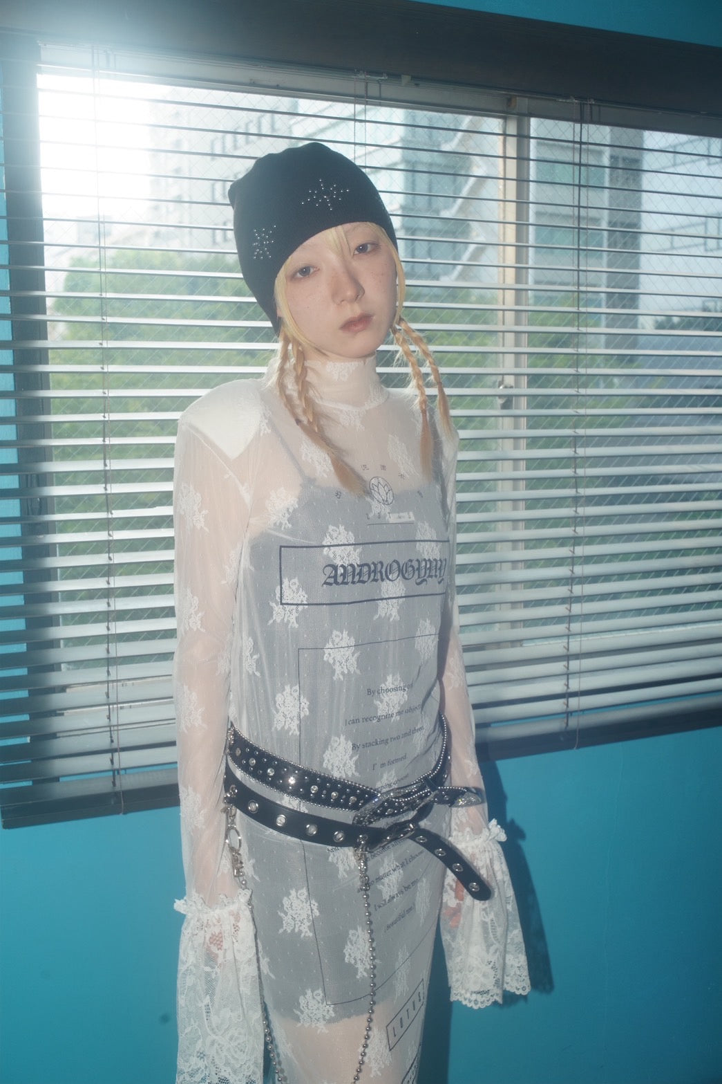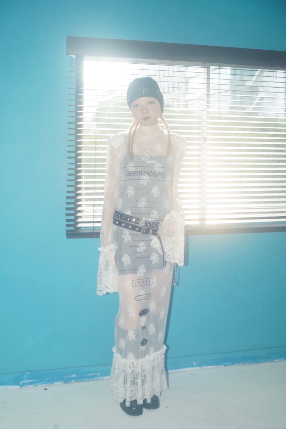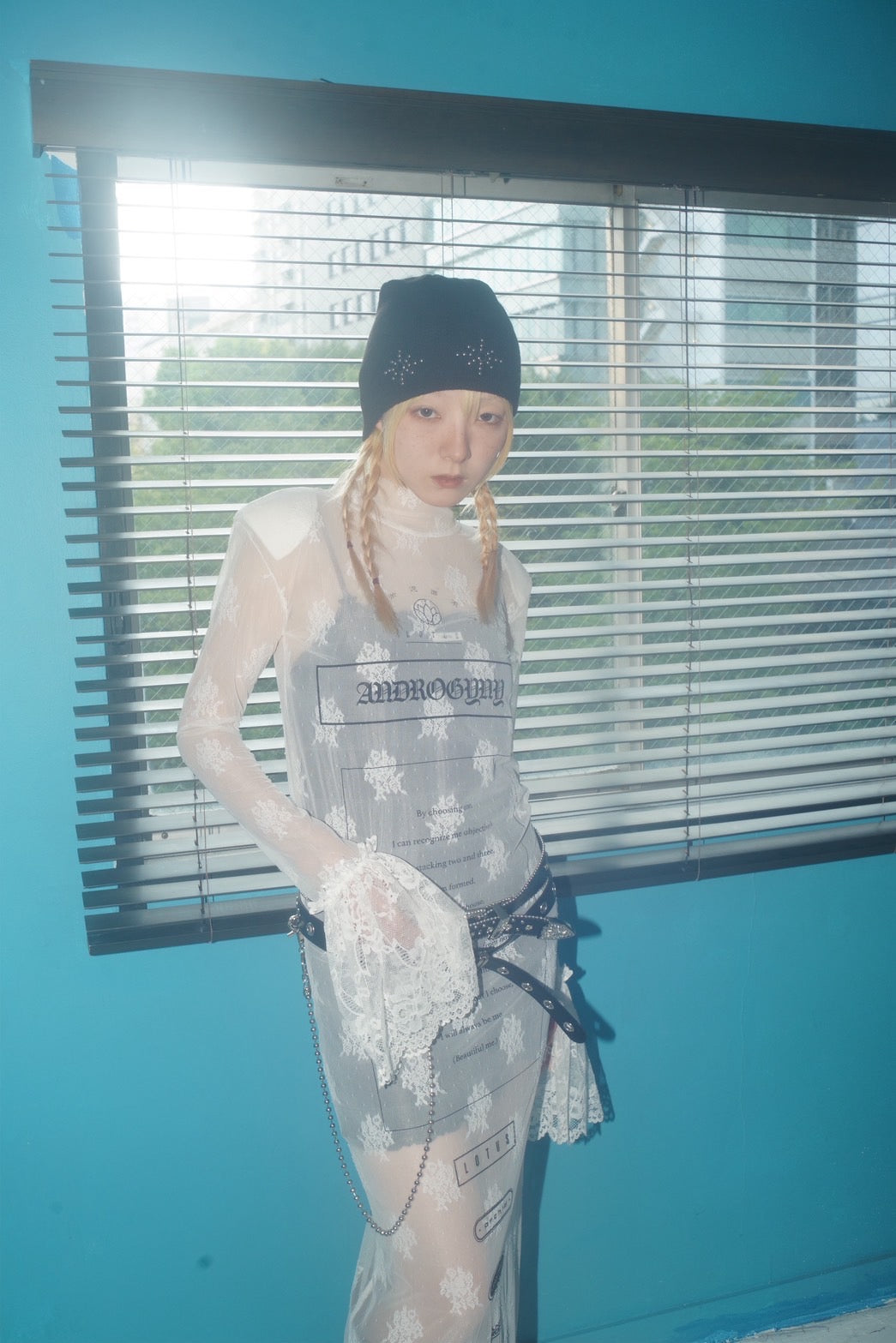 7th Collection"Androgyny"のテーマからイメージを広げたグラフィックが繊細なレース生地と絡み合います。前後どちらを前にしても着用可能。気分やコーディネートに合わせてお楽しみください。