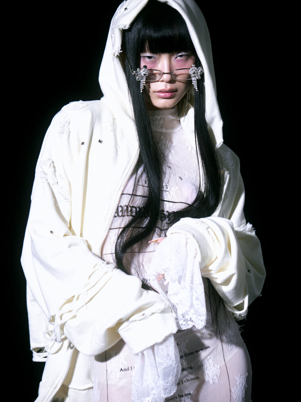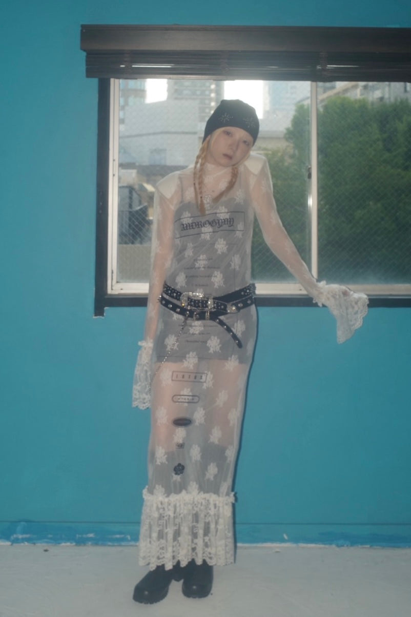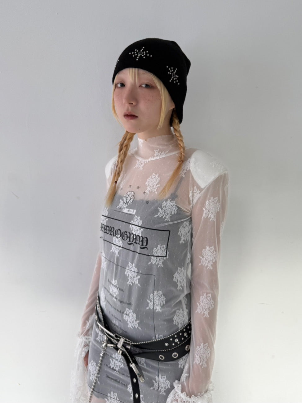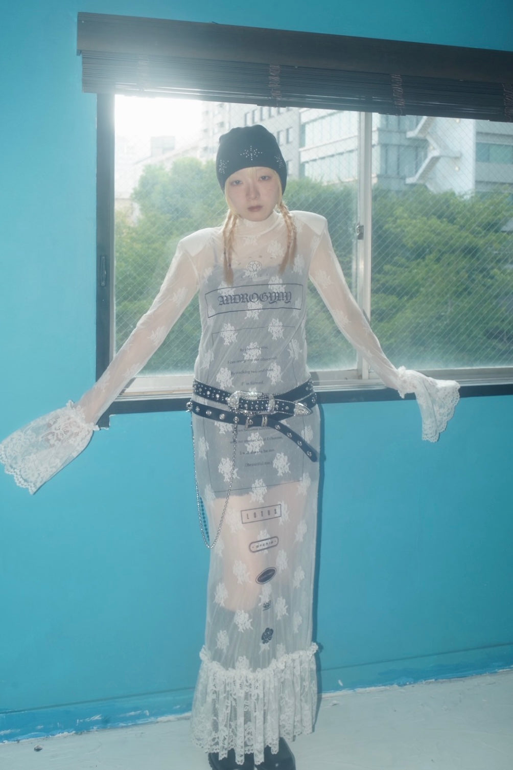 7th Collection"Androgyny"のテーマからイメージを広げたグラフィックが繊細なレース生地と絡み合います。前後どちらを前にしても着用可能。気分やコーディネートに合わせてお楽しみください。