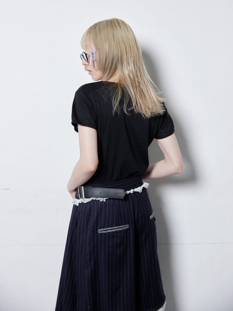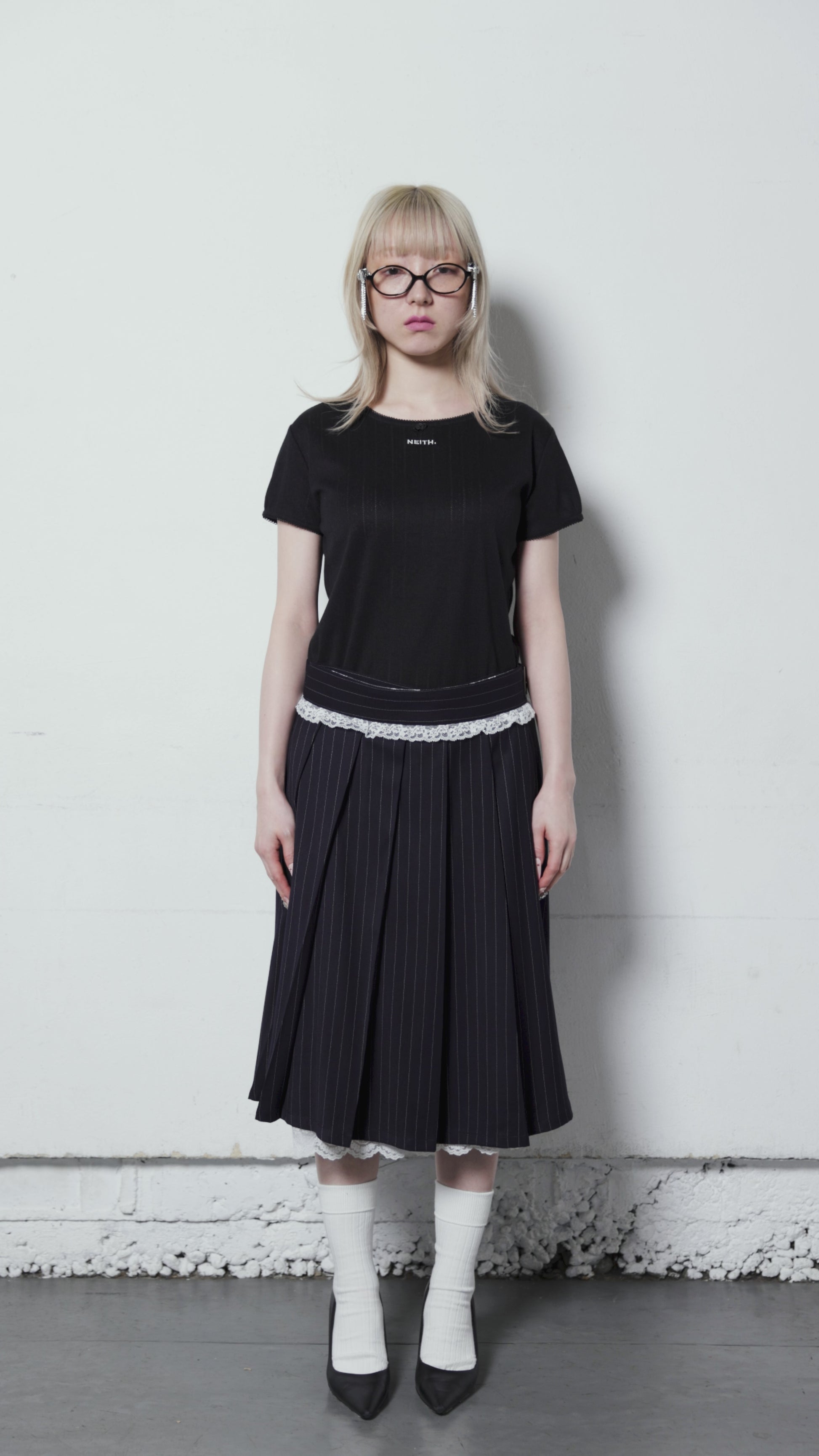 Rose Pleats Skirt Pantsなど、クラシックなボトムに合わせるのがおすすめです。クリーンな印象のスタイリングに仕上がります。