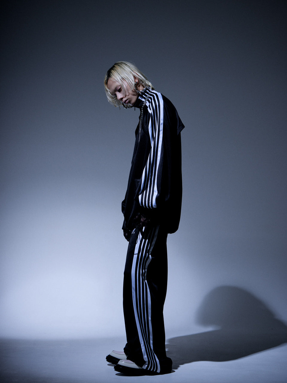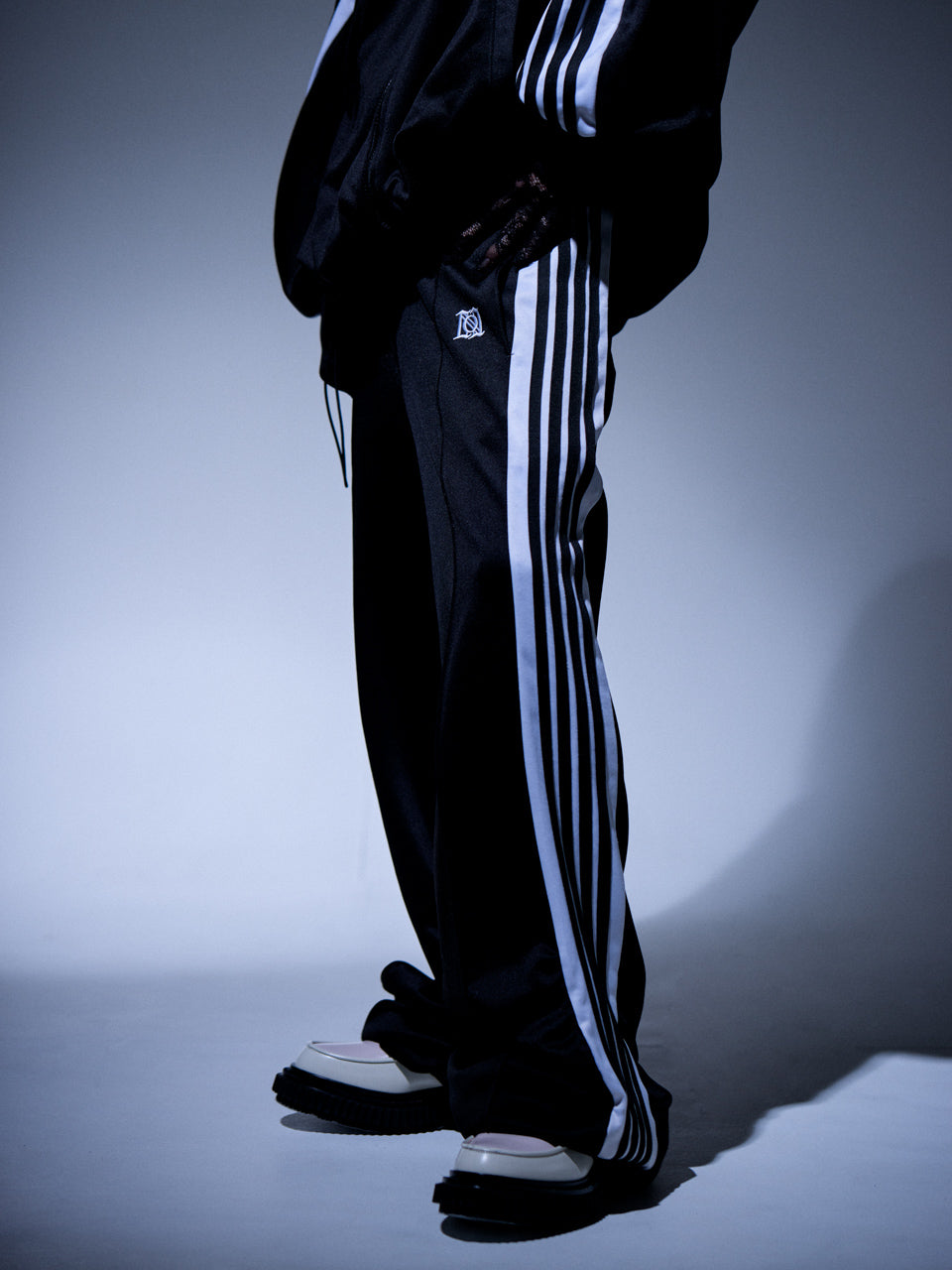 見事におしゃれなファッションアイテムとして仕上がったトラックパンツにはピンヒールがおすすめ。ボリュームのあるスニーカーでもおしゃれです。