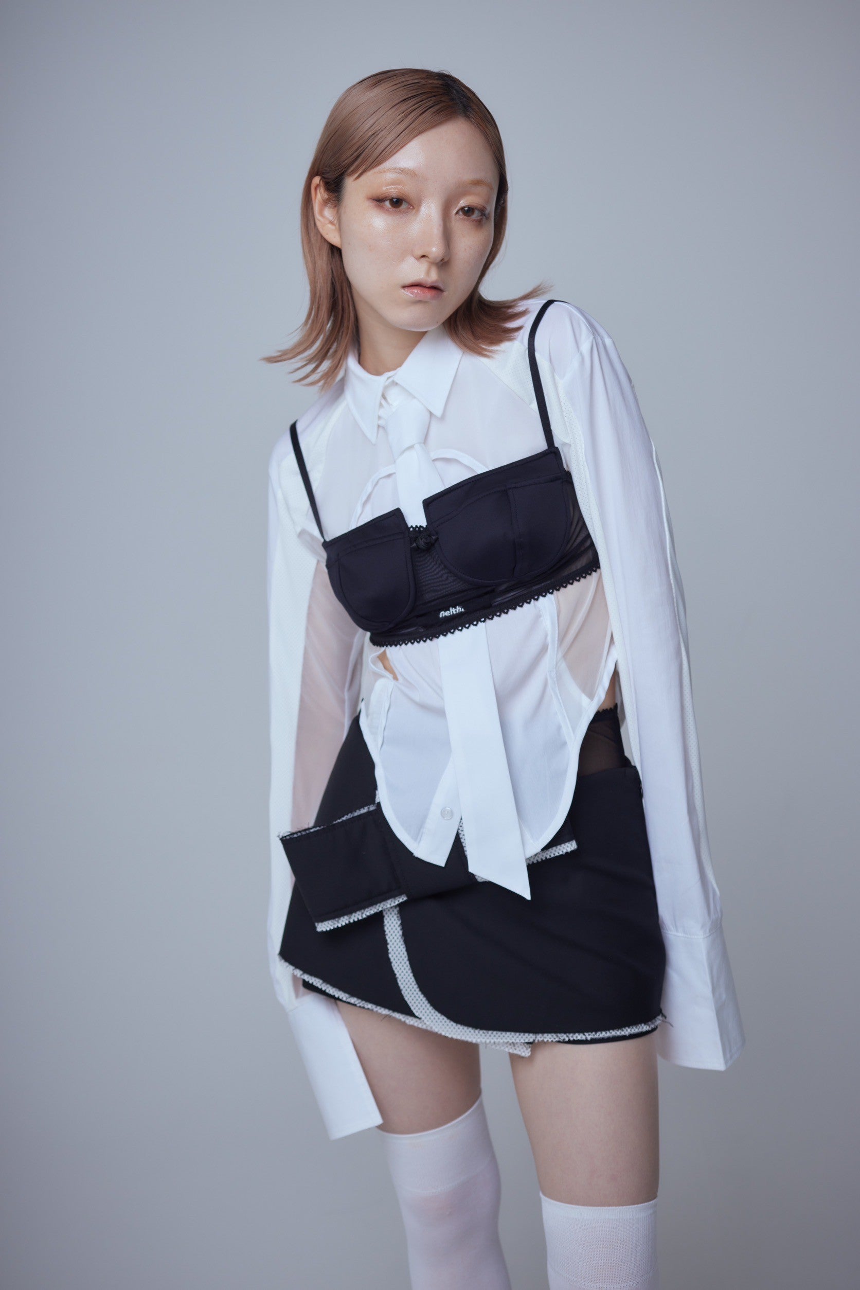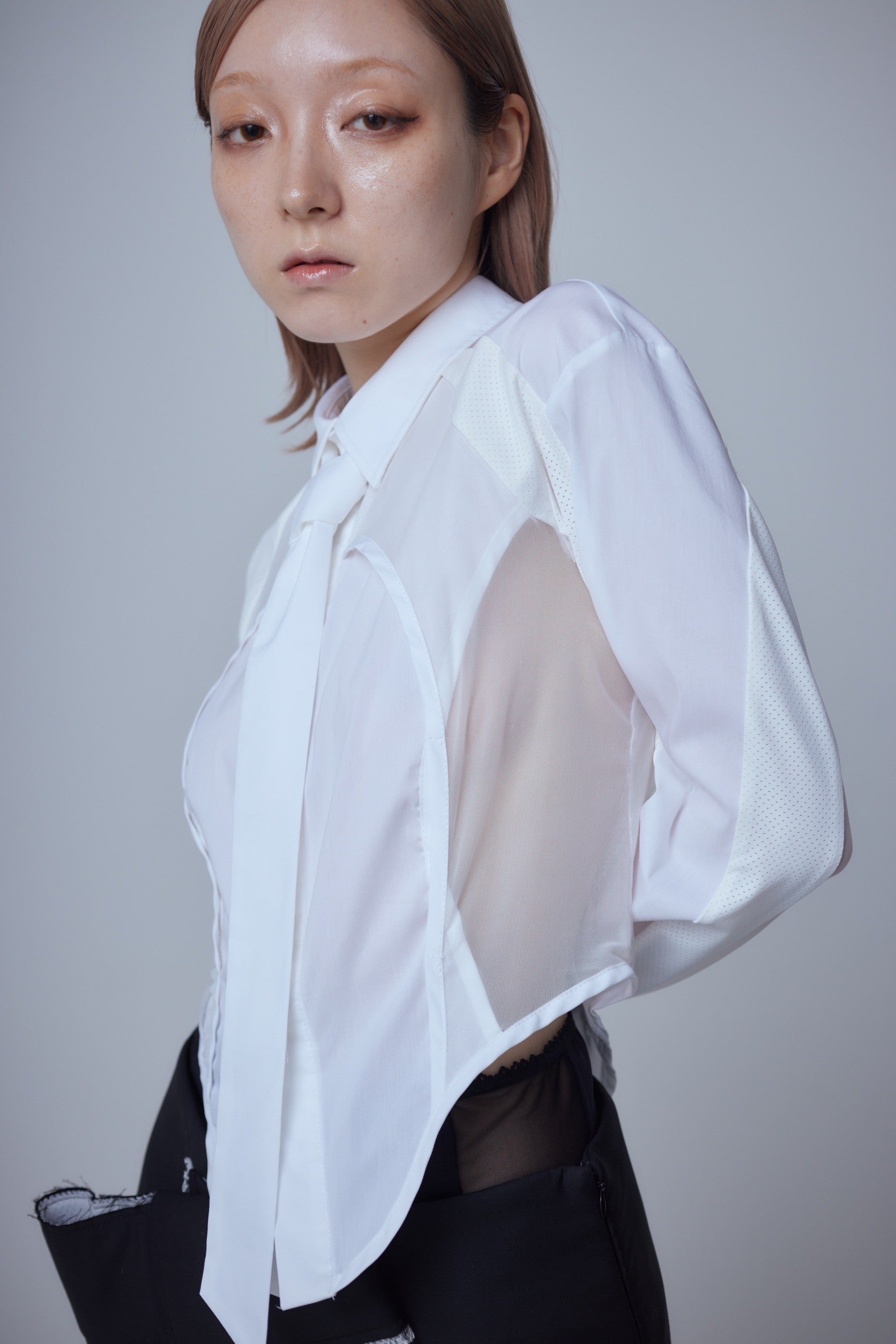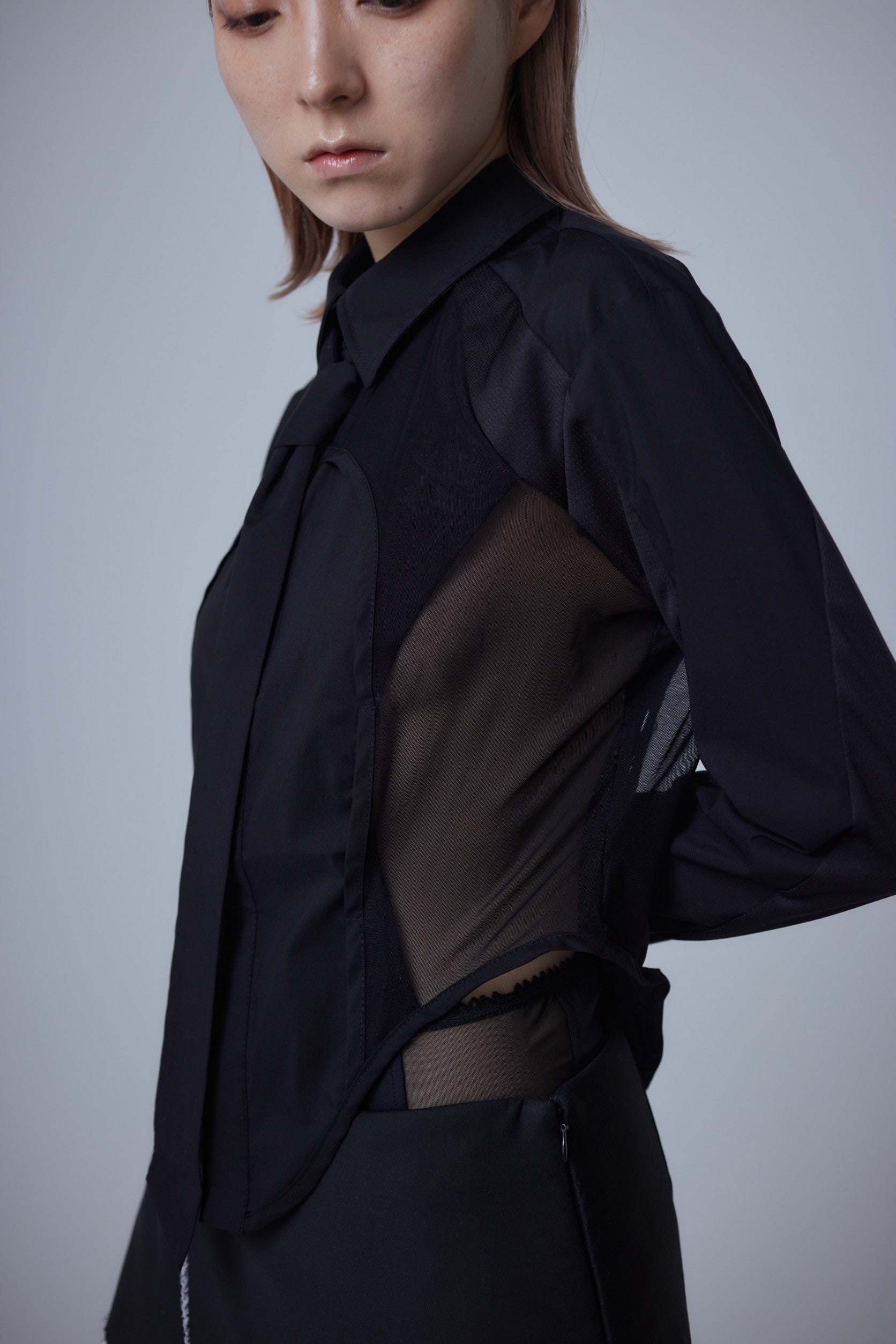 伸縮性に優れたポリエステルスムースとシアーなメッシュのコンビネーション。