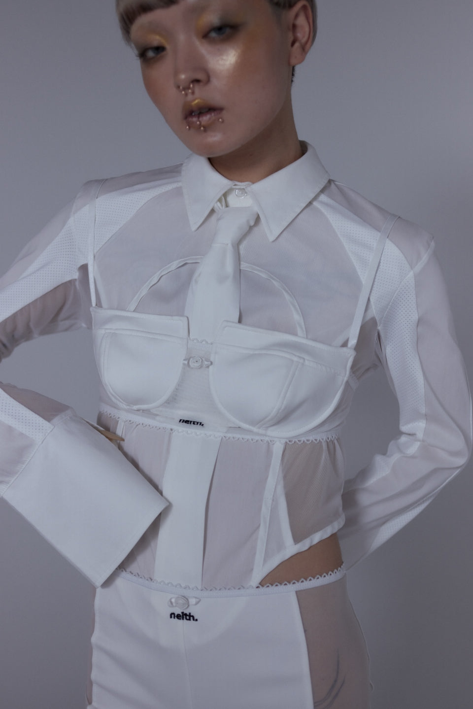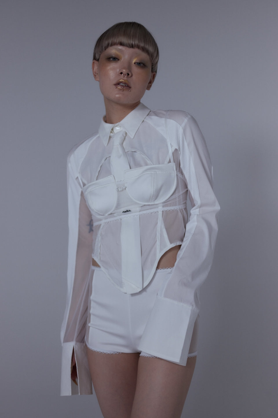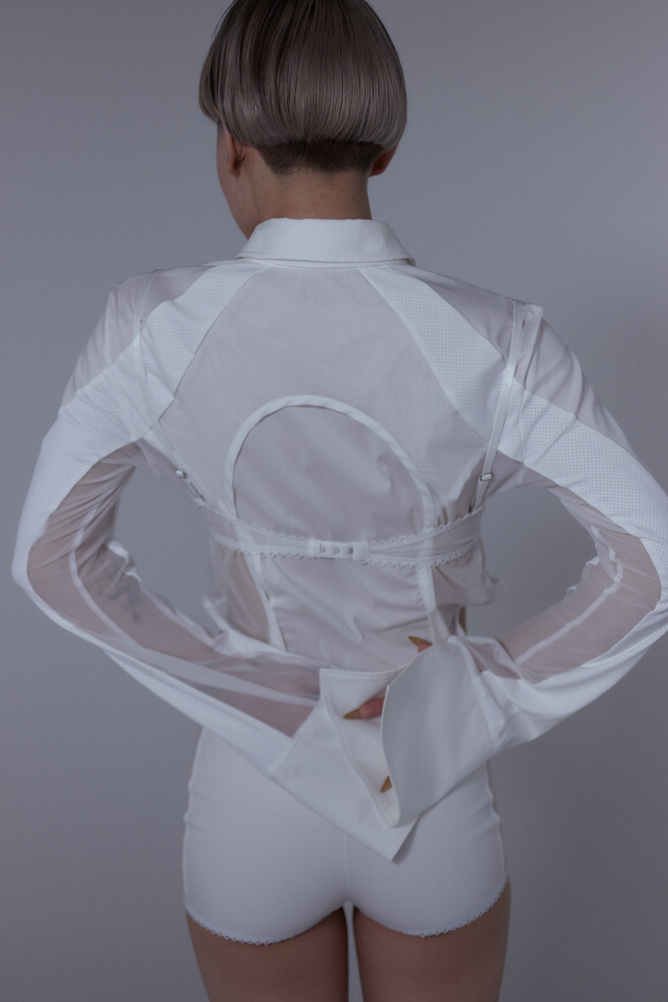 伸縮性に優れたポリエステルスムースとシアーなメッシュのコンビネーション。