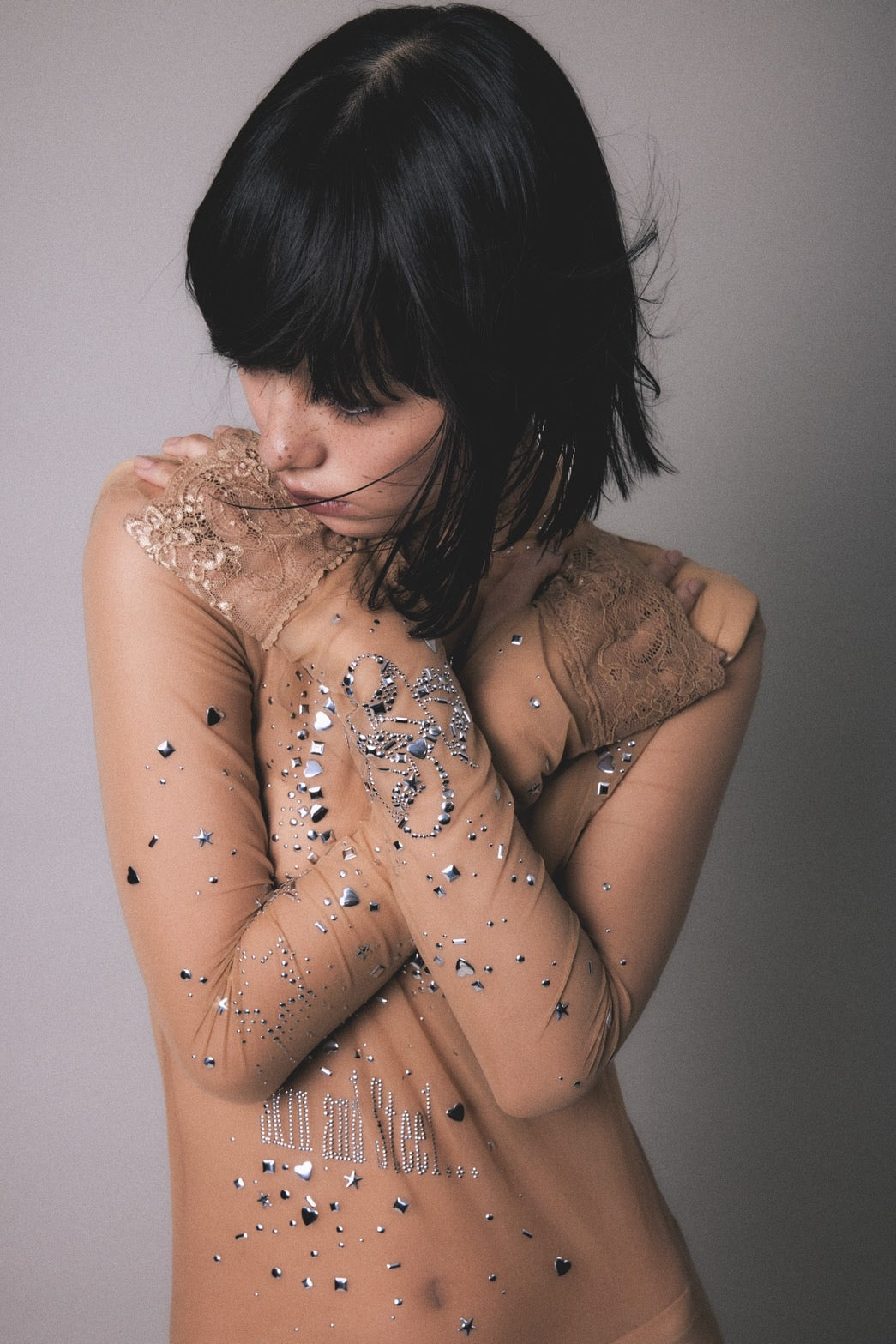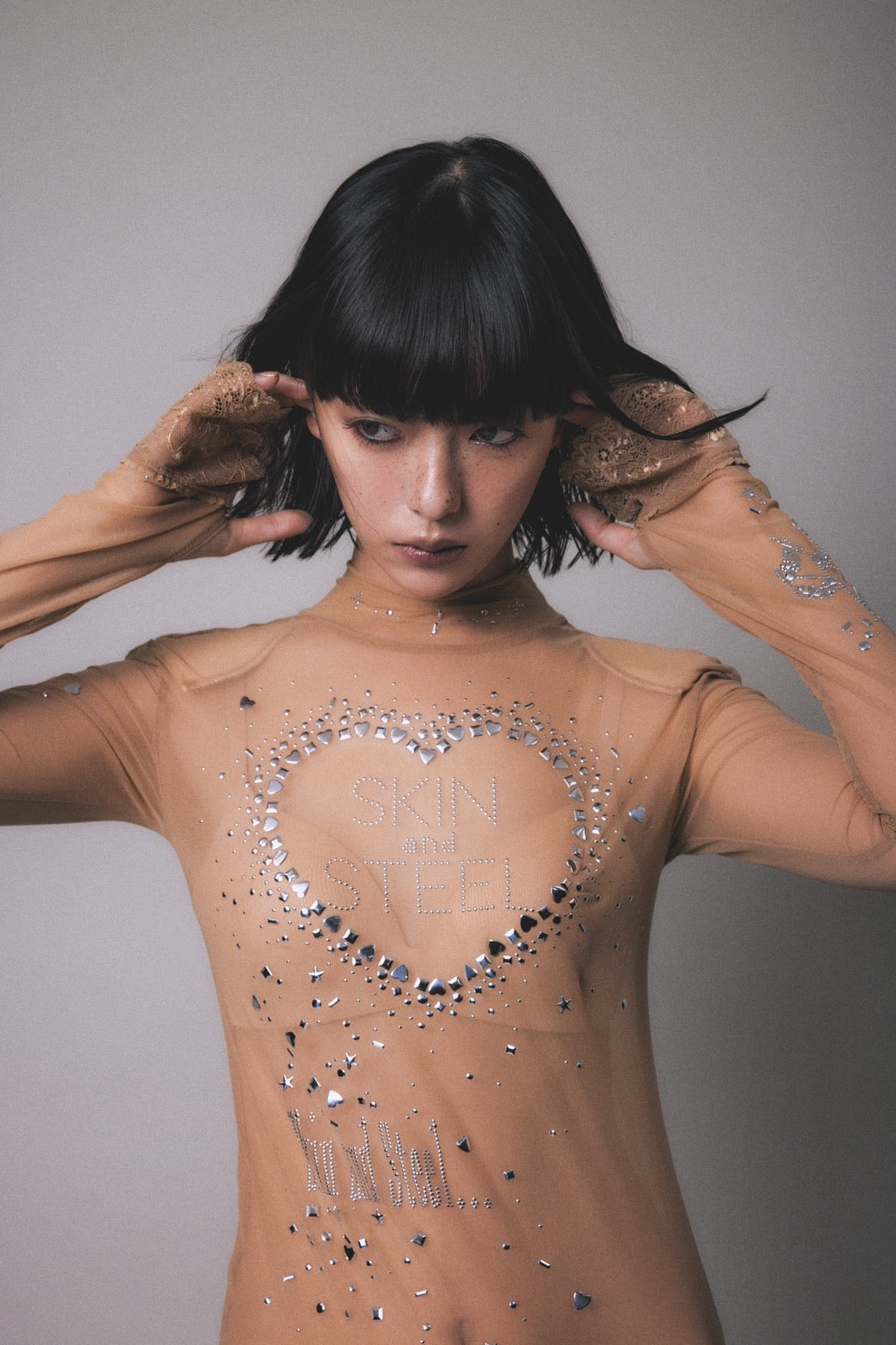 ・名前の通り"セカンドスキン"となるような繊細な素材に、様メタリックなホットフィックス加工をふんだんに散りばめた、まさに今季のテーマにぴったりの贅沢な一点