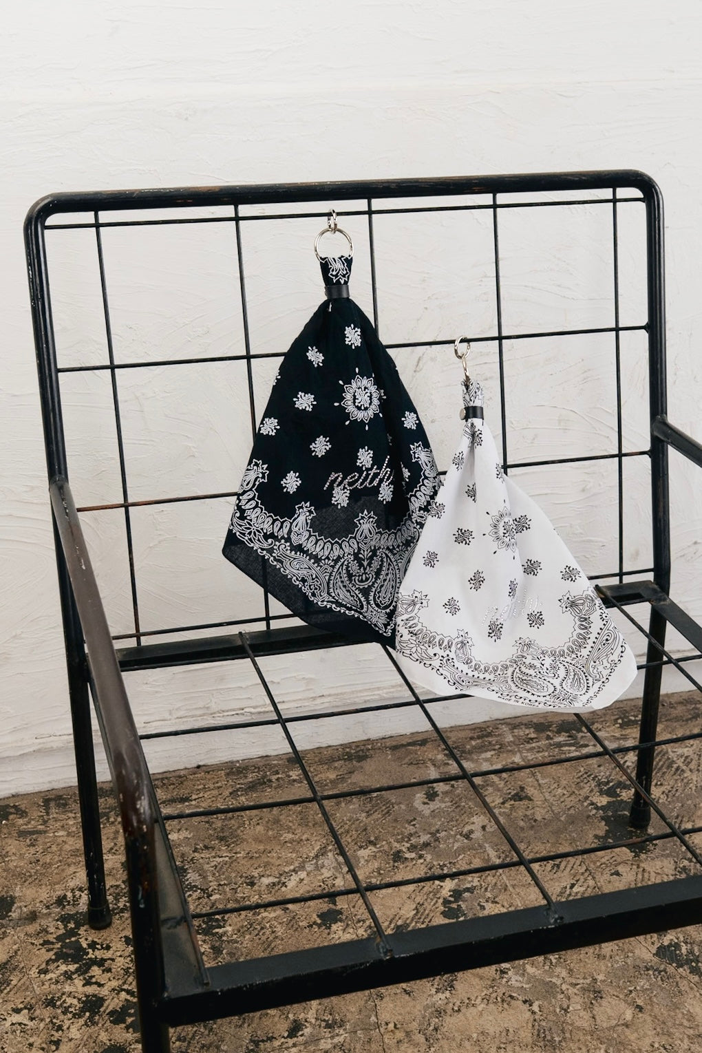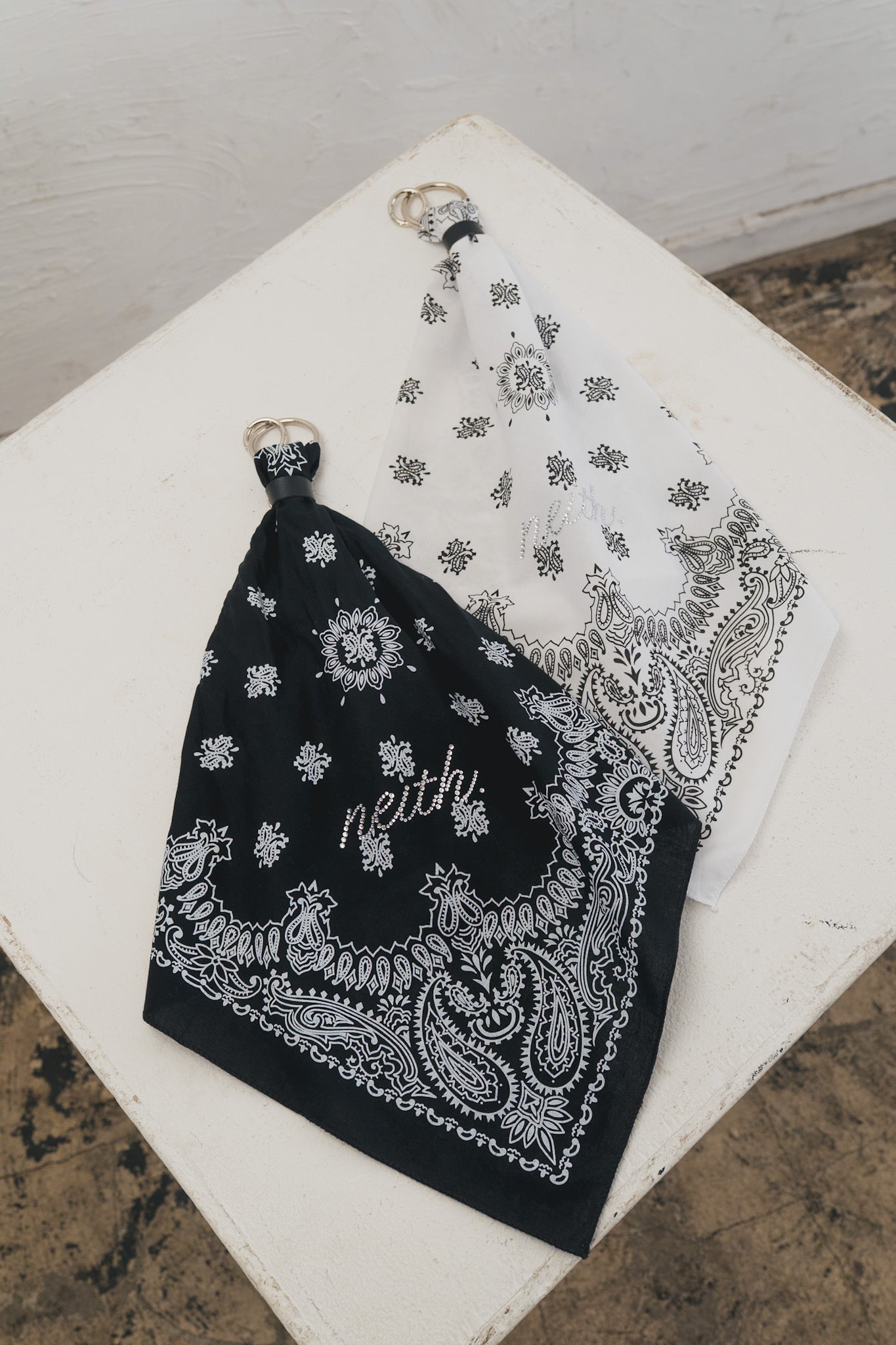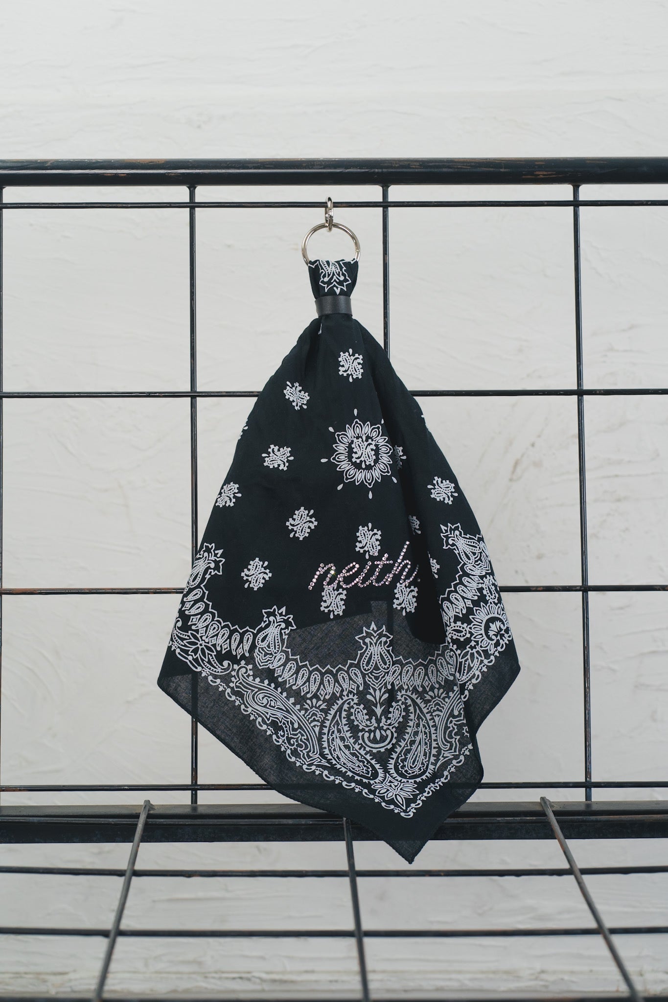 モノトーンのバンダナにneith.のラインストーンロゴを配し、キーチャームに仕上げました。