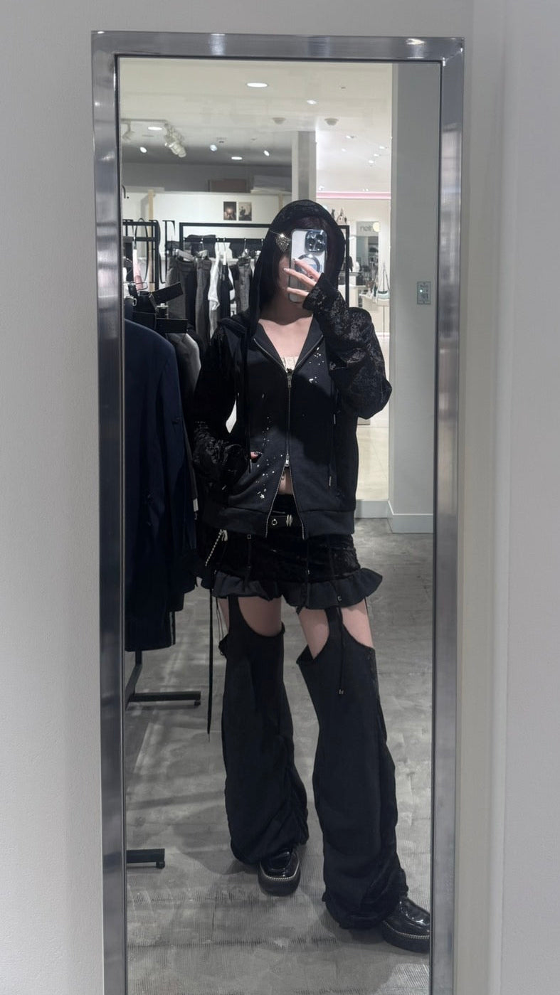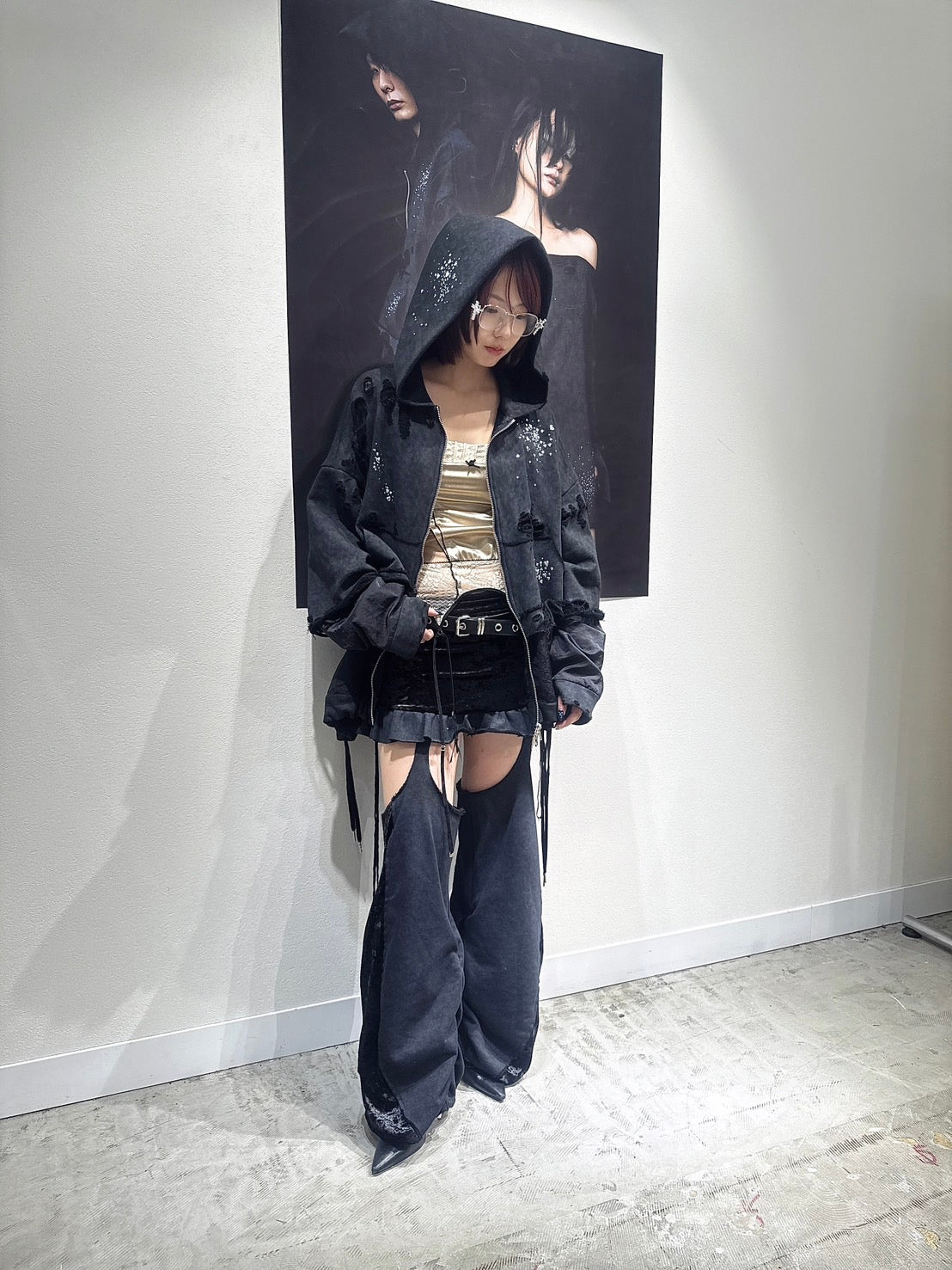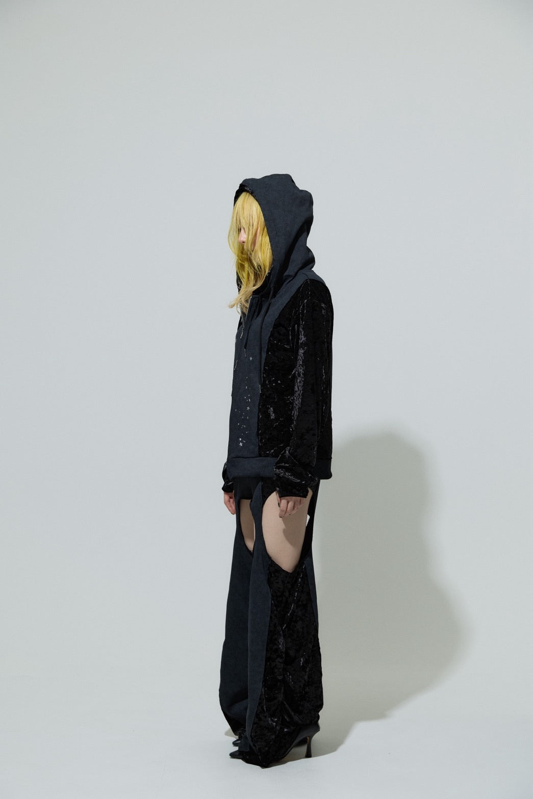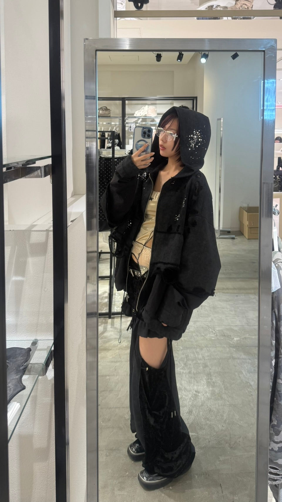 ・ヴィンテージ加工が施されたグランジ感のある裏毛生地と煌めくクラッシュベロアのギャップがポイント