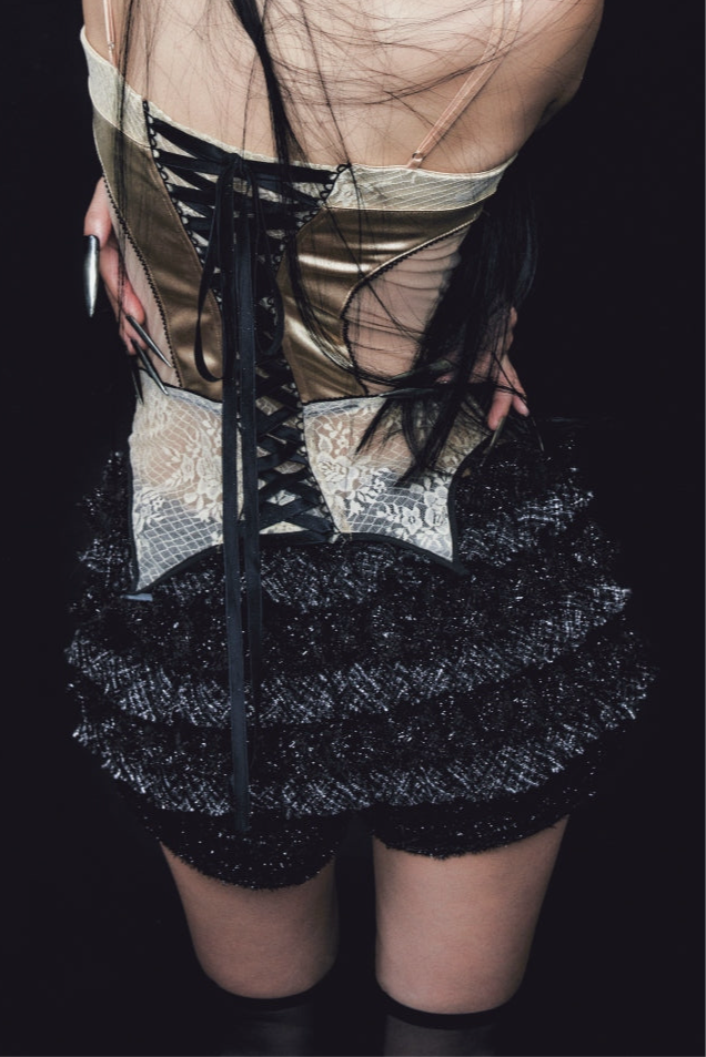 ・バックスタイルはたっぷりのフリルを重ね、すっきりとしたとしたフロントスタイルとのギャップがポイント